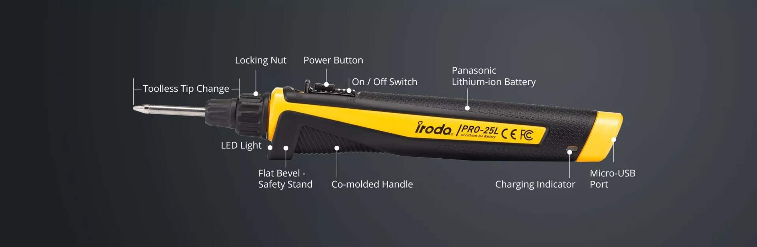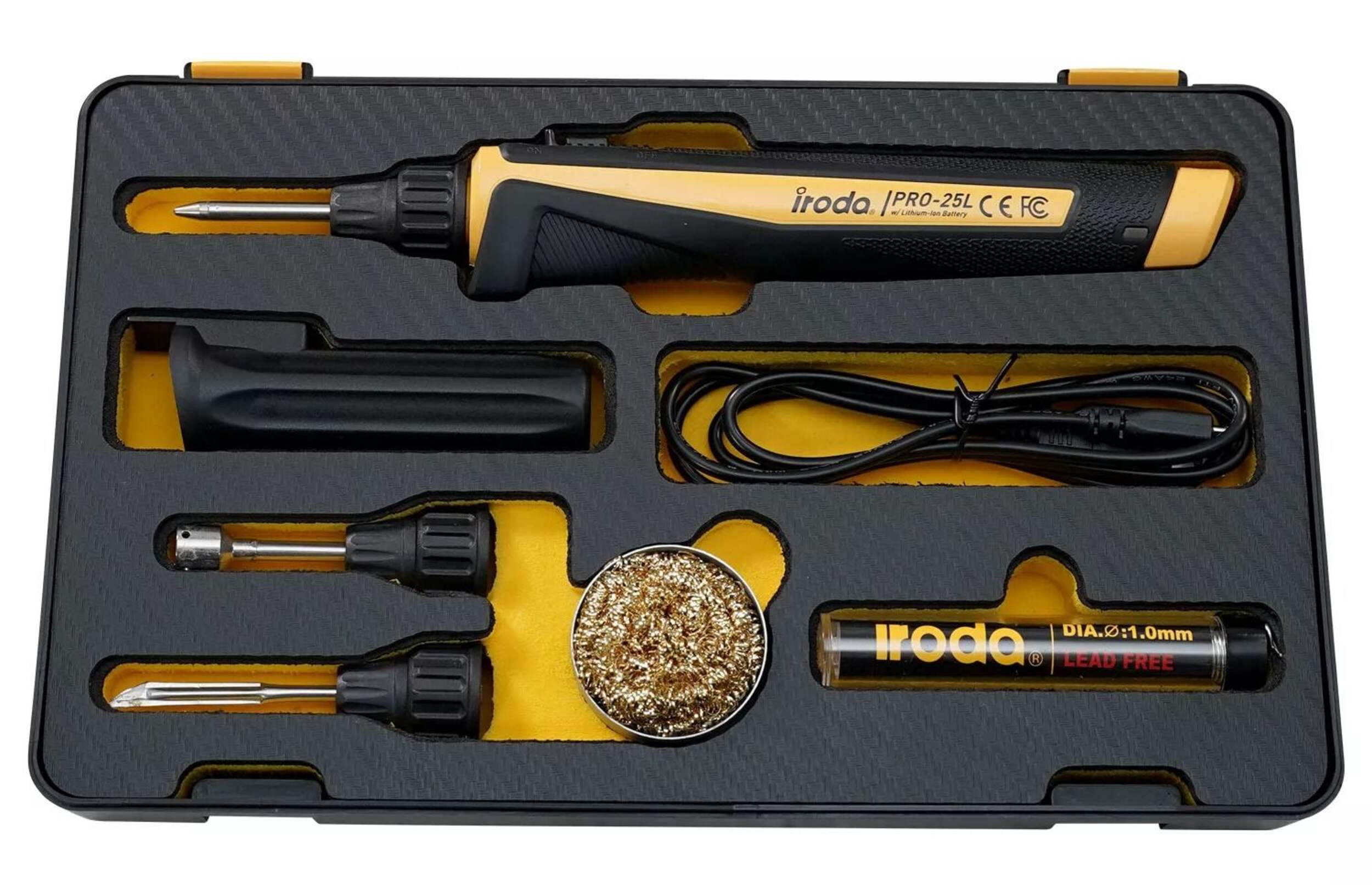 Iroda PRO-25L is a high efficiency multi-function portable soldering iron with a high capacity rechargeable Lithium-Ion-Battery. It features a rubberized ergonomic design and built in stand. This model delivers precise temperature control and a range of tips are available to make it an extremely versatile portable heat tool. Ideal for quick repairs of circuit boards and electronics, at home, in the car or in the field. This model heats up rapidly and is a durable non slip design that is perfect for service technicians and serious DIY enthusiasts.