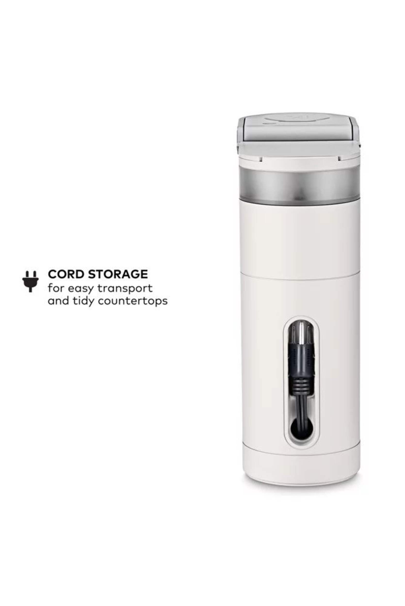 CORD STORAGE: For easy transport and tidy countertops