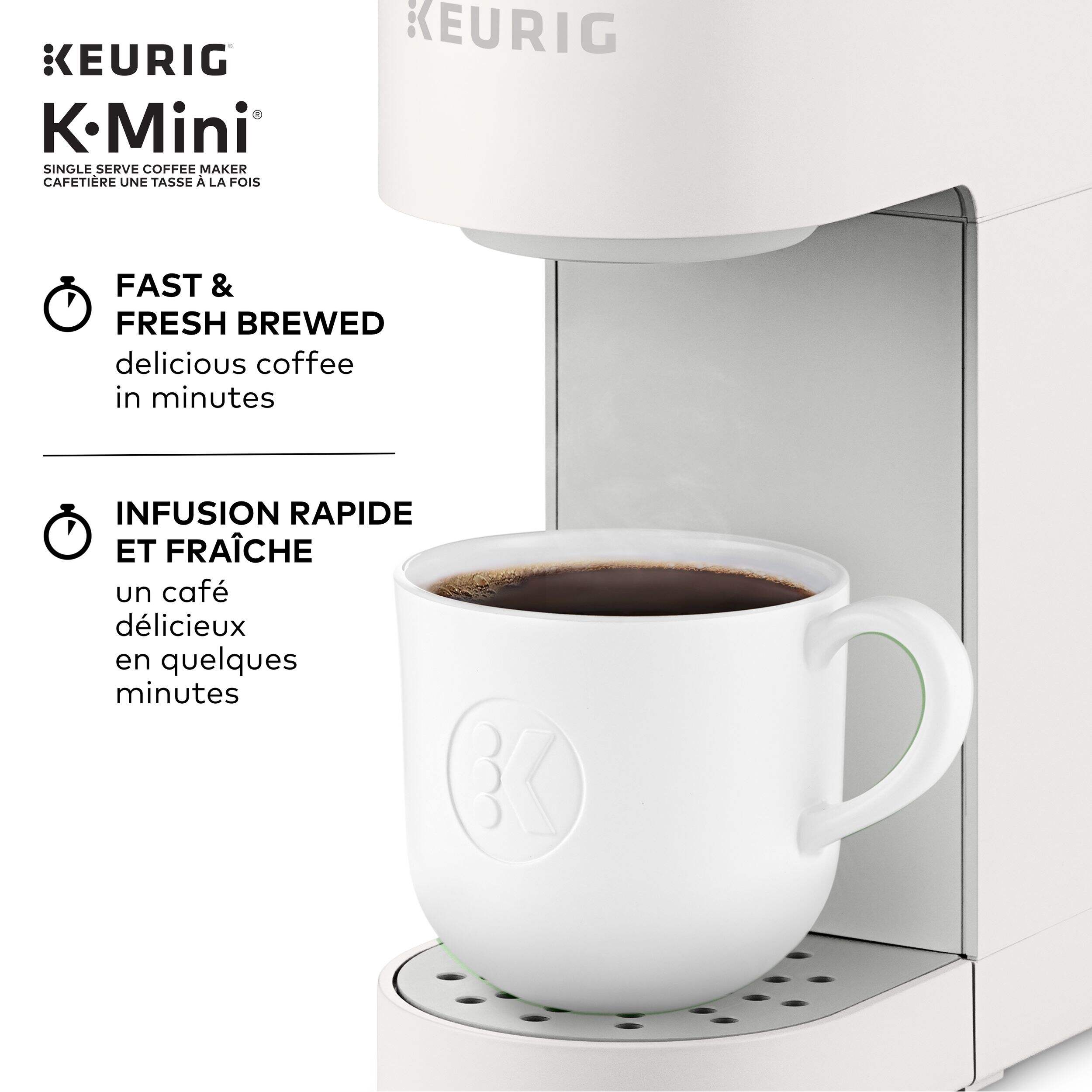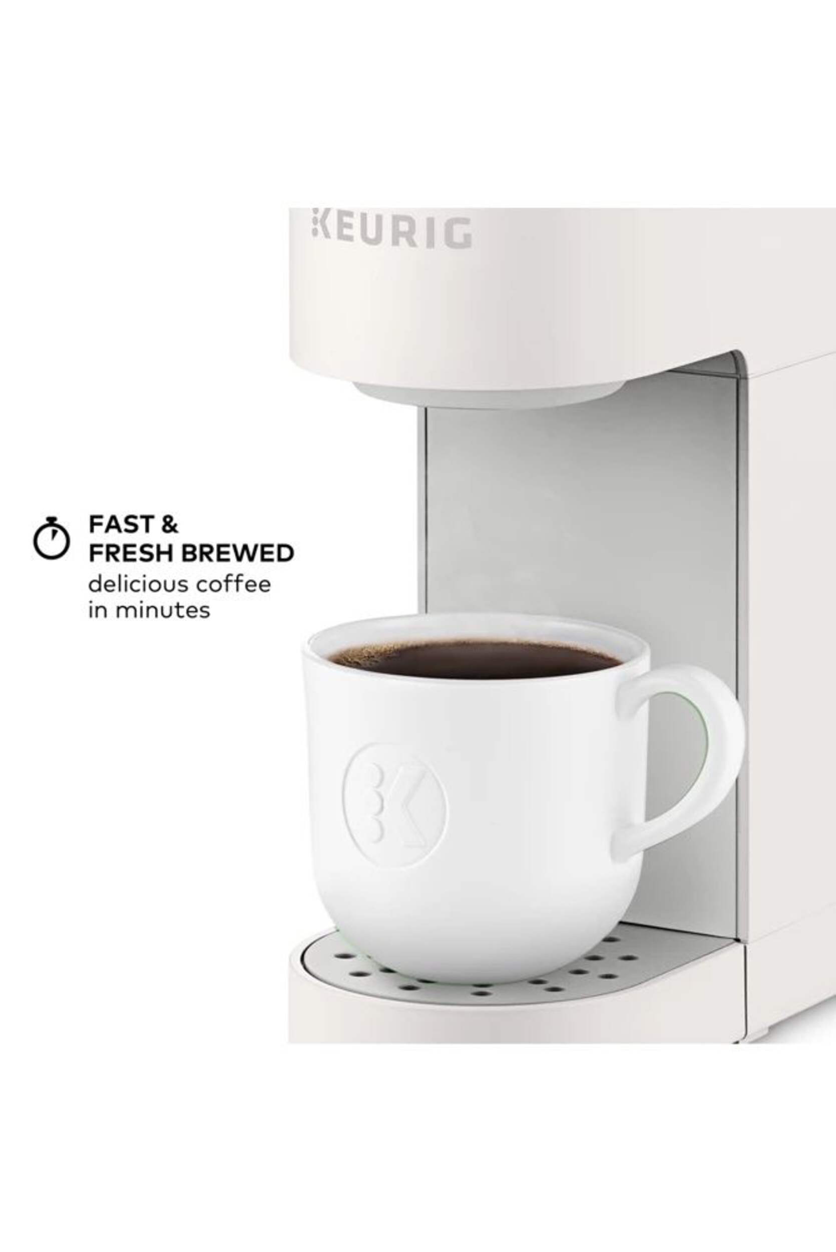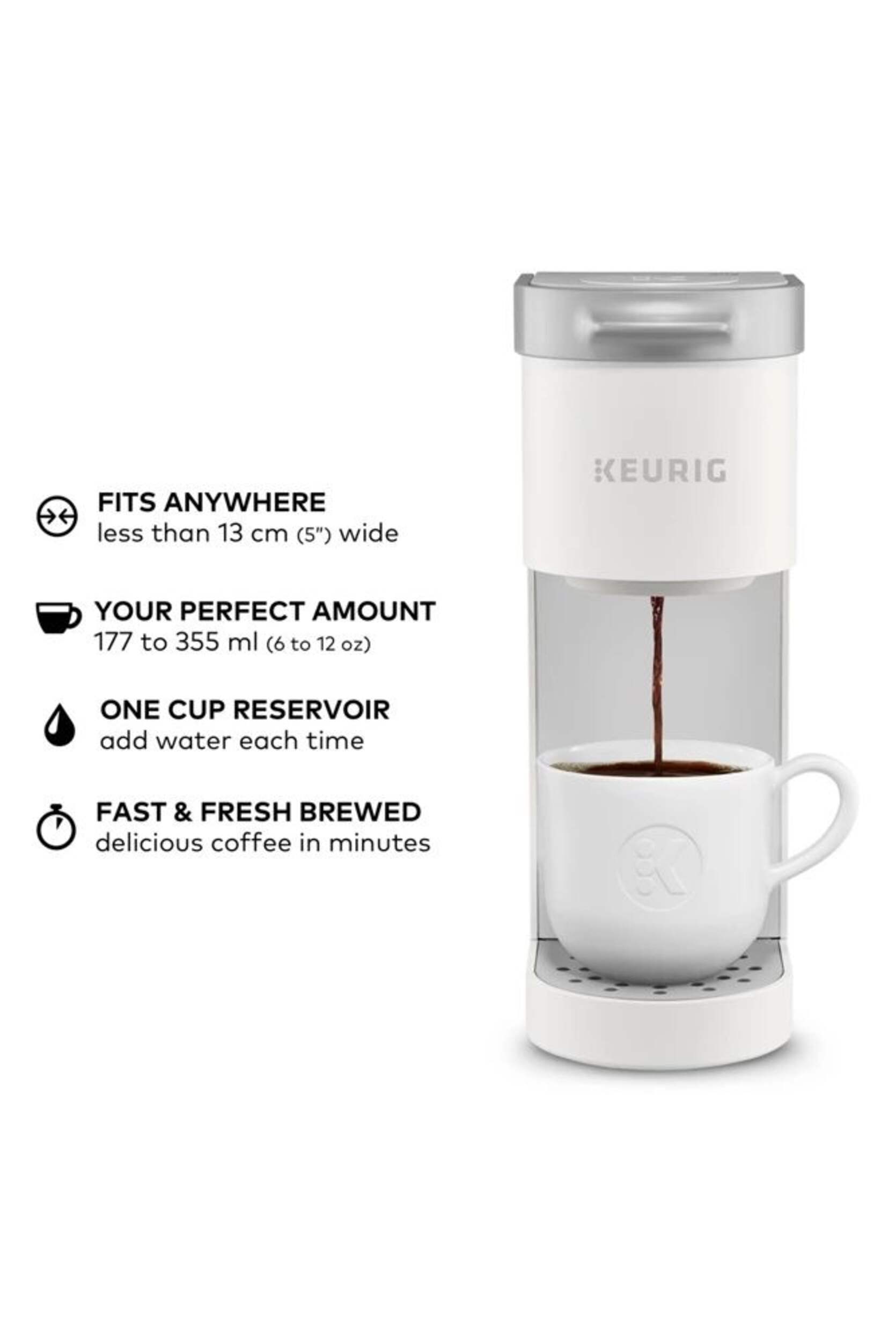 The Keurig® K-Mini™ single serve coffee maker features a new sleek design, and at less than 13 cm (5 in) wide is the perfect size for any space or occasion. The K-Mini™ coffee maker is effortlessly simple to use - just add fresh water to the reservoir, pop in your favourite K-Cup® pod, press the brew button and enjoy fresh brewed, delicious coffee in minutes. Choose from hundreds of delicious K-Cup® pod varieties to enjoy 177-355 ml (6-12oz) of your favourite coffee, tea, cocoa, and iced beverages. With a single cup reservoir and cord storage, the K-Mini™ coffee maker is the portable coffee maker that makes anywhere perfect for great coffee.