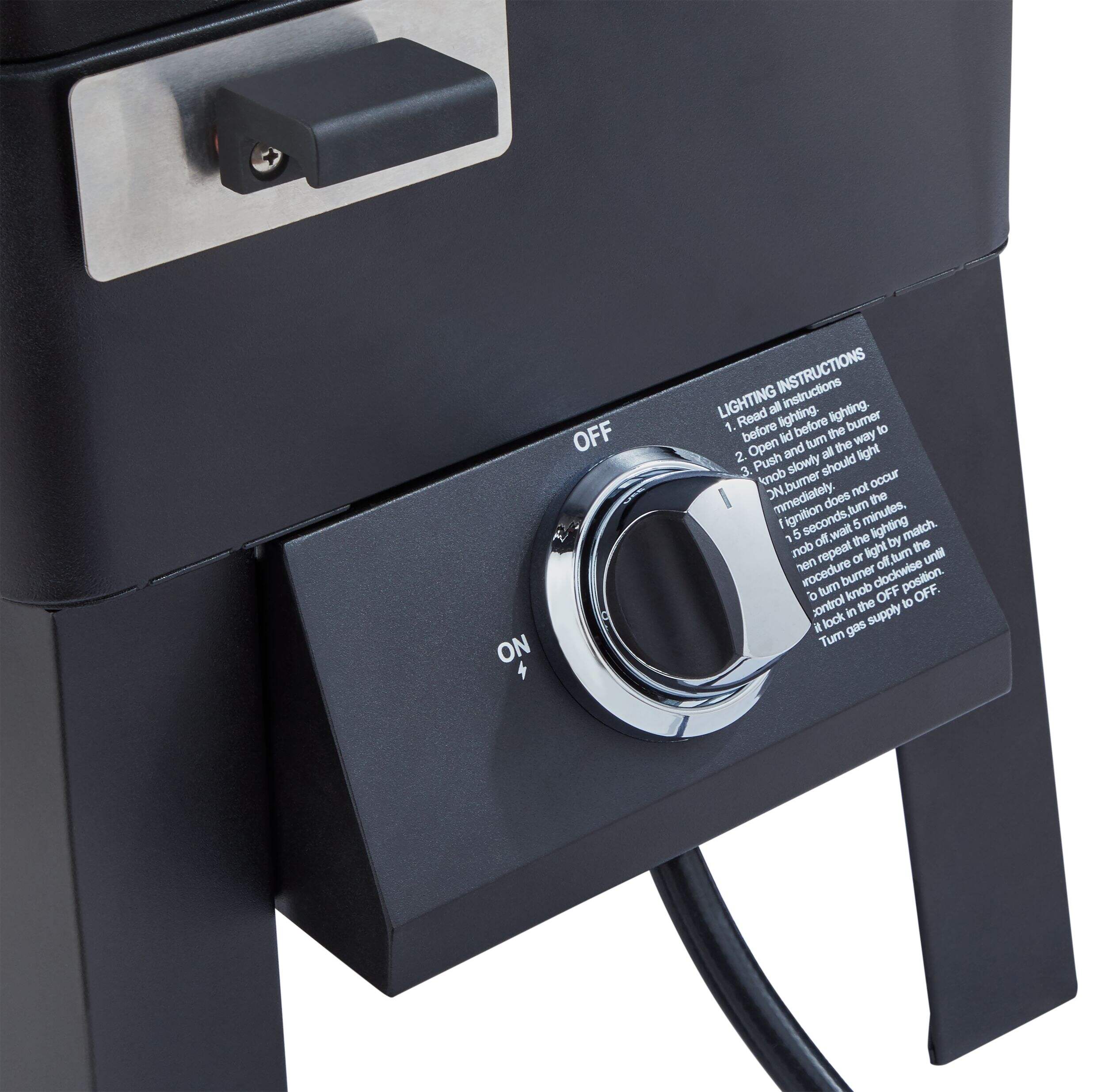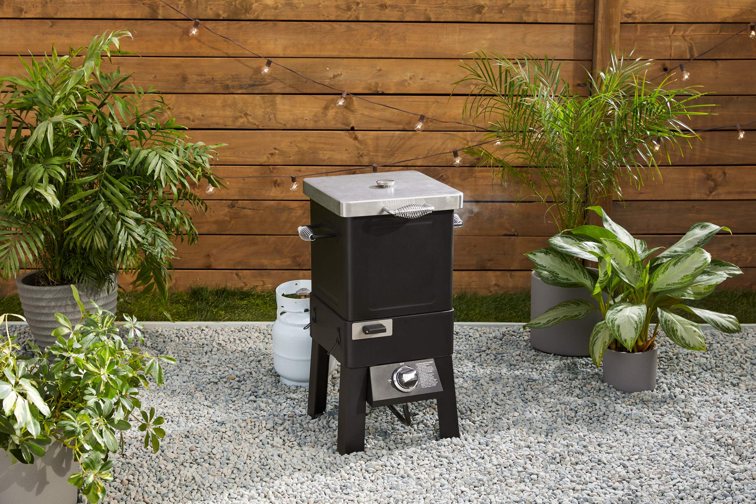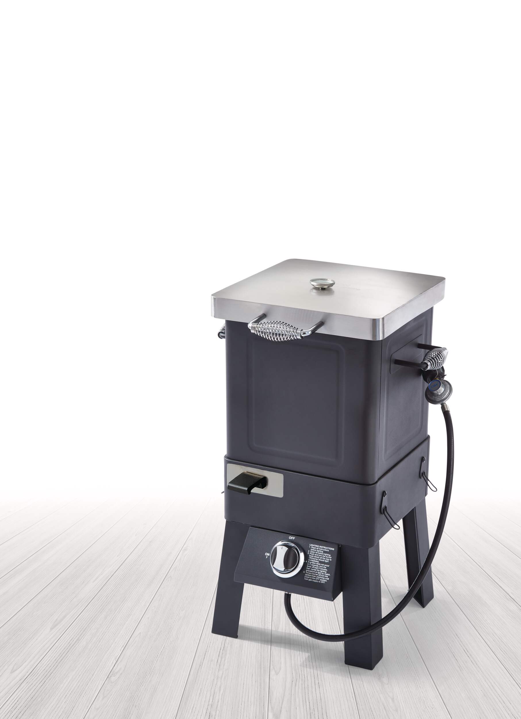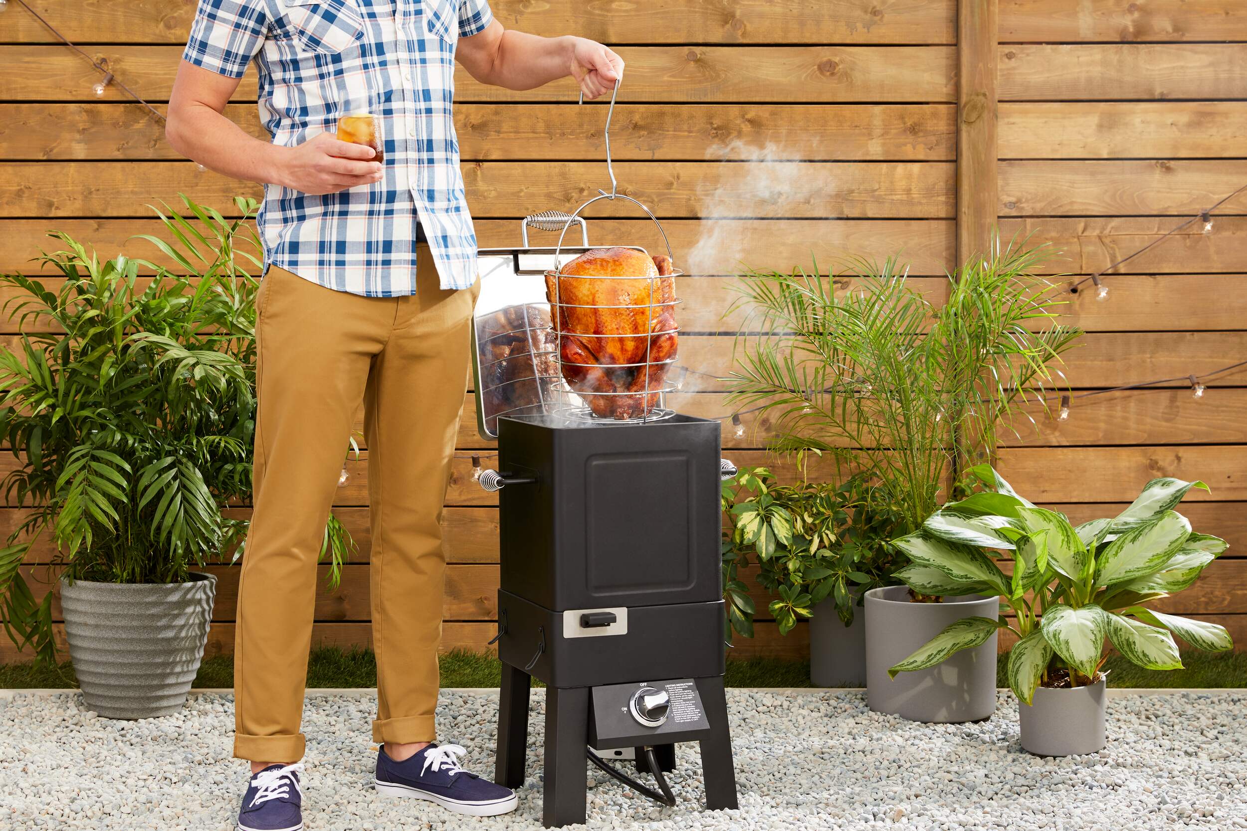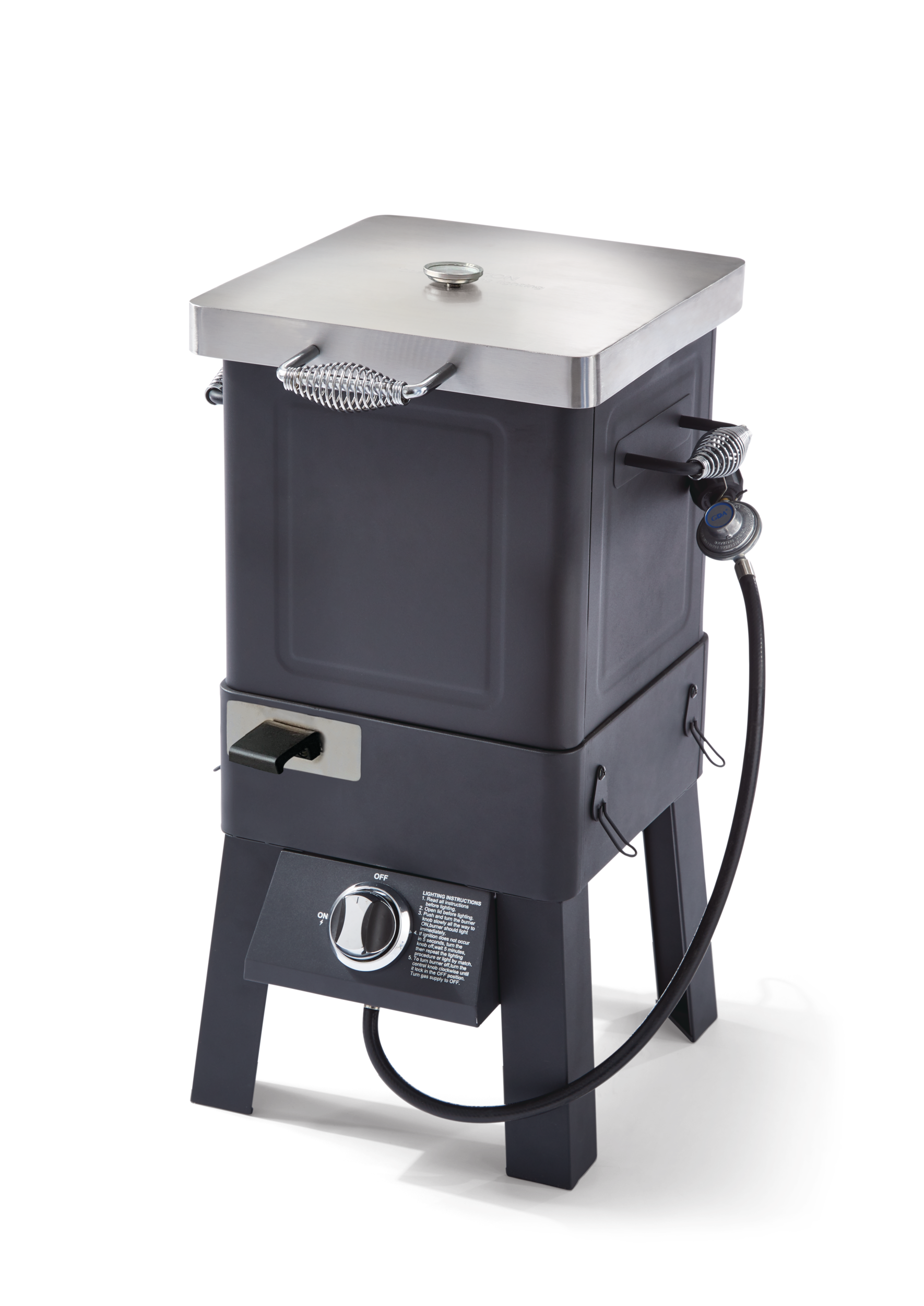 Enjoy oil-less frying with the MASTER Chef Outdoor 3-in-1 Outdoor Cooker. A marvel of cooking technology, this propane deep fryer is perfect for smoking and roasting your meats. For fans of poultry and fowl, the metal cage is capable of holding a turkey of up to 20 lbs. More adventurous grillers will be impressed by the built-in wood chip box for smoking, which lets you infuse a variety of flavour options into your food. With a heating capacity of up to 12,000 BTUs, this 3-in-1 outdoor cooker air fryer won’t back down from your biggest cooking challenges. The easy light Piezo igniter will get you grilling quickly - no worrying about lighting with cumbersome lighters. Every Master Chef 3 in 1 Outdoor Cooker includes a chrome-plated cooking basket, handy lifter, cooking rack, meat hanger, and a convenient meat thermometer that takes the guesswork out of cooking times. Cleaning up this outdoor air fryer is a breeze, especially with the included drip pan, which catches juices, spills, and grease to keep the surface area of the grill hygienic and spotless.
