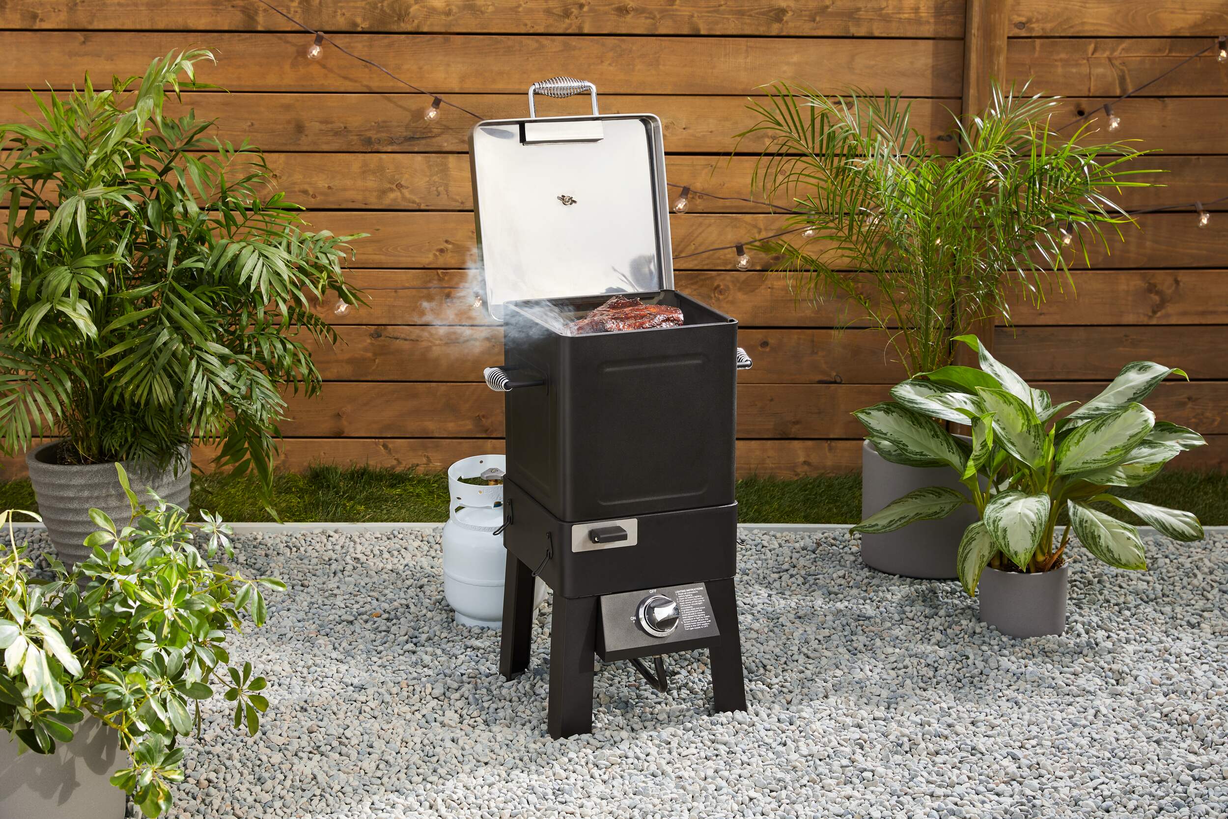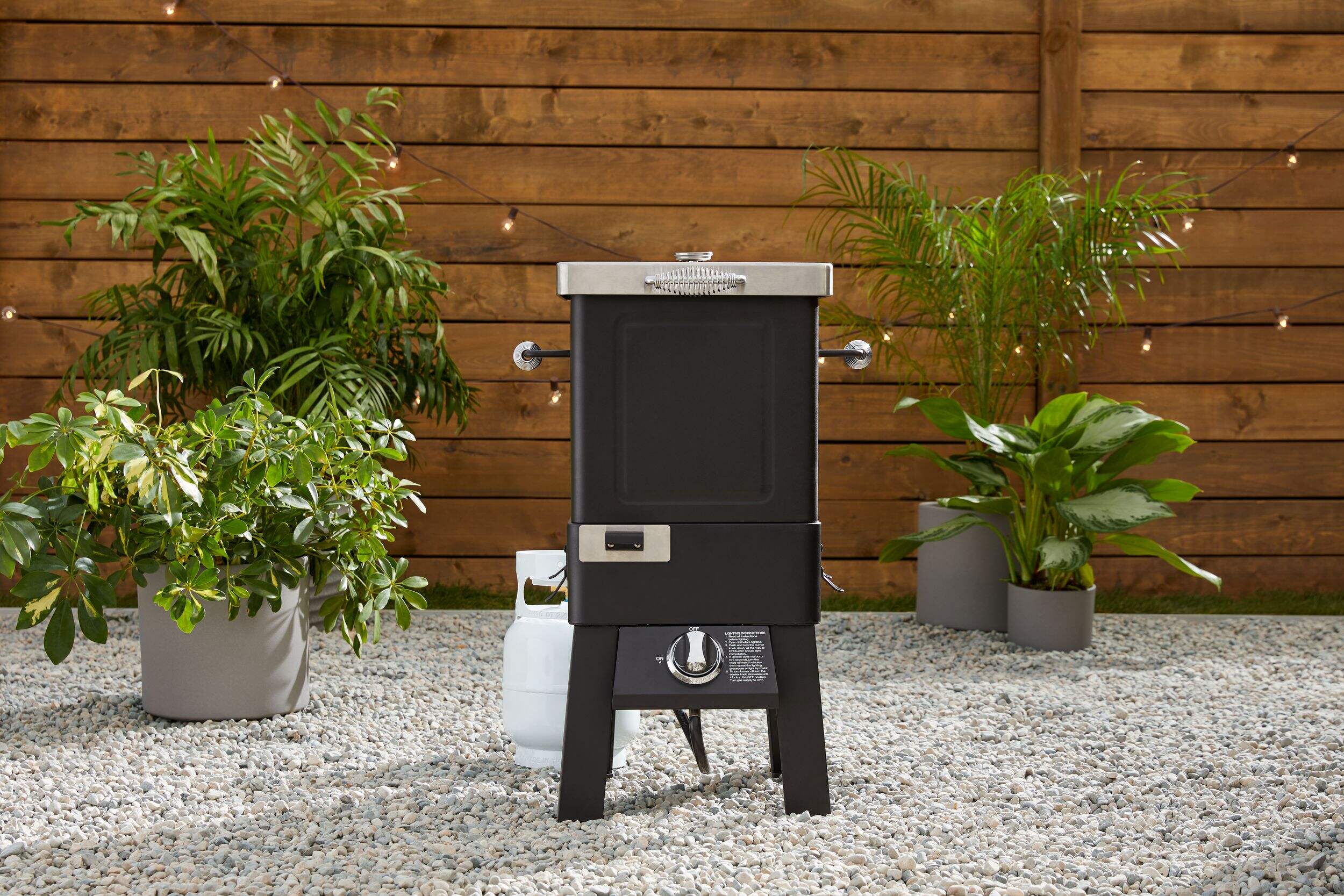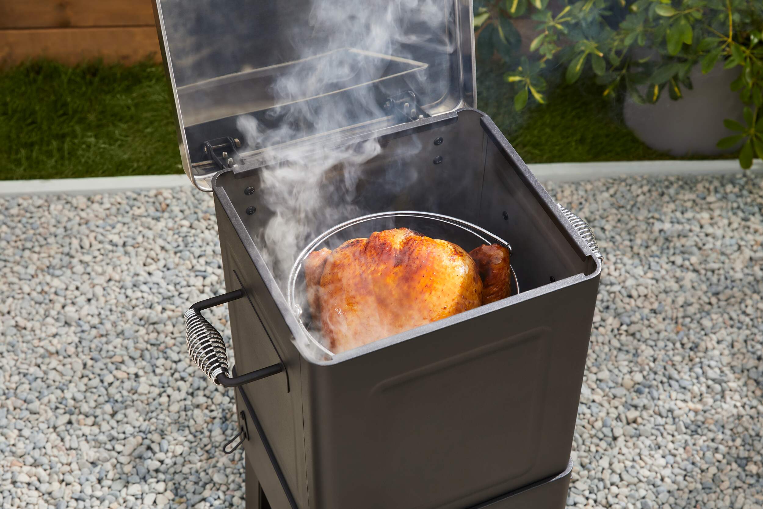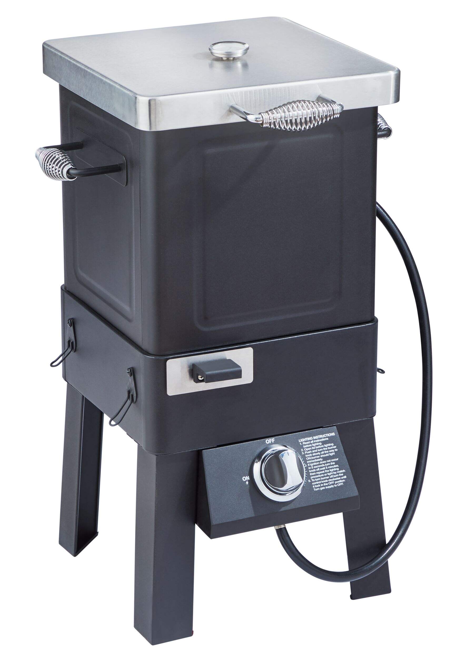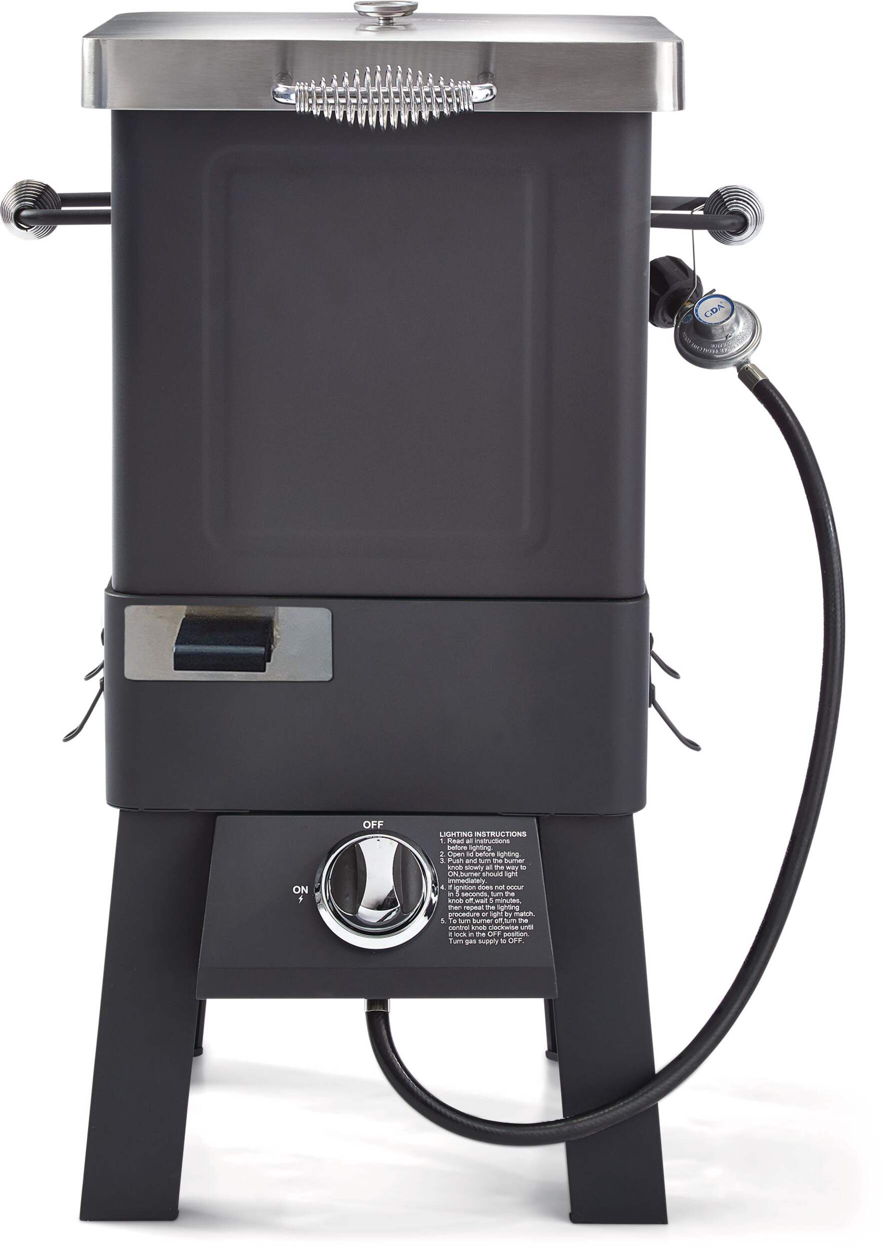 Enjoy oil-less frying with the MASTER Chef Outdoor 3-in-1 Outdoor Cooker. A marvel of cooking technology, this propane deep fryer is perfect for smoking and roasting your meats. For fans of poultry and fowl, the metal cage is capable of holding a turkey of up to 20 lbs. More adventurous grillers will be impressed by the built-in wood chip box for smoking, which lets you infuse a variety of flavour options into your food. With a heating capacity of up to 12,000 BTUs, this 3-in-1 outdoor cooker air fryer won’t back down from your biggest cooking challenges. The easy light Piezo igniter will get you grilling quickly - no worrying about lighting with cumbersome lighters. Every Master Chef 3 in 1 Outdoor Cooker includes a chrome-plated cooking basket, handy lifter, cooking rack, meat hanger, and a convenient meat thermometer that takes the guesswork out of cooking times. Cleaning up this outdoor air fryer is a breeze, especially with the included drip pan, which catches juices, spills, and grease to keep the surface area of the grill hygienic and spotless.