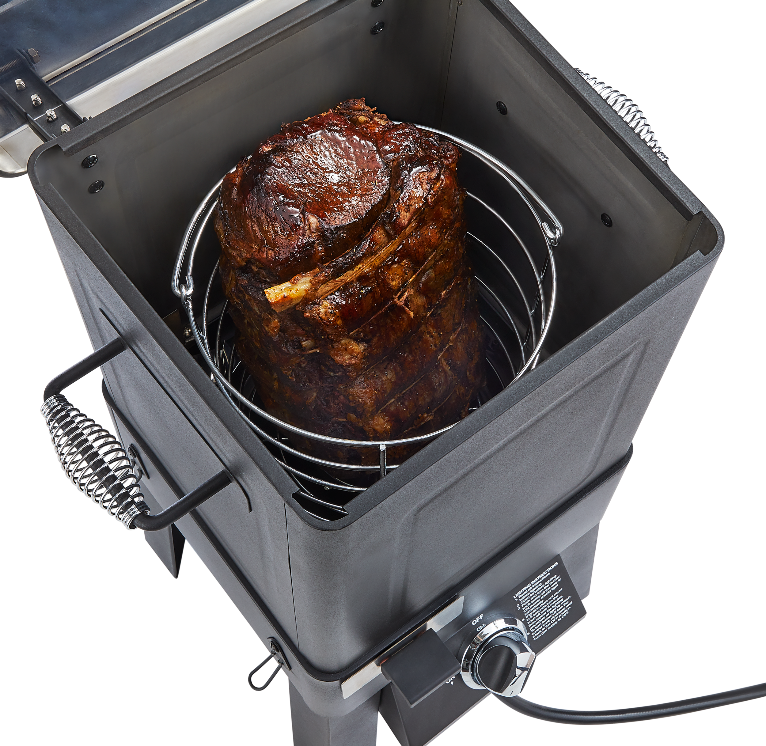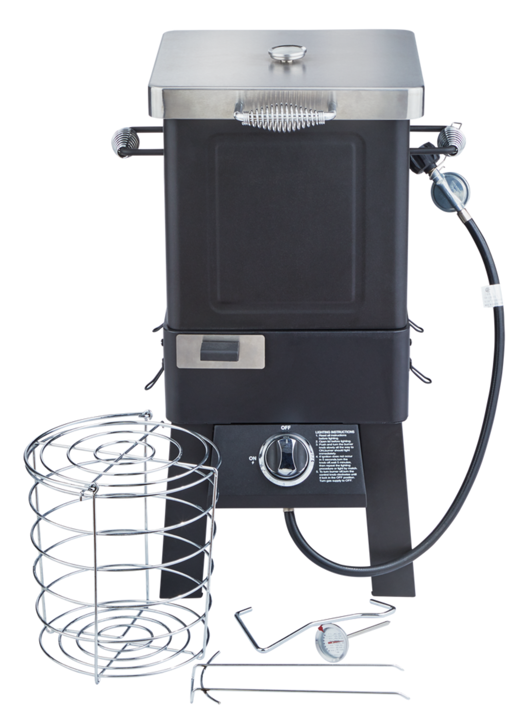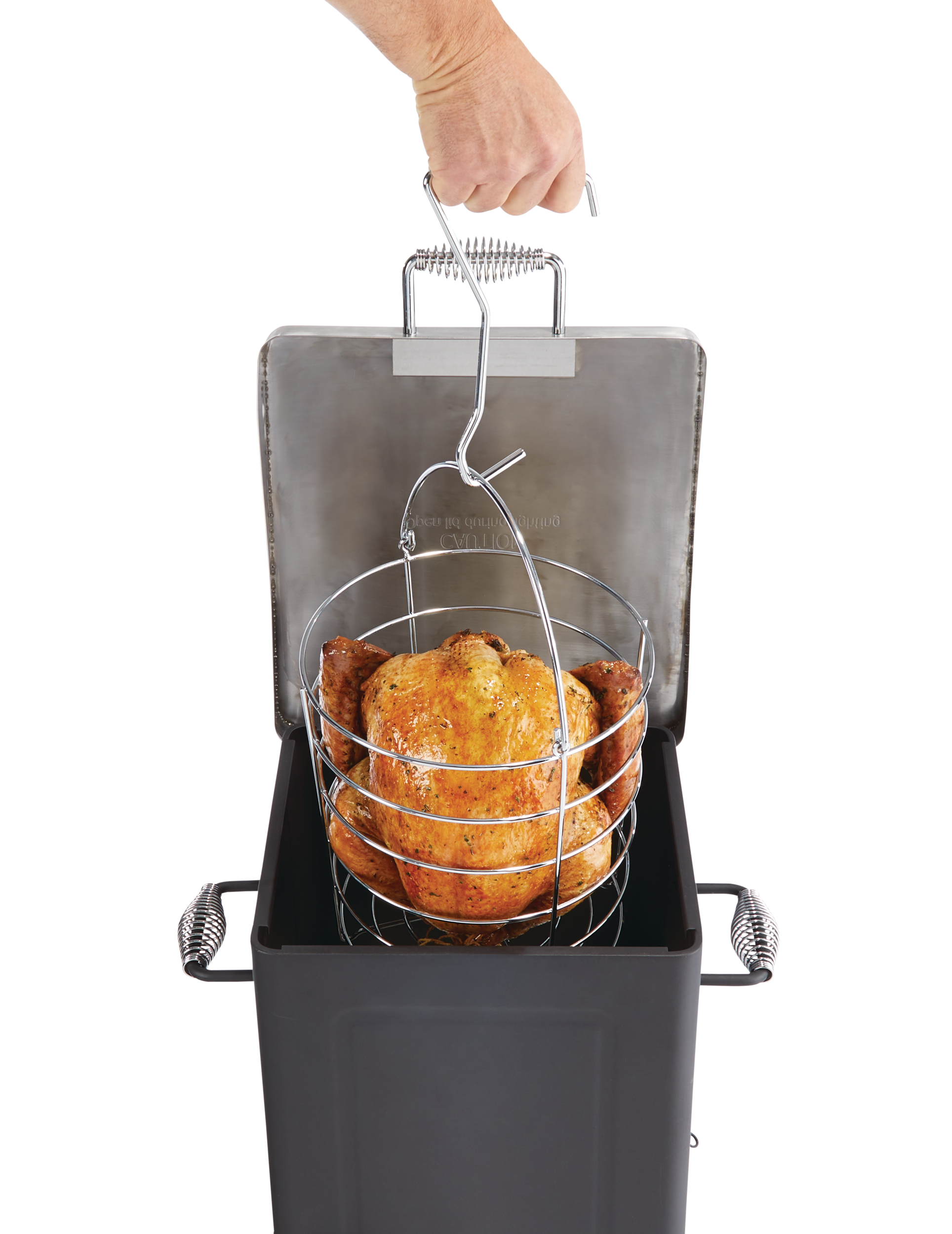 Includes chrome-plated cooking basket, lifter, rack, hanger and meat thermometer