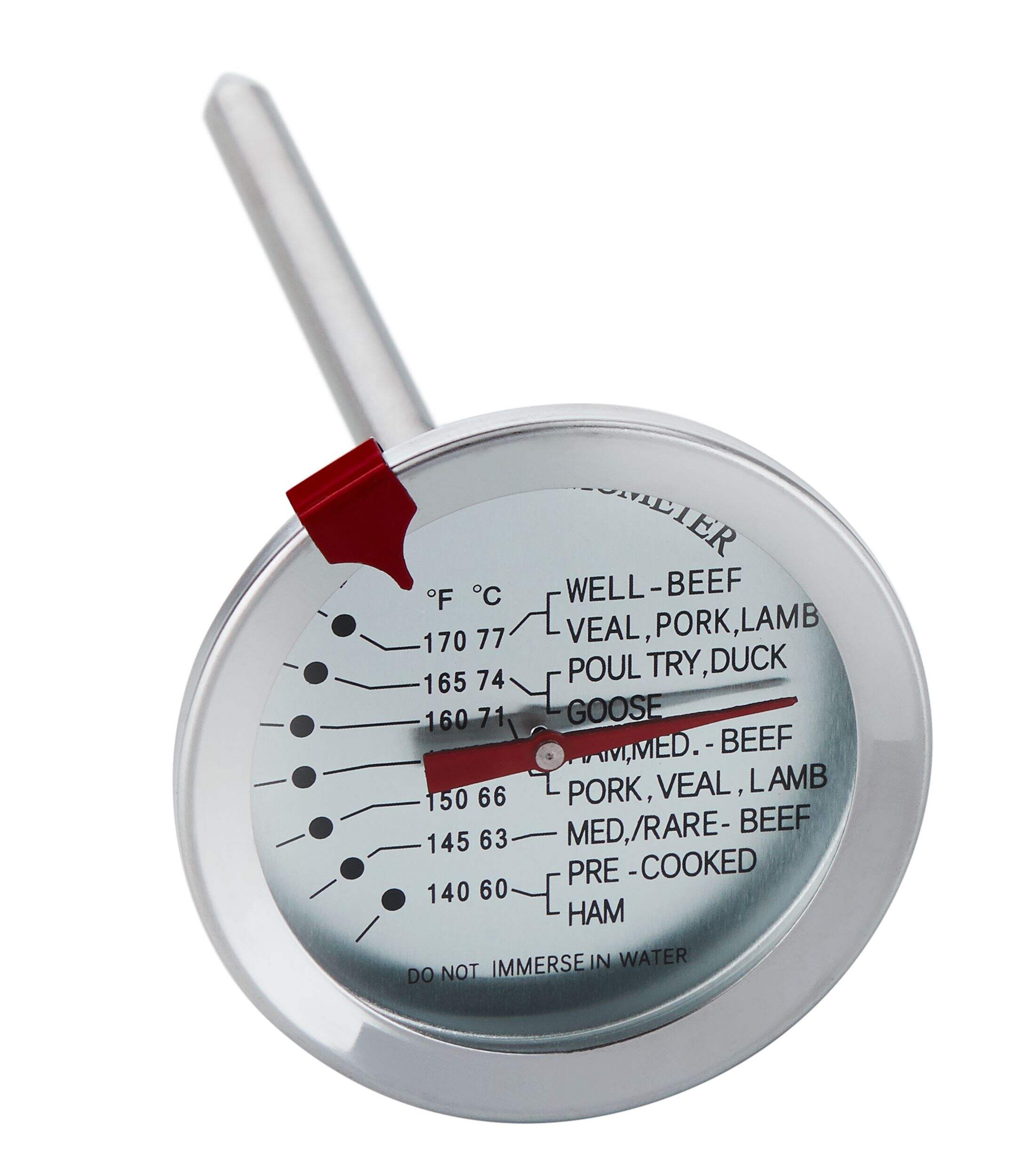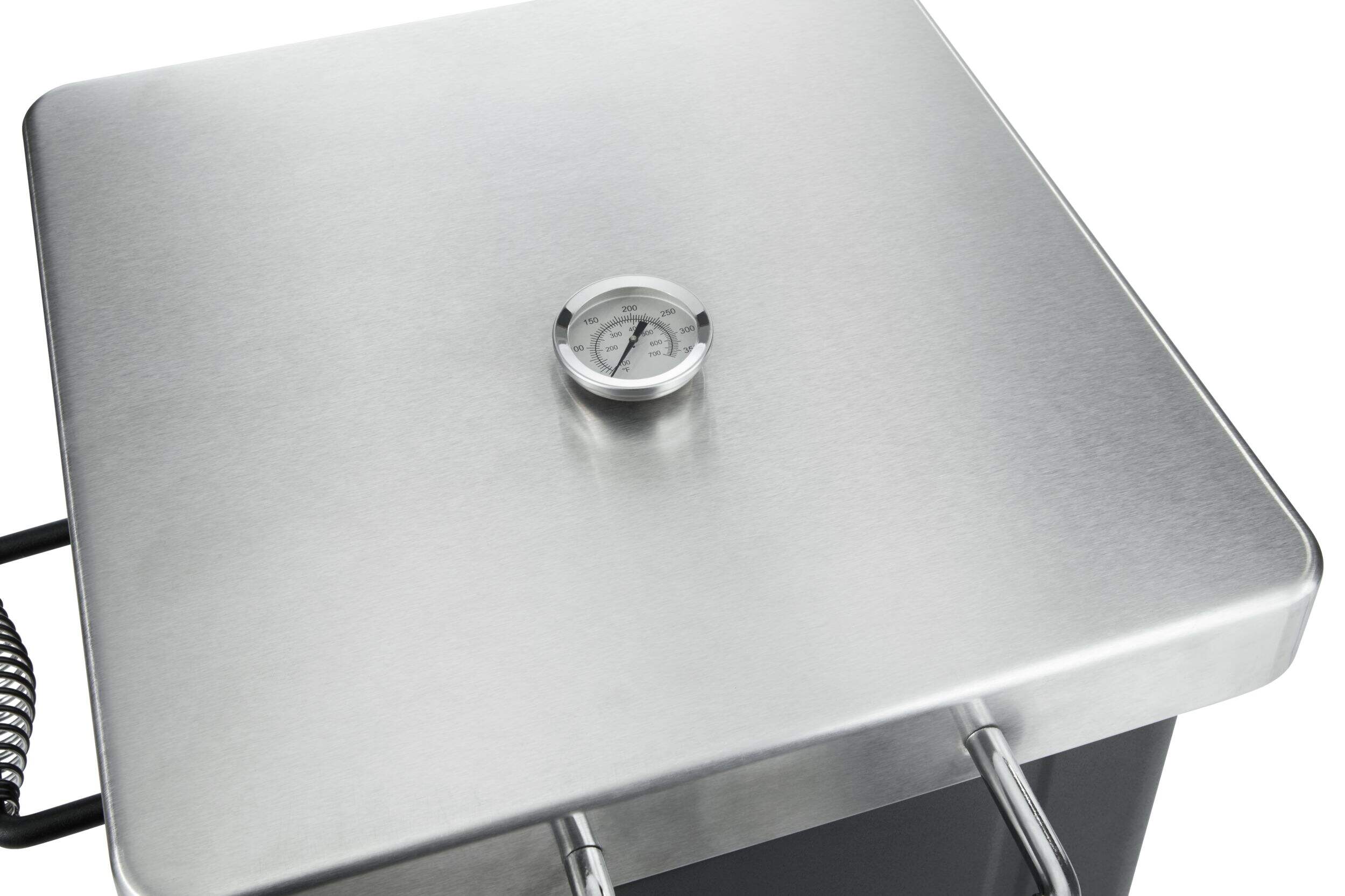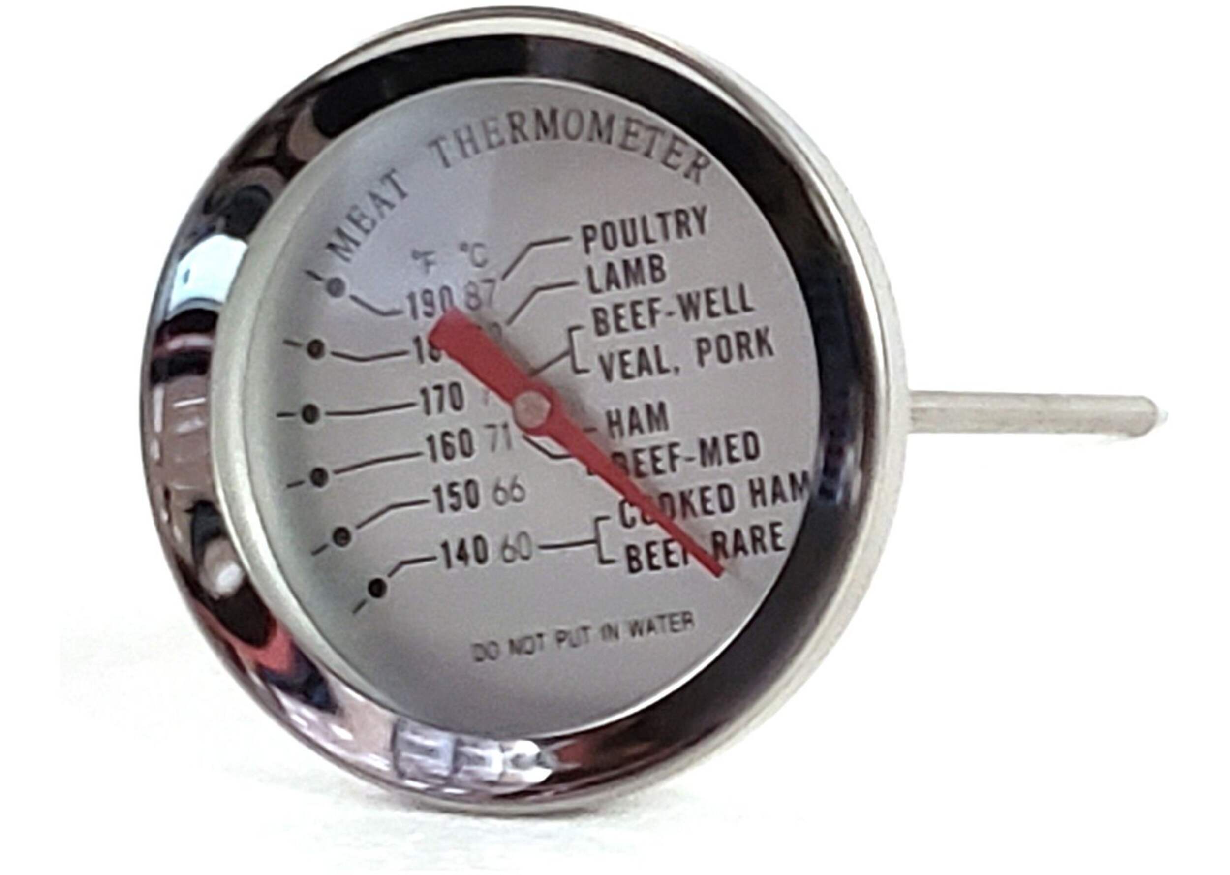 Includes chrome-plated cooking basket, lifter, rack, hanger and meat thermometer