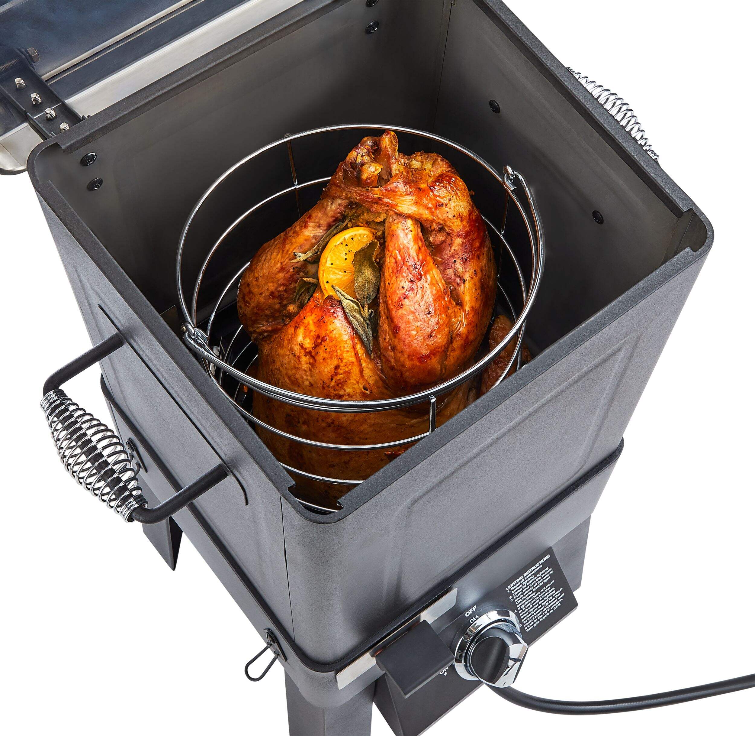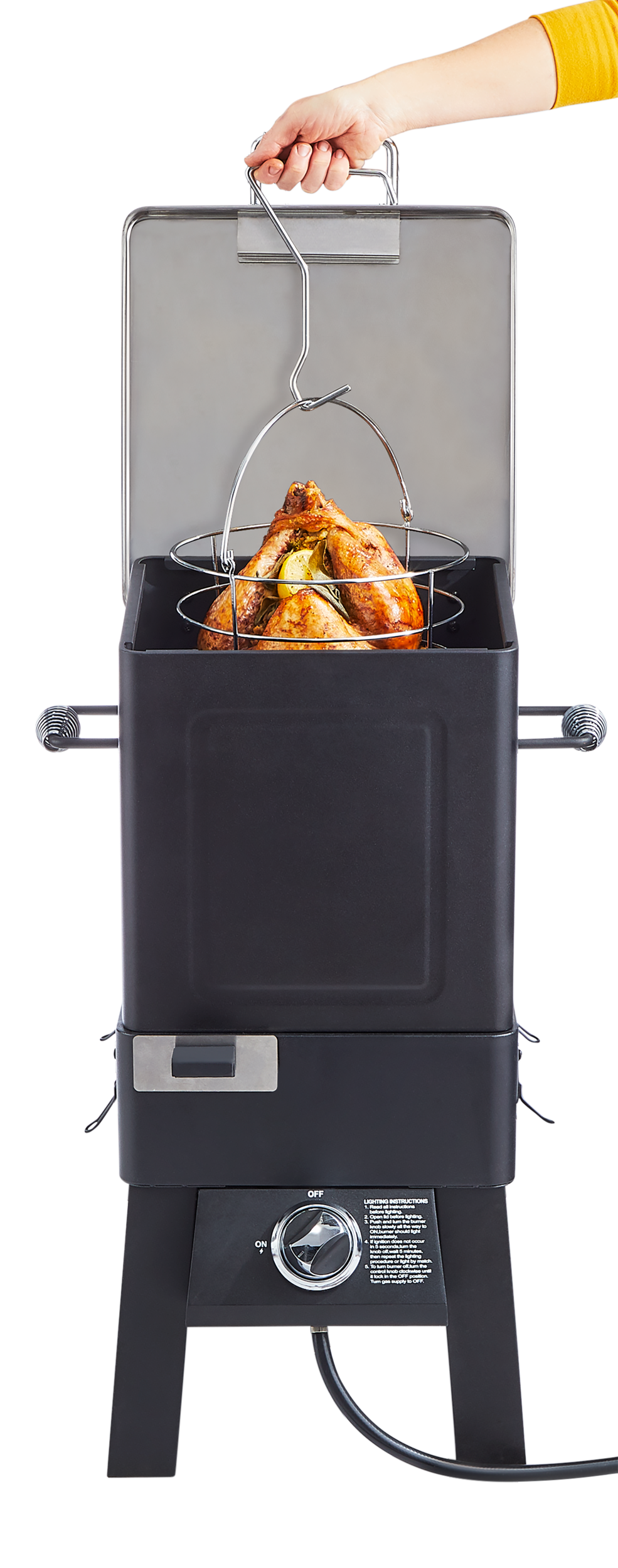 Oil-less air frying function with cage that holds a turkey up to a 20 lb