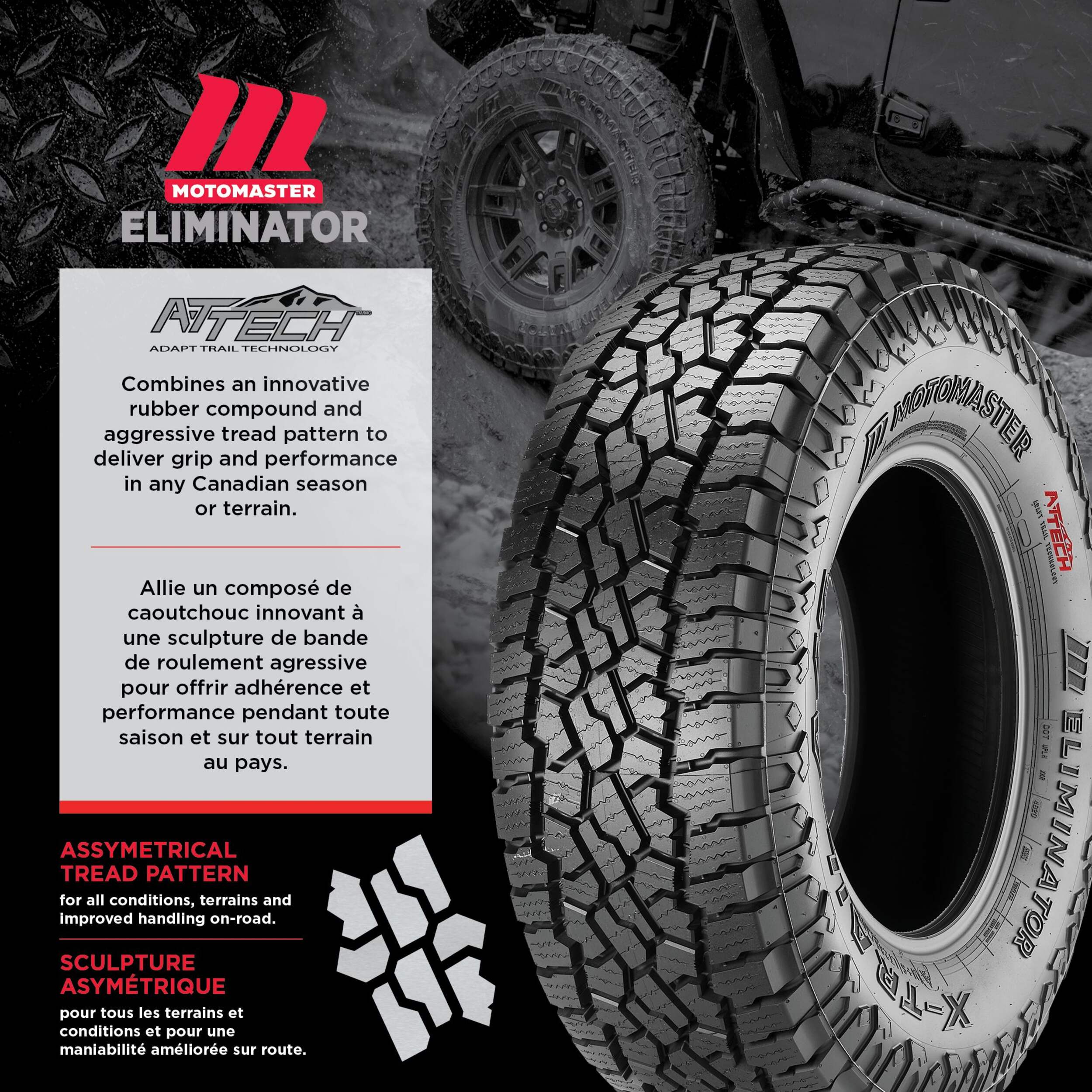 NEW MotoMaster Eliminator X-Trail A/T TireDiscover all the new features and benefits of our latest and hottest MotoMaster All Terrain Tire, the Eliminator X-Trail A/T.