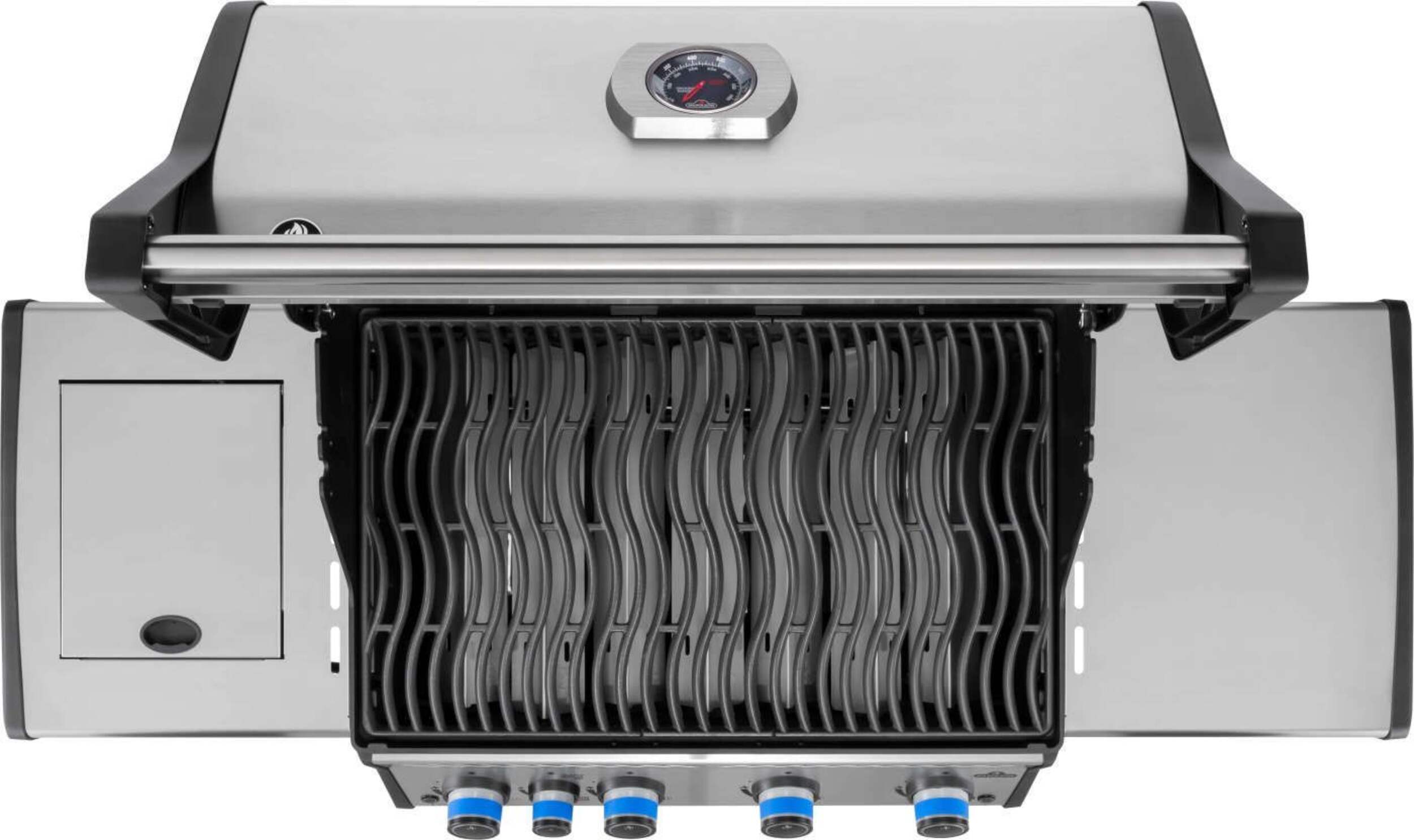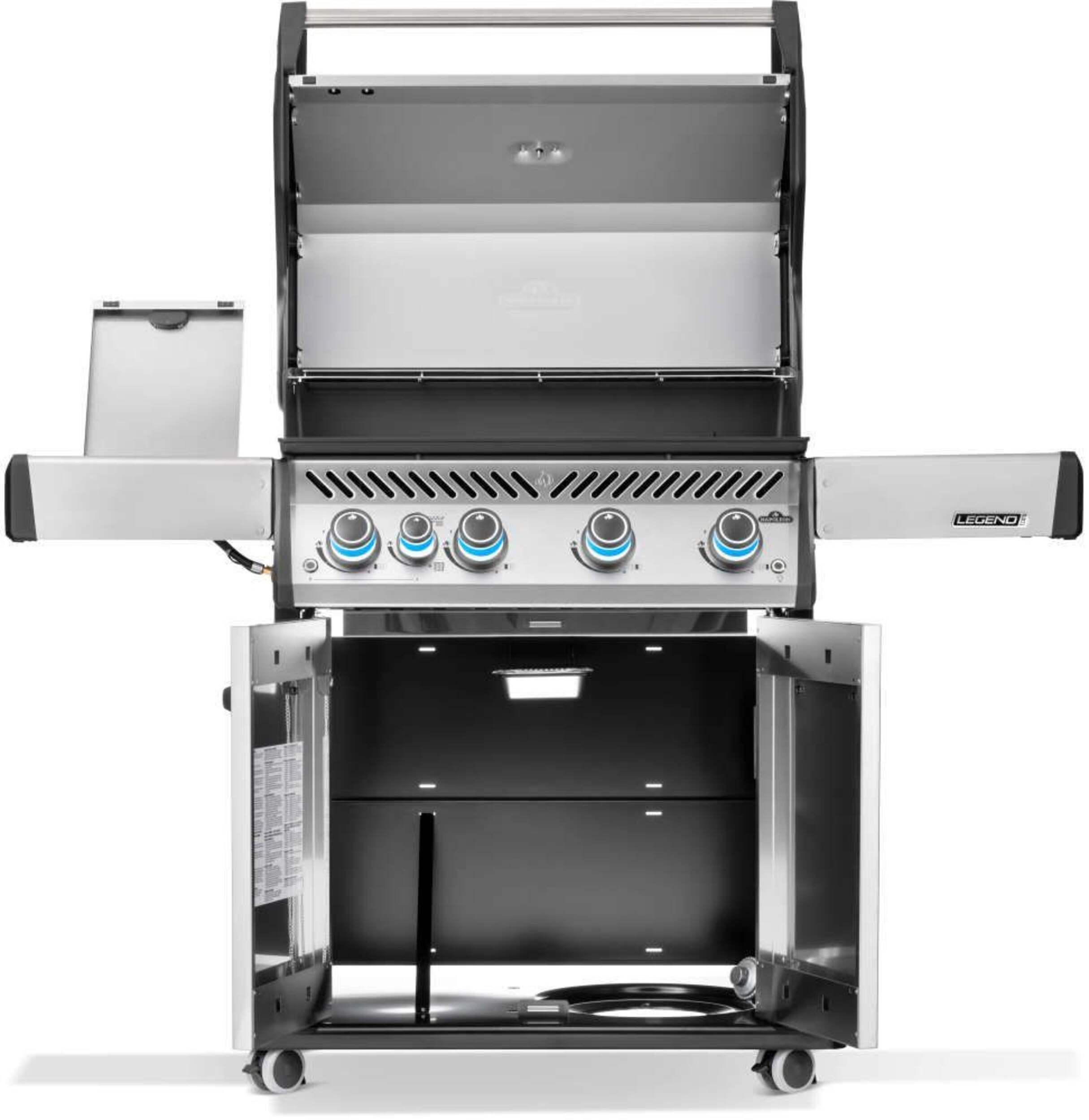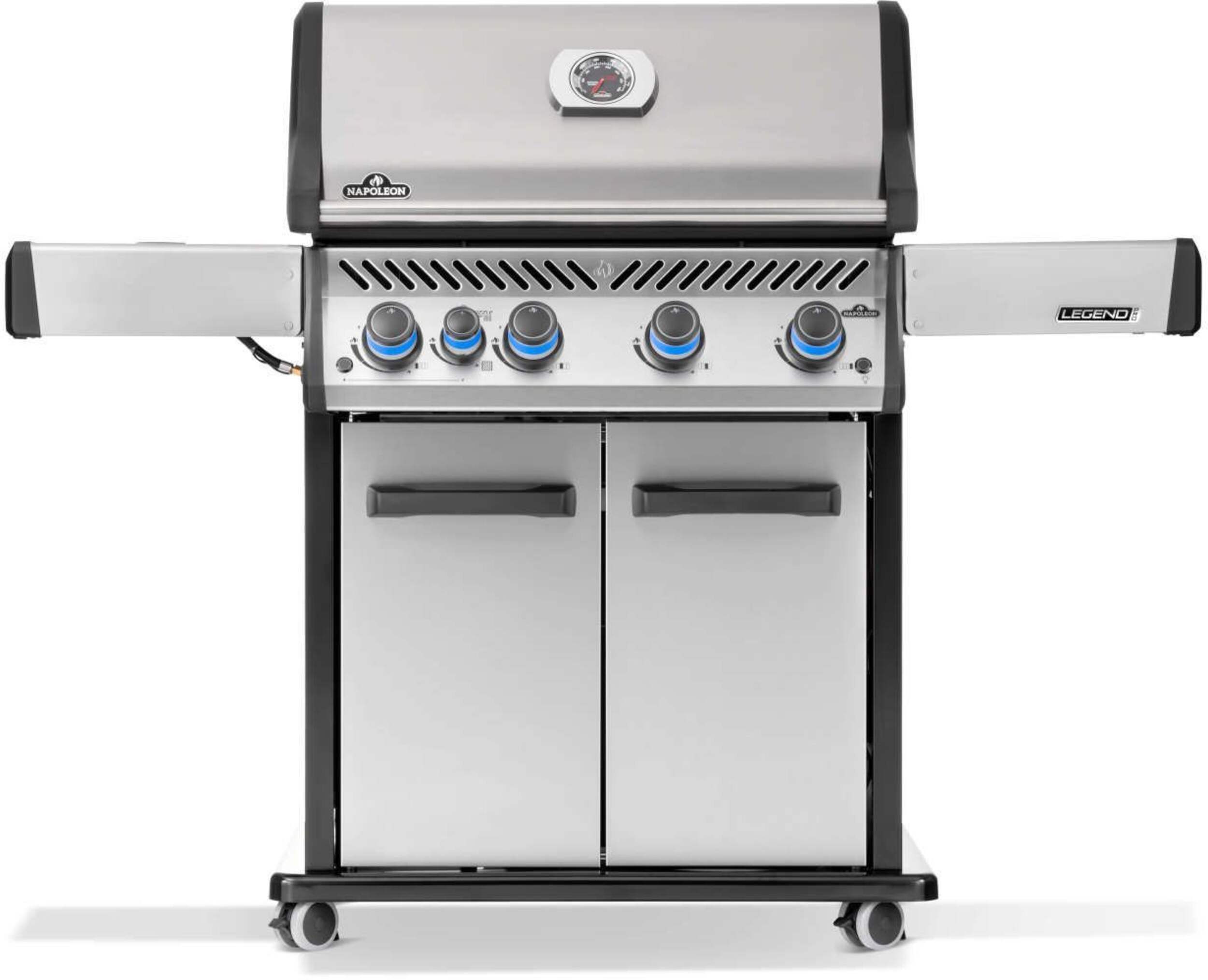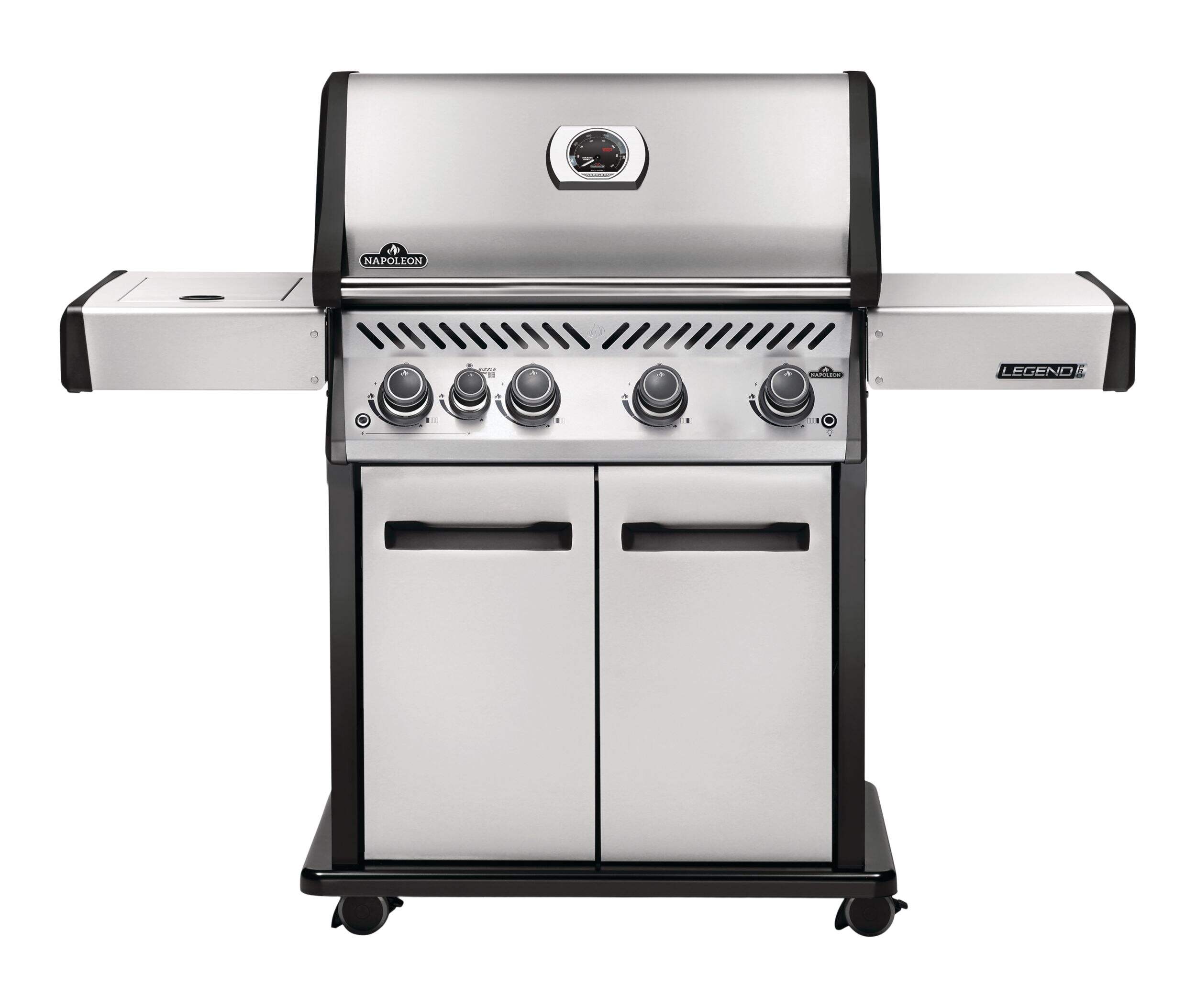 The Grill. The Myth. The Napoleon Legend LD4X. This stainless steel, 4 burner propane grill is built to last. Inside, porcelainized cast iron cooking grids provide the ideal sear with their Iconic WAVE™ pattern that lets you know it's a Napoleon. Stainless steel sear plates are staggered to prevent flare-ups, creating flavor, not flames. Enjoy easy lighting using the JETFIRE™ ignition system and ergonomic knobs. Control temperature within the grill for multiple cooking styles and options thanks to the ACCU-PROBE™ temperature gauge. Sear the perfect steak or a quick meal over the infrared SIZZLE ZONE™ side burner, which heats to searing temperatures in seconds. Save space by folding down the generous side shelves, making this grill the perfect option for outdoor areas where space is at a premium.