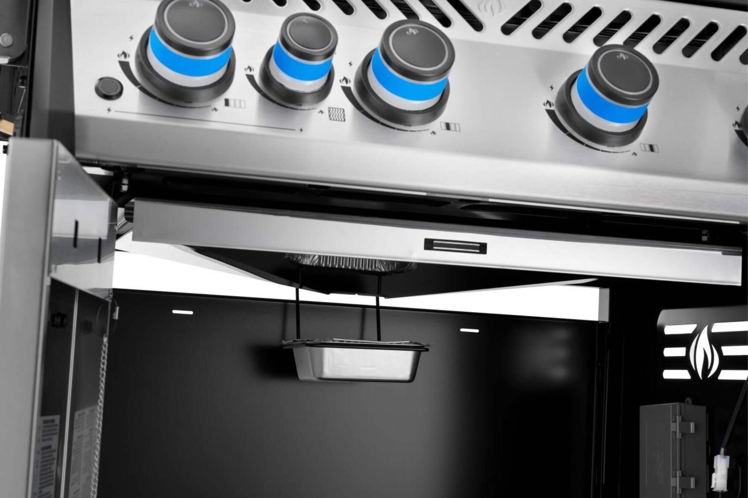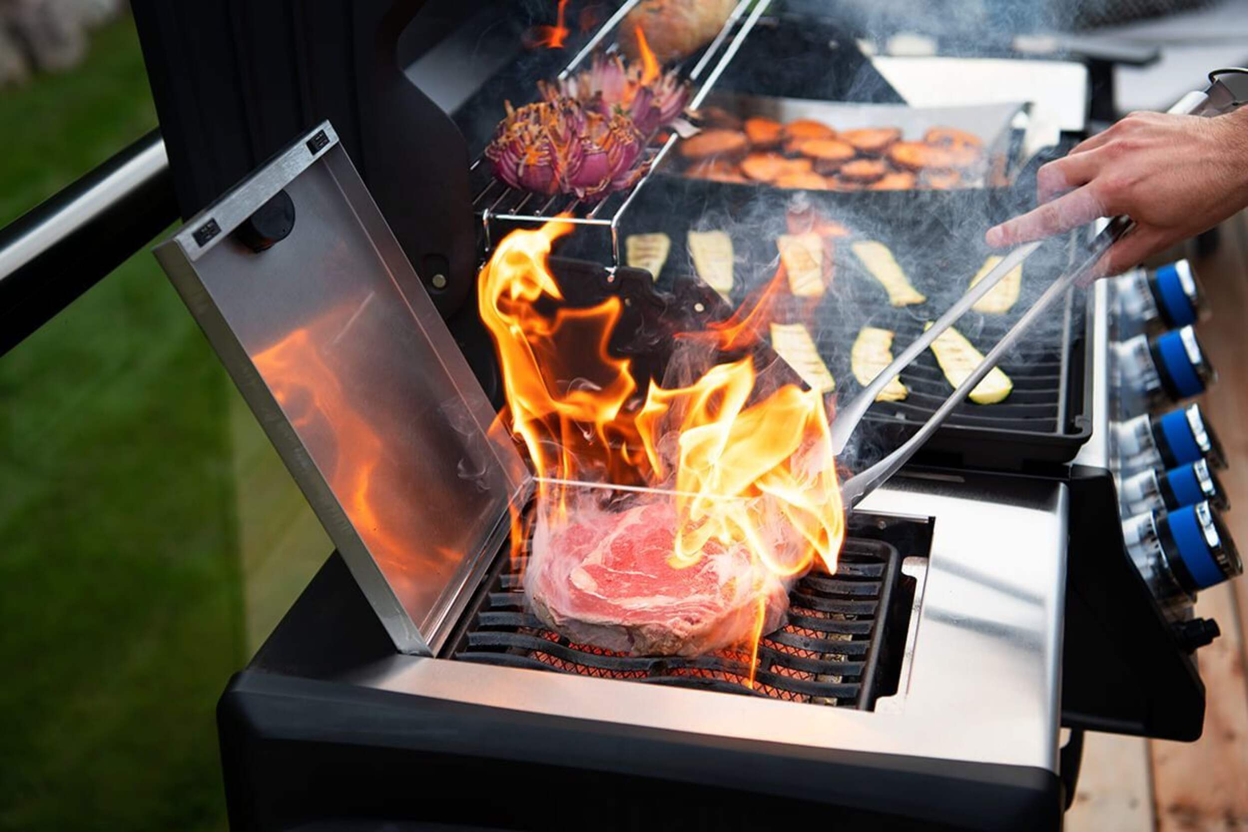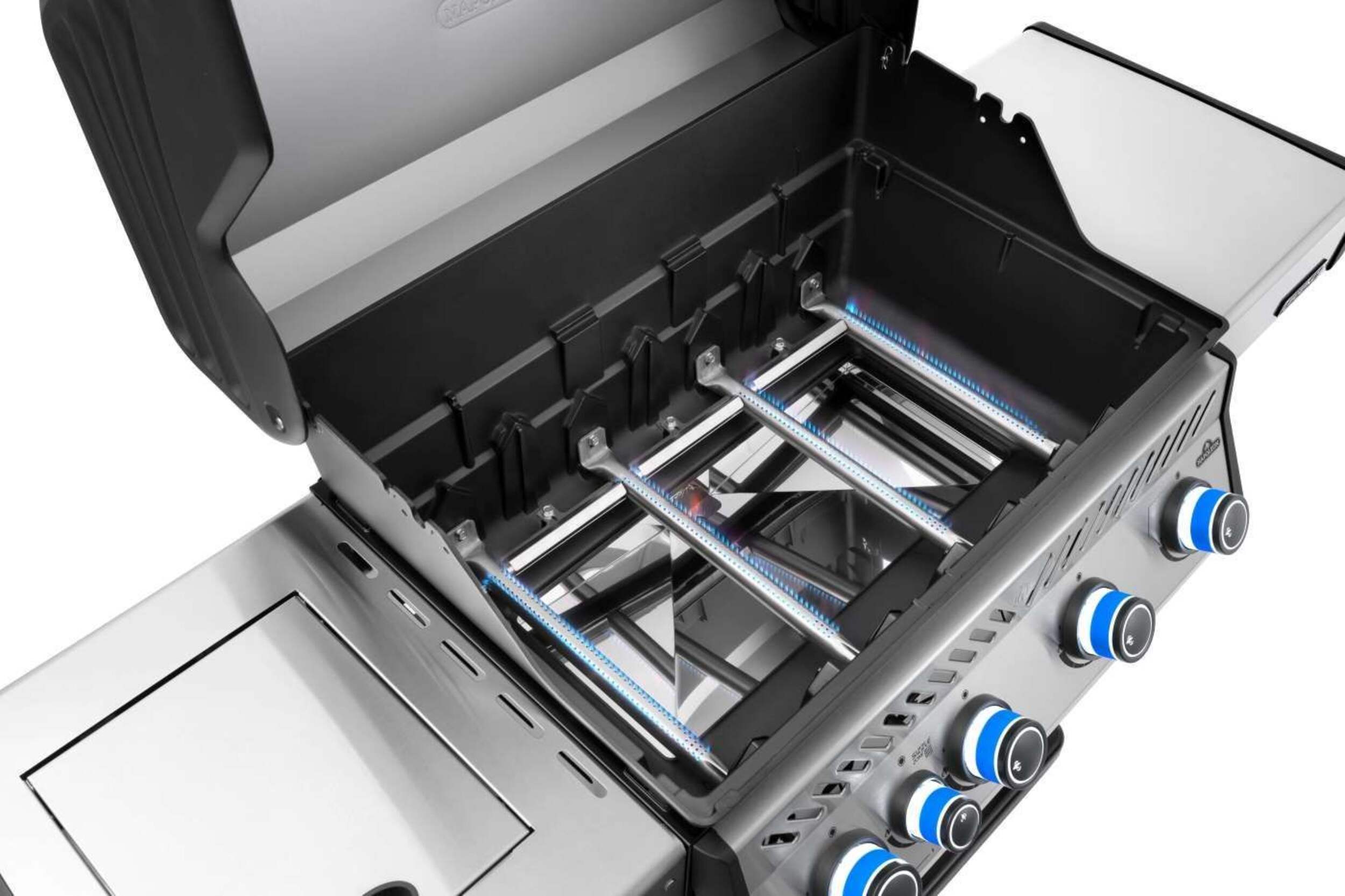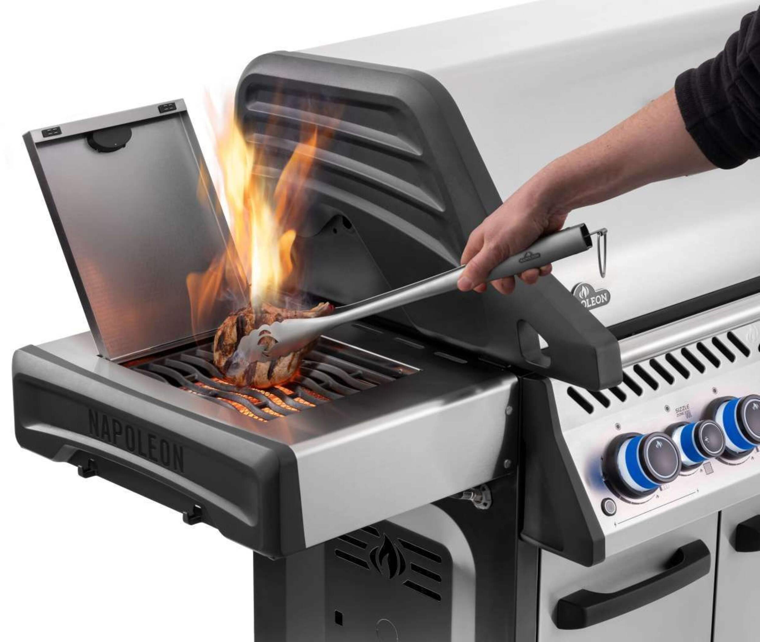 The Grill. The Myth. The Napoleon Legend LD4X. This stainless steel, 4 burner propane grill is built to last. Inside, porcelainized cast iron cooking grids provide the ideal sear with their Iconic WAVE™ pattern that lets you know it's a Napoleon. Stainless steel sear plates are staggered to prevent flare-ups, creating flavor, not flames. Enjoy easy lighting using the JETFIRE™ ignition system and ergonomic knobs. Control temperature within the grill for multiple cooking styles and options thanks to the ACCU-PROBE™ temperature gauge. Sear the perfect steak or a quick meal over the infrared SIZZLE ZONE™ side burner, which heats to searing temperatures in seconds. Save space by folding down the generous side shelves, making this grill the perfect option for outdoor areas where space is at a premium.