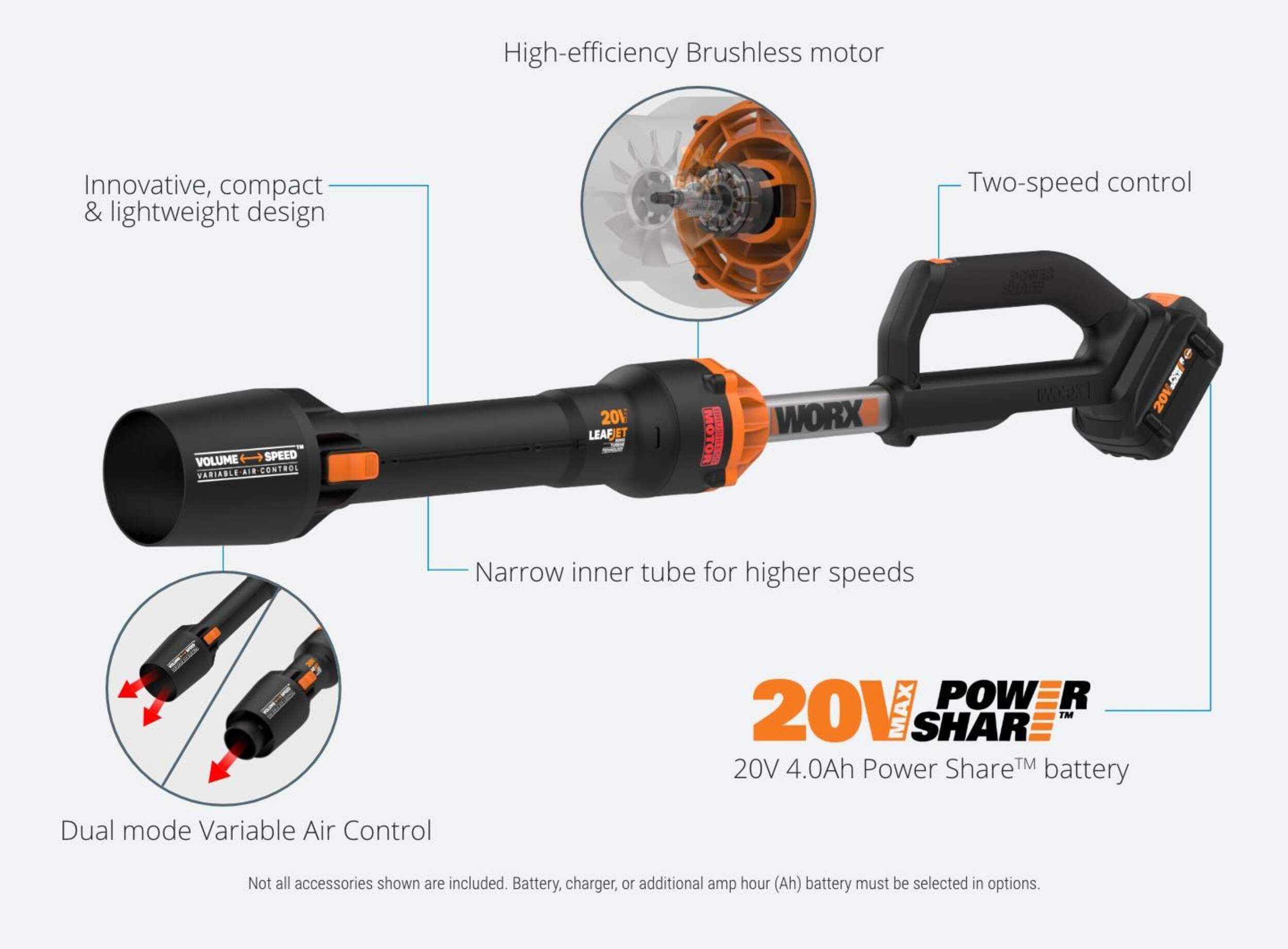 Make quick work of clearing your yard of leaves with the WORX WG543 20V Power Share™ Cordless Leafjet Blower/Sweeper. This powerful blower features a slim, easy-to-operate design that helps you quickly and efficiently blow leaves and debris from your lawn. This Leafjet Blower comes with a 4.0Ah battery and 2-Amp charger, and you can even use its battery interchangeably with other Worx tools for extra convenience.