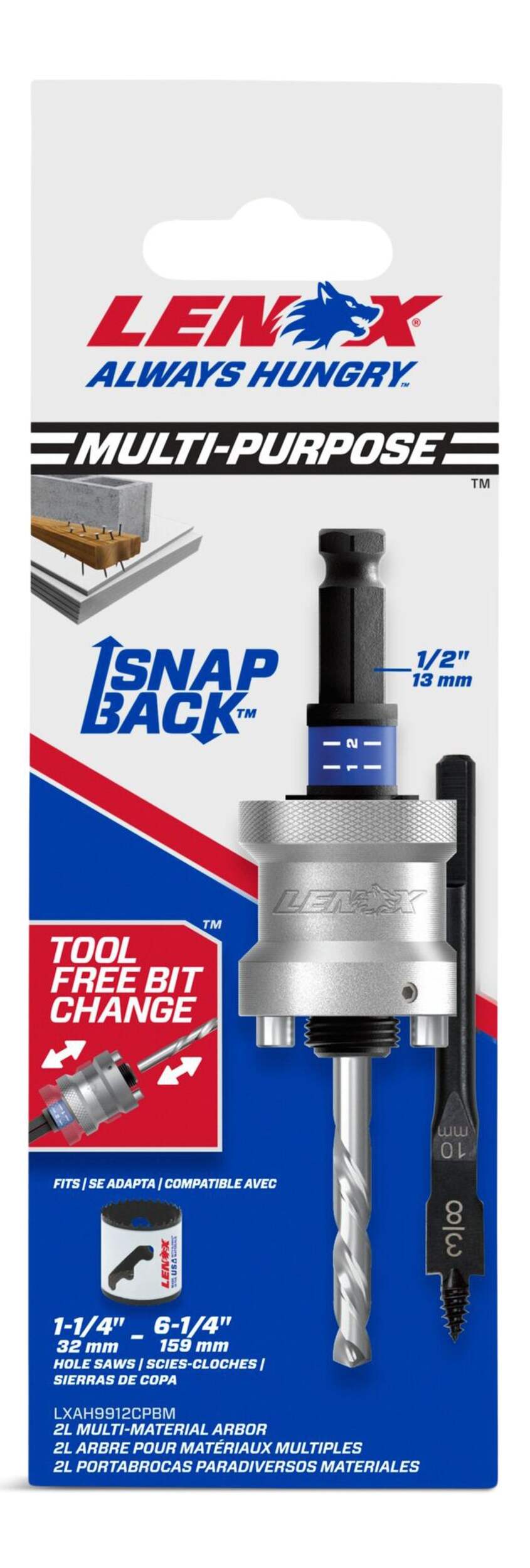 Les arbres de scie-cloche à changement rapide LENOXMD SNAP-BACKMD permettent un changement de scie et de foret de centrage sans outil* pour une meilleure productivité. La conception en 2 étapes permet de libérer la scie et le foret de centrage sans nécessiter d'outils supplémentaires. Le collier s'enclenche dans chaque position, pour permettre une utilisation à une seule main, et est armaturé pour rester engagé pendant le perçage. Les arbres à changement rapide LENOX SNAP-BACK sont universellement compatibles** avec toutes les scies-cloches filetées et ne nécessitent pas d'adaptateurs pour être utilisés.