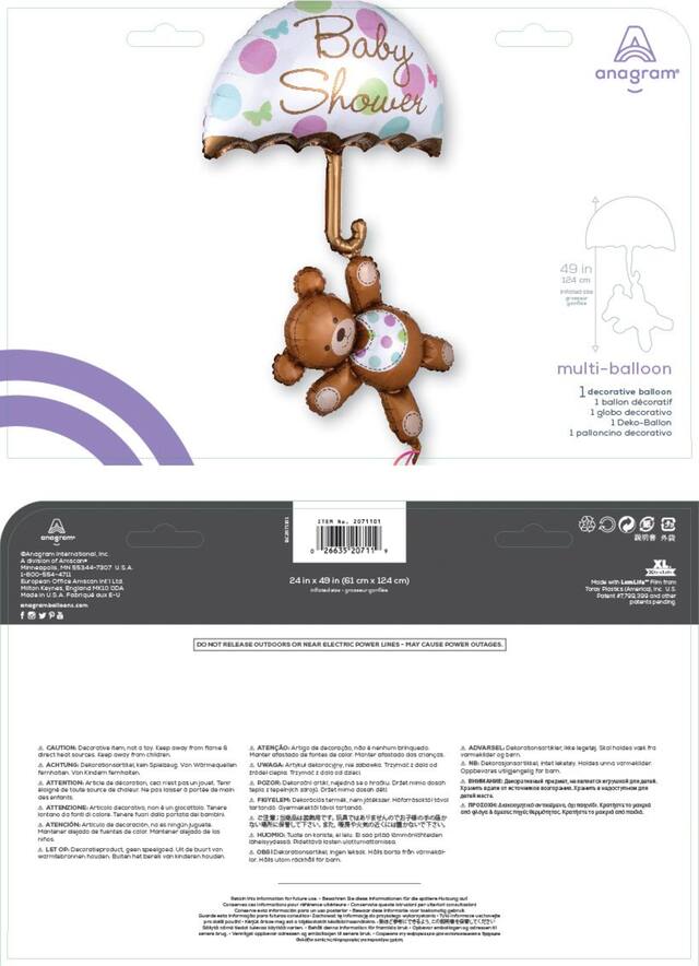 Hugs and Stitches Baby Shower Balloon features an adorable teddy bear hanging from an umbrella that reads "Baby Shower"