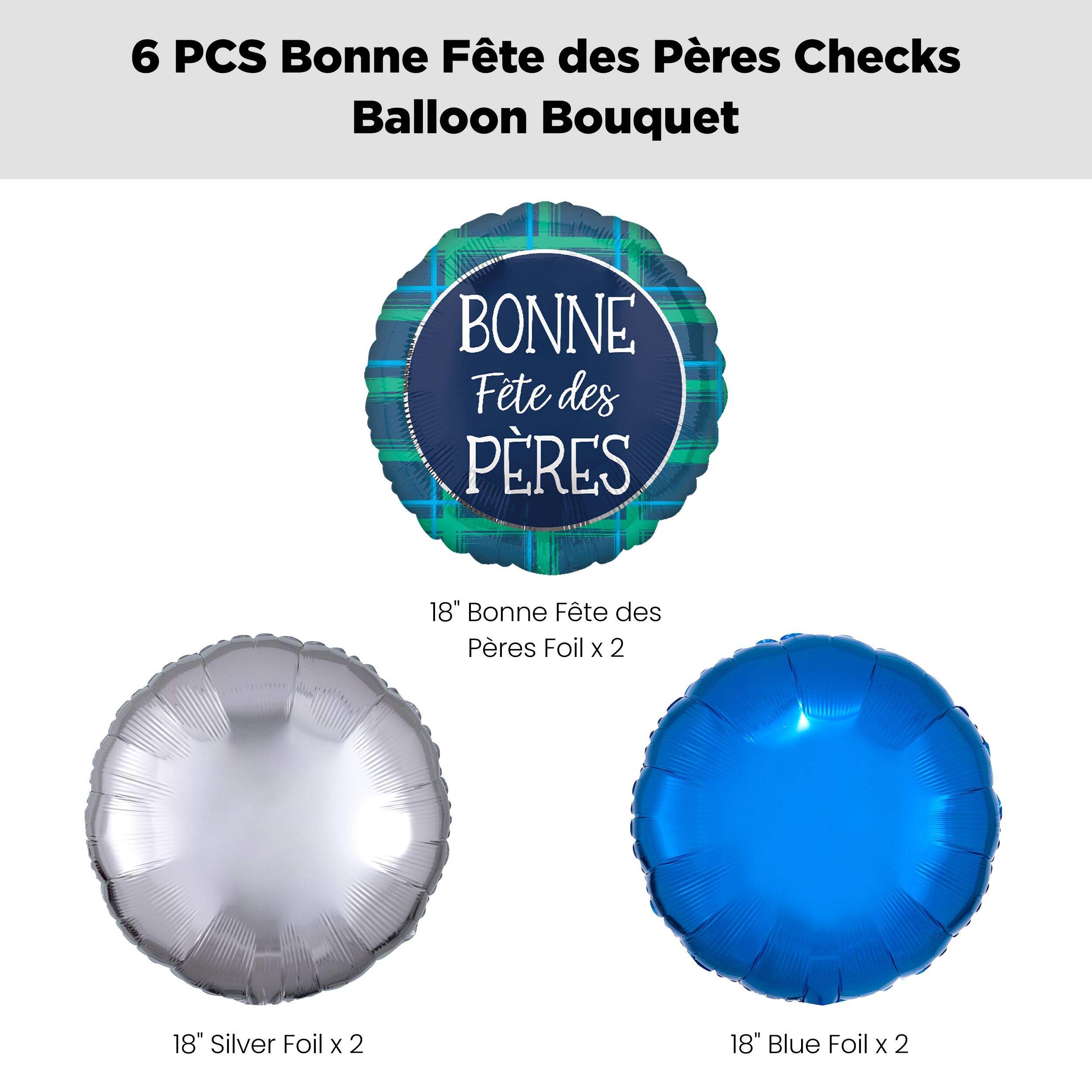 This kit includes: 2 "Bonne Fête des Pères" French Happy Father's Day Plaid 18" Balloon (SKU 8551601), 2 18" Blue Round Foil Balloons (SKU 8423909) and 2 18" Silver Round Foil Balloons (SKU 8423906)