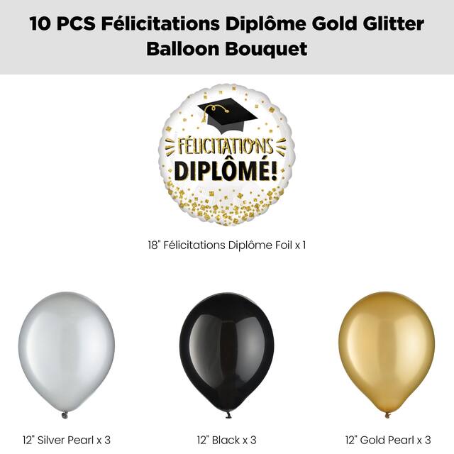 Add the perfect finishing touch to their graduation event with this "Félicitations Diplôme!" French Congratulations Grad! Glitter 18" Balloon Bouquet with Black, Gold and Silver 12" Latex Balloons