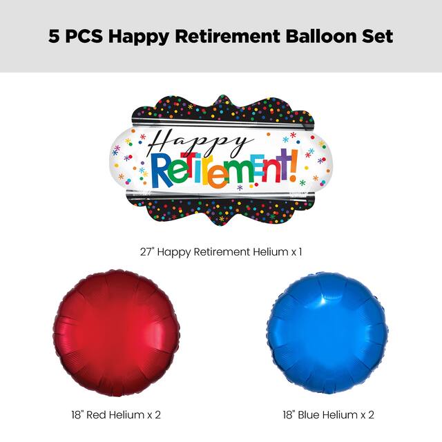 This kit includes: 1 27" "Happy Retirement" Round Polka Dot Satin Foil Supershape Balloon (SKU 8423995), 2 18" Red Round Foil Balloons (SKU 8423907) and 2 18" Blue Round Foil Balloons (SKU 8423909)