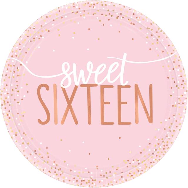 These fun metallic dessert plates have pink and rose gold dots rimming the edge and a "sweet sixteen" caption perfect for serving up birthday treats. The eight-pack helps keep your teenage girl's special day organized and stylish while giving guests a memorable place to enjoy each bite of cake or cup of ice cream. The 7-inch diameter makes them just the right size for individual slices and scoops.