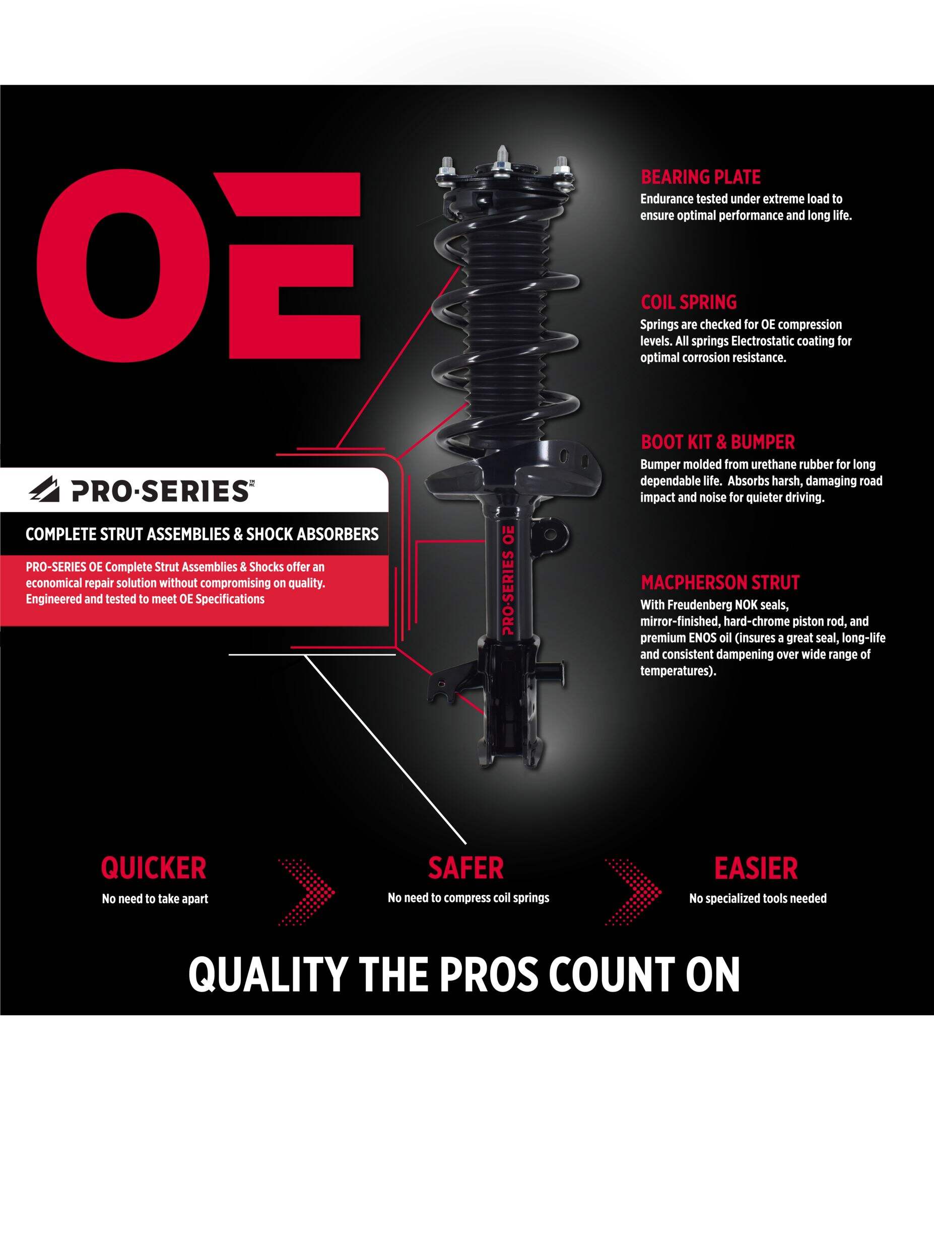 The PRO-SERIES OE Complete Strut Assemblies offers a economical repair solution without compromising on quality. Products are engineered and tested to meet OE Specifications, ensuring compatibility, fitment and function.