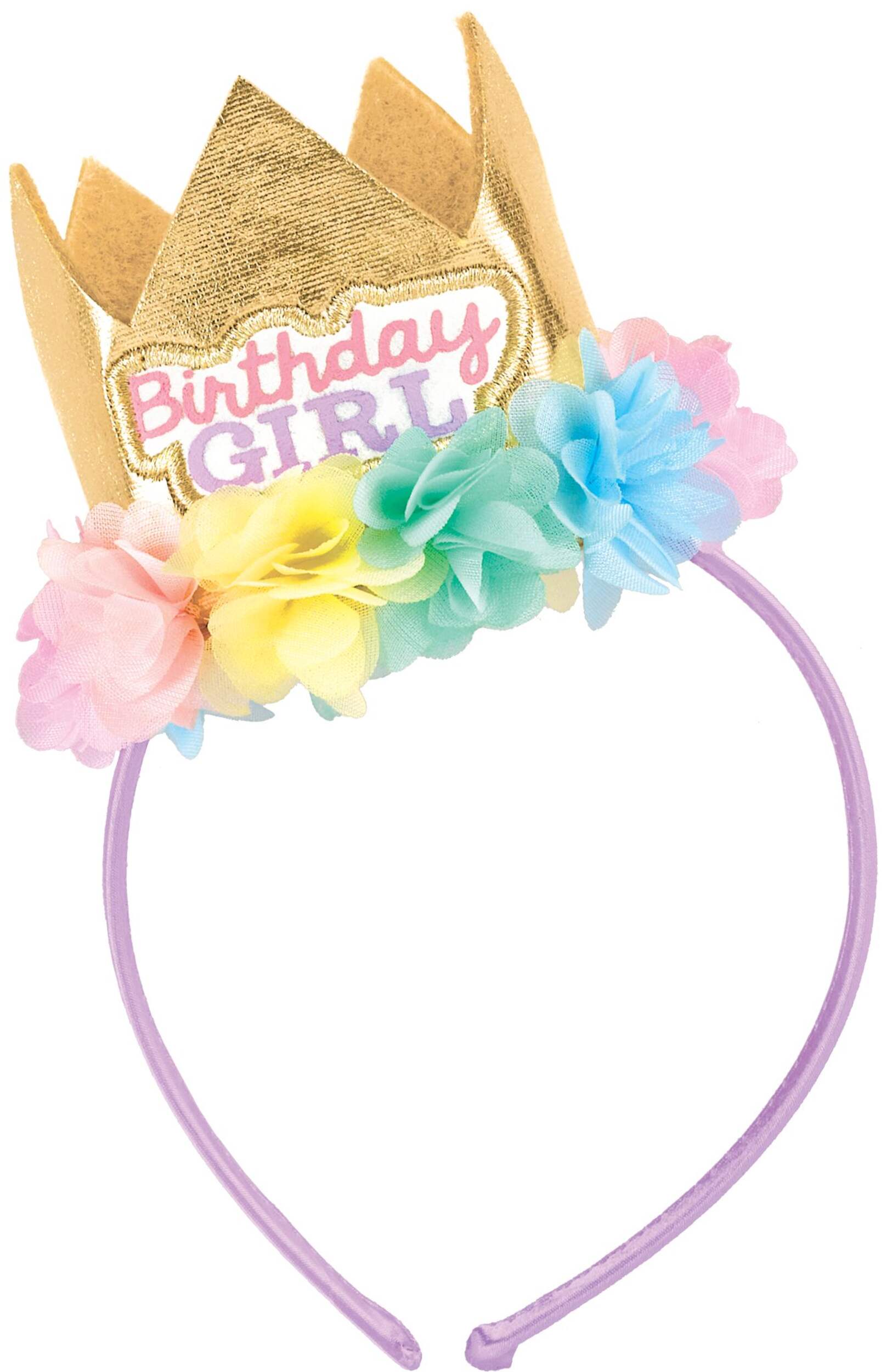 This sparkly gold crown headband with pretty pastel flowers is perfect for making a 1st birthday girl feel like royalty on her special day. The "Birthday Girl" lettering completes this crown, helping your little princess stand out at her party while the stretchy design ensures a comfortably fit for any celebrant.