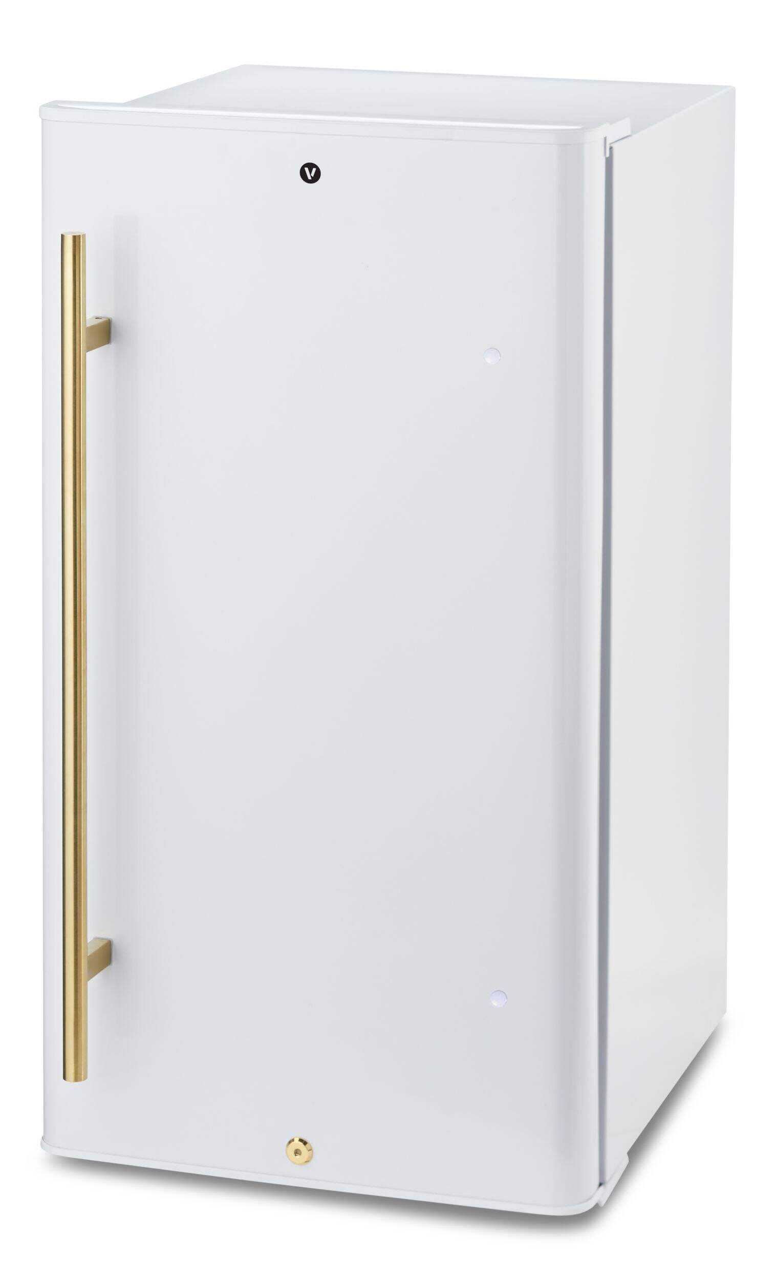 Ideal for a den, office or basement lounge, the Vida by PADERNO Fridge features integrated door shelving with tall bottle storage and the CanStor beverage system to fit all your favourite drinks inside. This 3.3 cu. ft. mini fridge is stacked with handy features: a door lock for child-proofing or private use, an interior overhead light to see the contents of the fridge at all times and a mechanical control to adjust the cooling temperature to your preference. This auto defrost fridge comes in an attractive white and gold finish that will match with the decor of most rooms with ease. The glass shelves provide a sturdy surface to store your lunch, snacks or overflow drinks while allowing you to see clearly what's on each level. The auto-defrost feature prevents this mini fridge's shelves from freezing over and causing leaks from melting ice, ensuring high performance over the long term. Upgrade your home or office with this sleek modern white fridge that's designed to add a touch of fun and luxury to your life.