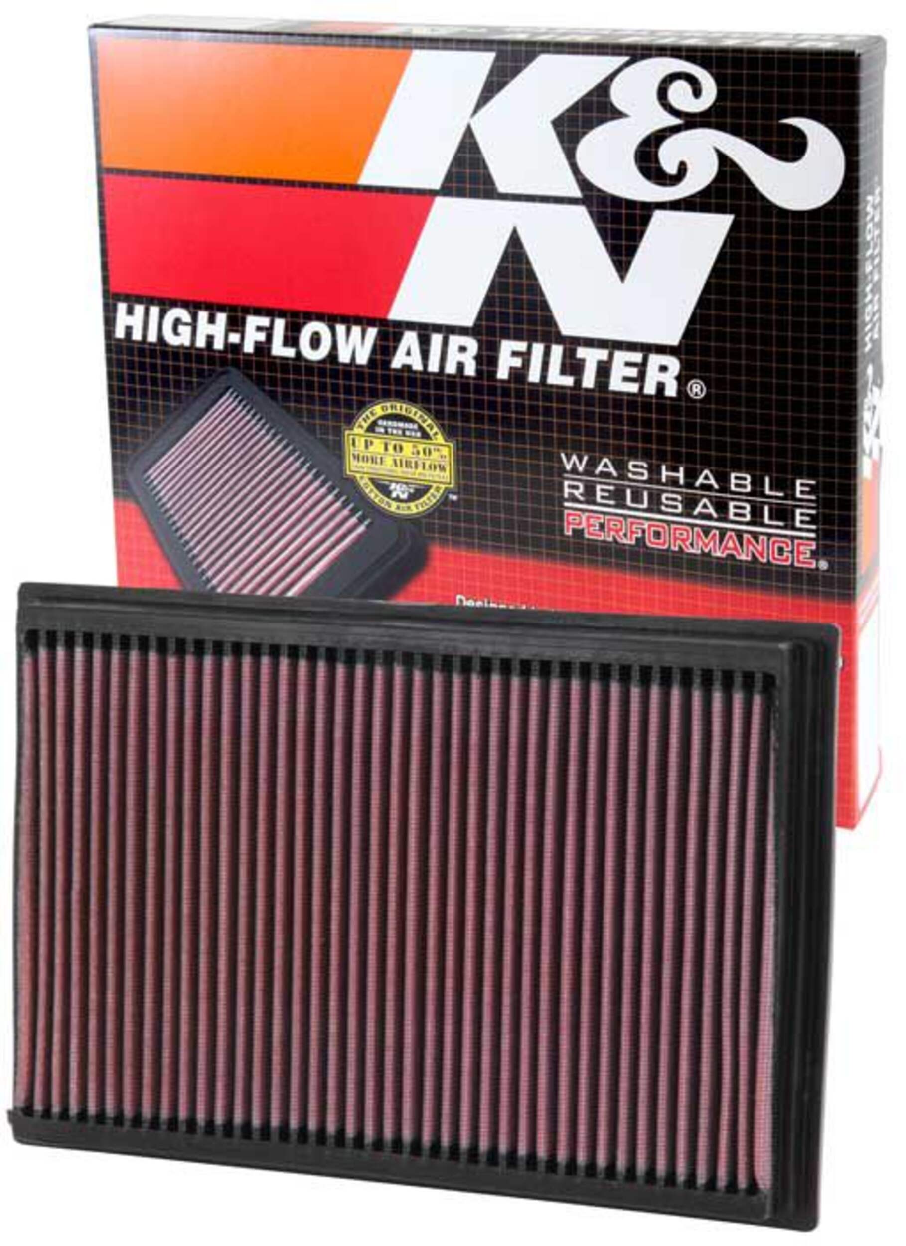 The K&N High-Flow Replacement Air Filter enhances your vehicle's performance by increasing airflow by up to 50% compared to traditional disposable paper filters. This washable and reusable filter provides long-term value and environmental benefits. Pre-oiled and easy to install, it fits seamlessly into your vehicle's existing air box, offering improved horsepower and acceleration. Backed by a 10-year/million-mile limited warranty, this filter is built to deliver durable and reliable performance.