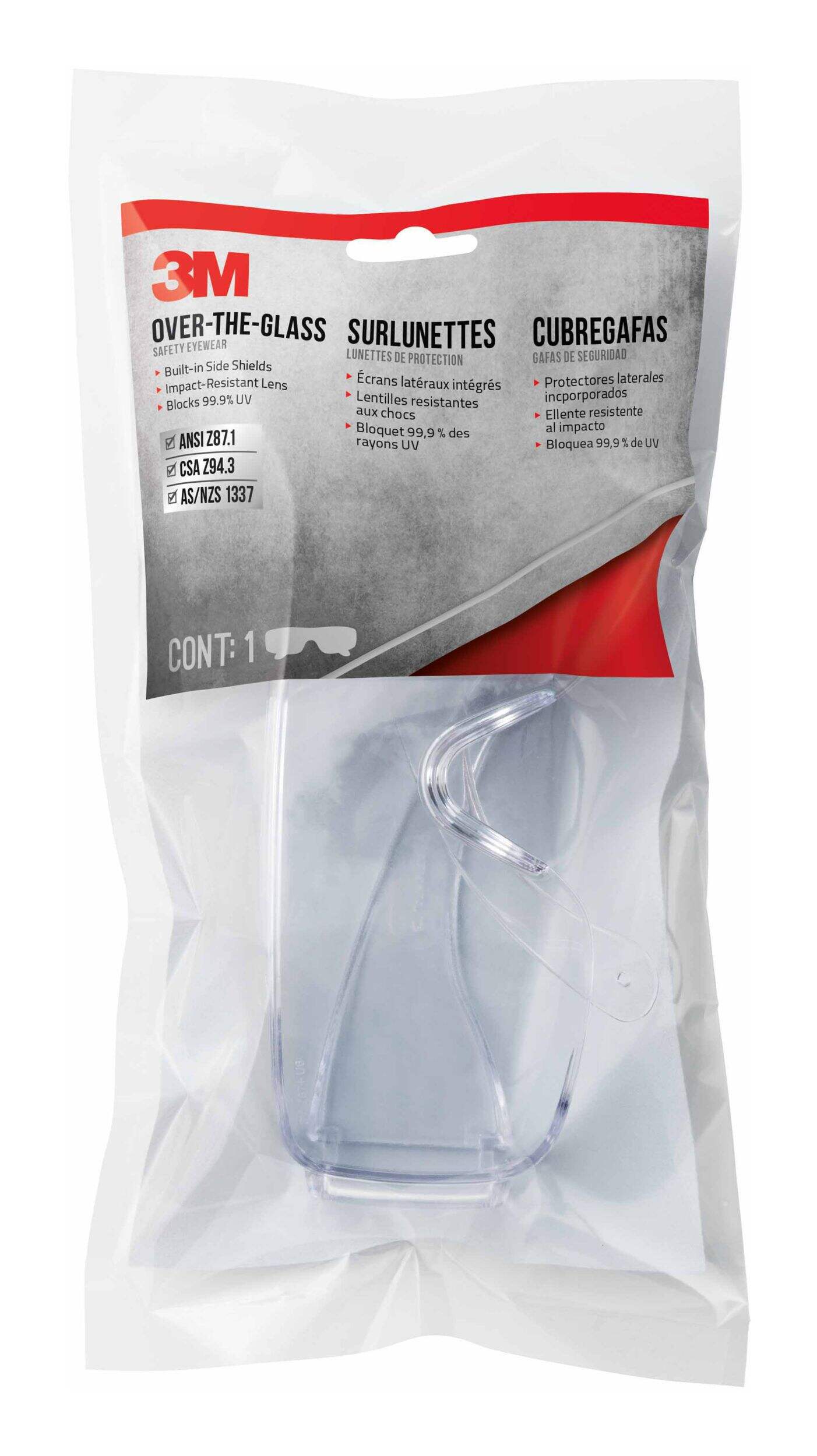Give your eyes the protection they deserve without compromising your sight with 3M™ Over The Glass Safety Eyewear. Specifically designed to wear over your prescription eyeglasses, this safety eyewear helps keep dirt and small flying particles out of your eyes and off your glasses while blocking out the sun's harmful UV rays. These safety glasses are designed to fit comfortably on your face and feature built in side shields that provide protection. The impact resistant, scratch resistant lens continues to perform from one project to the next. So whether you're woodworking in the shop or mowing your lawn, get the job done accurately and safely with the help of 3M™ Over The Glass Safety Eyewear.