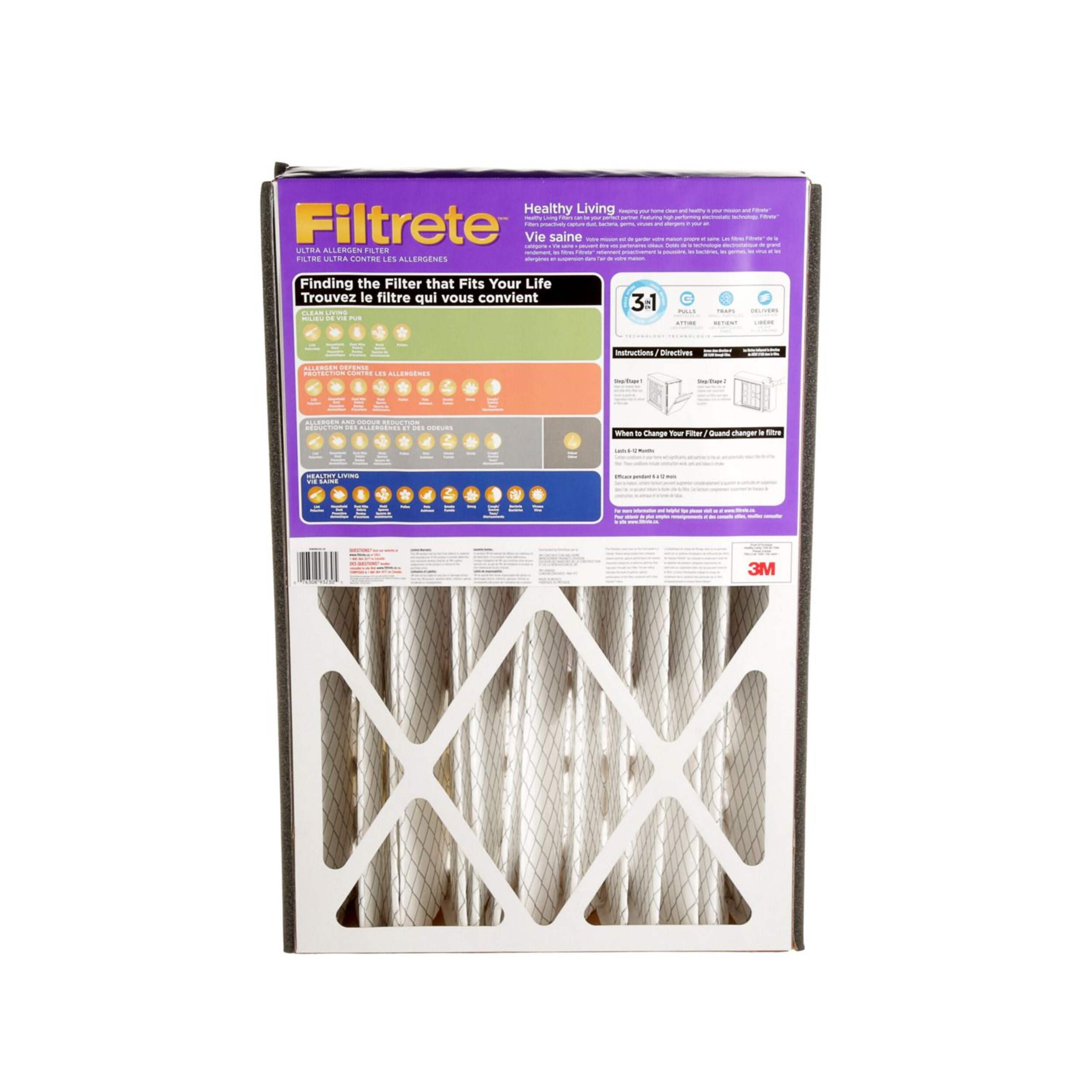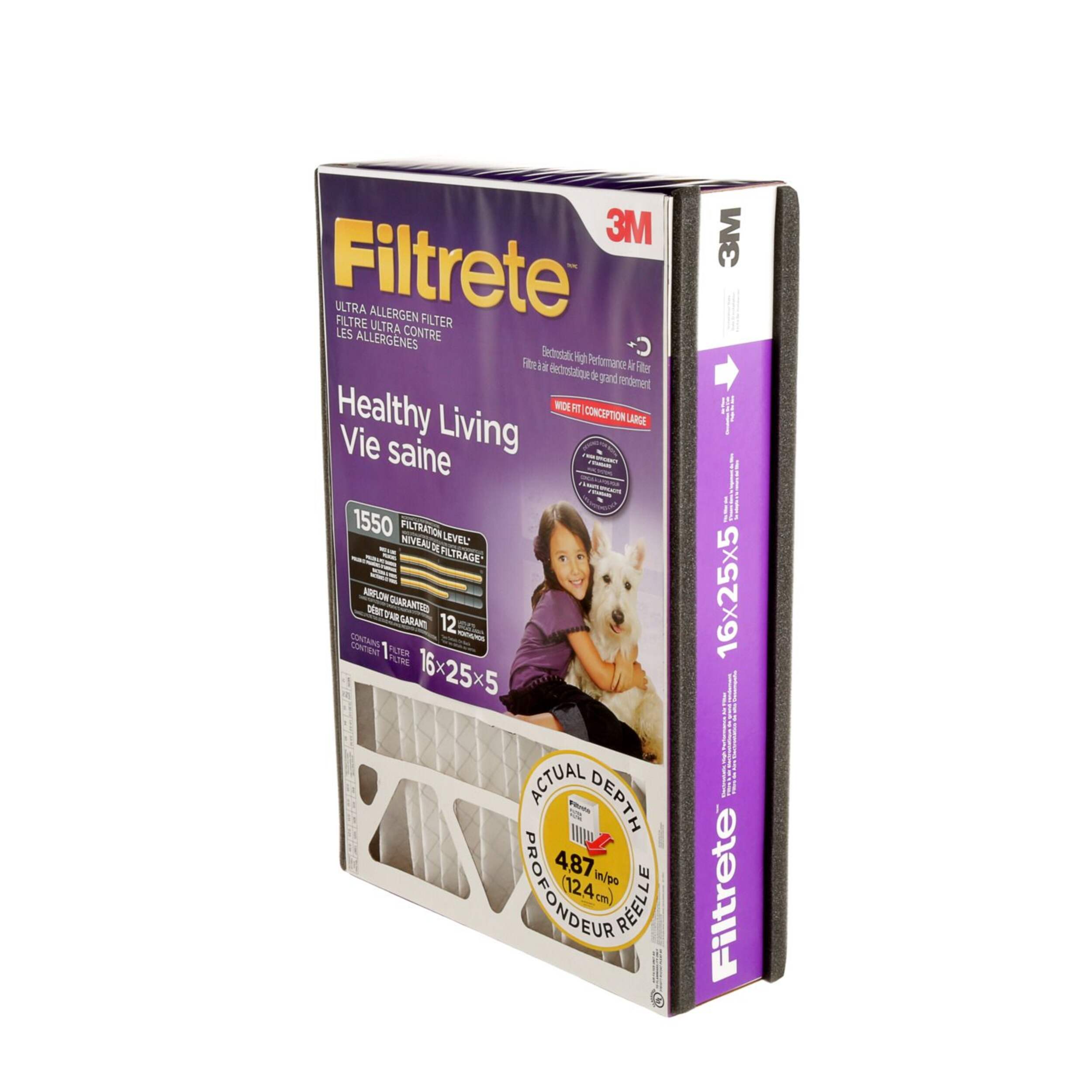 Breathe cleaner air with the 3M™ Filtrete™ Healthy Living Ultra Allergen Deep Pleat Air Filter. This high-performance filter uses electrostatic technology to capture microscopic allergens like pet dander, smoke, and dust, as well as larger particles such as pollen and mould spores. It works with your heating and cooling system to improve air quality and lasts up to 12 months, keeping your home healthier for you and your family.