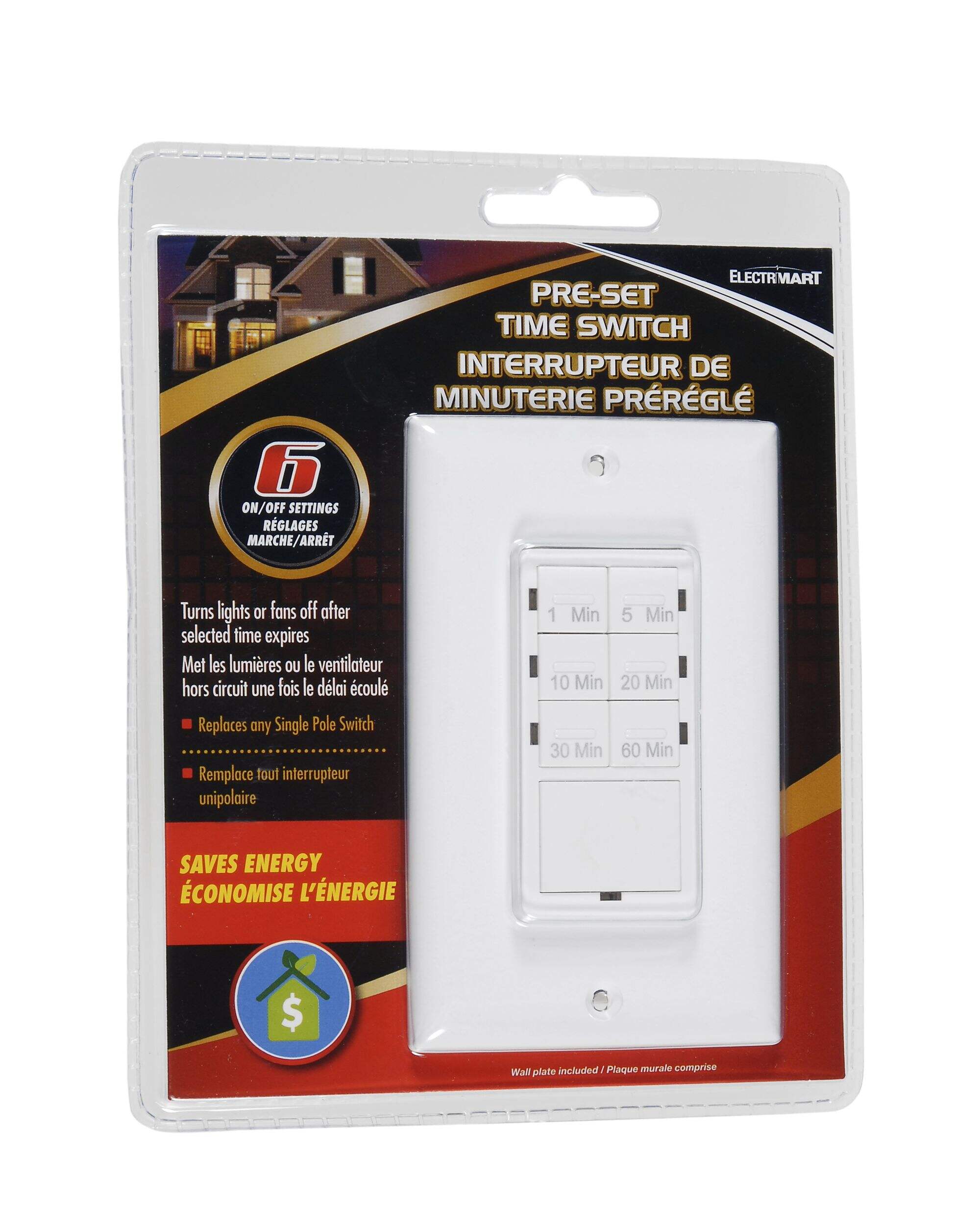 This timer switch features four preset buttons providing timers for 10, 20, 30, or 60 minute intervals. It's an excellent option for convenient timed control of lighting, heat lamps, hot tubs, porch lights, exhaust fans and more. This efficient timer saves energy and features simple DIY installation for easy use.
