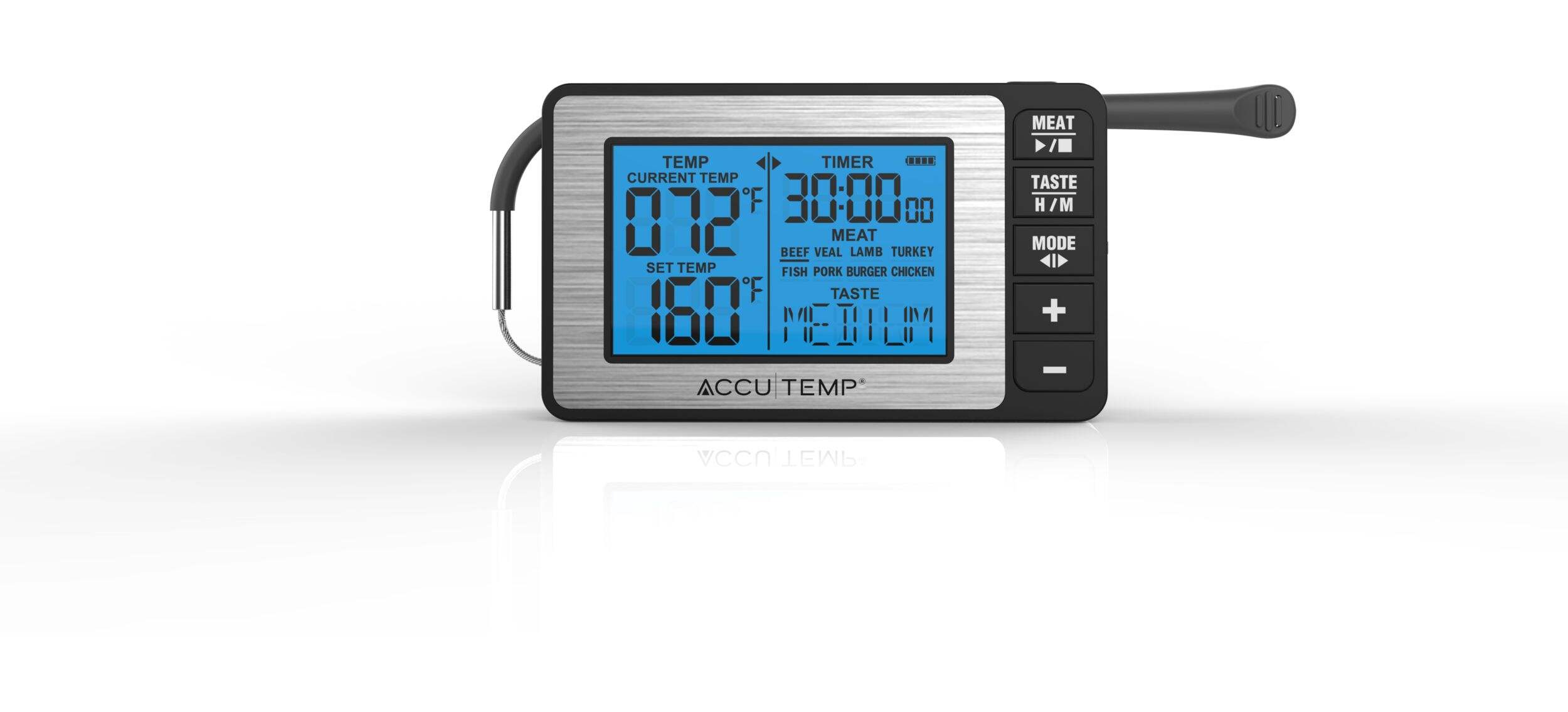 Integrated timer can be used independently or in conjunction with the thermometer function