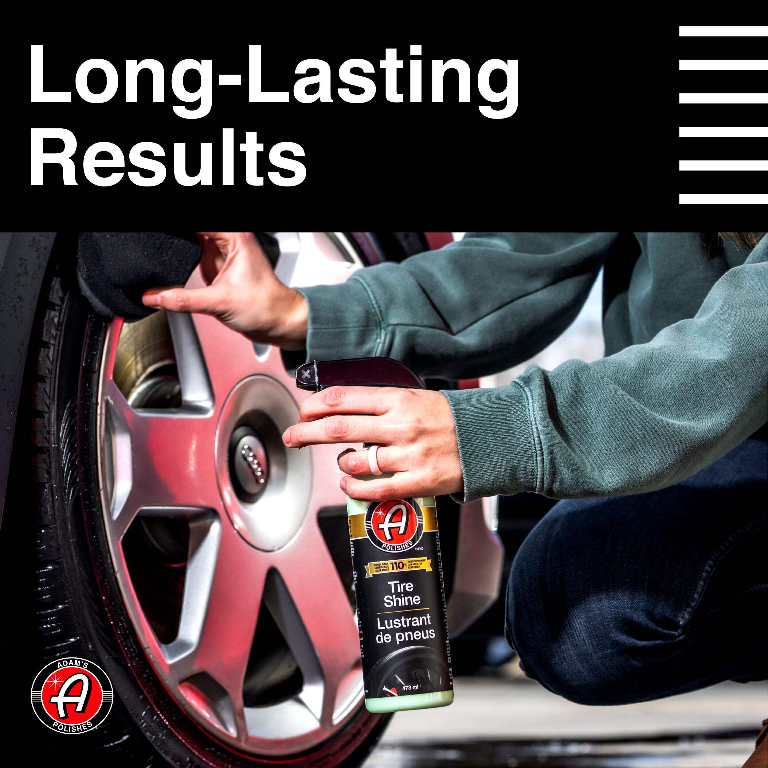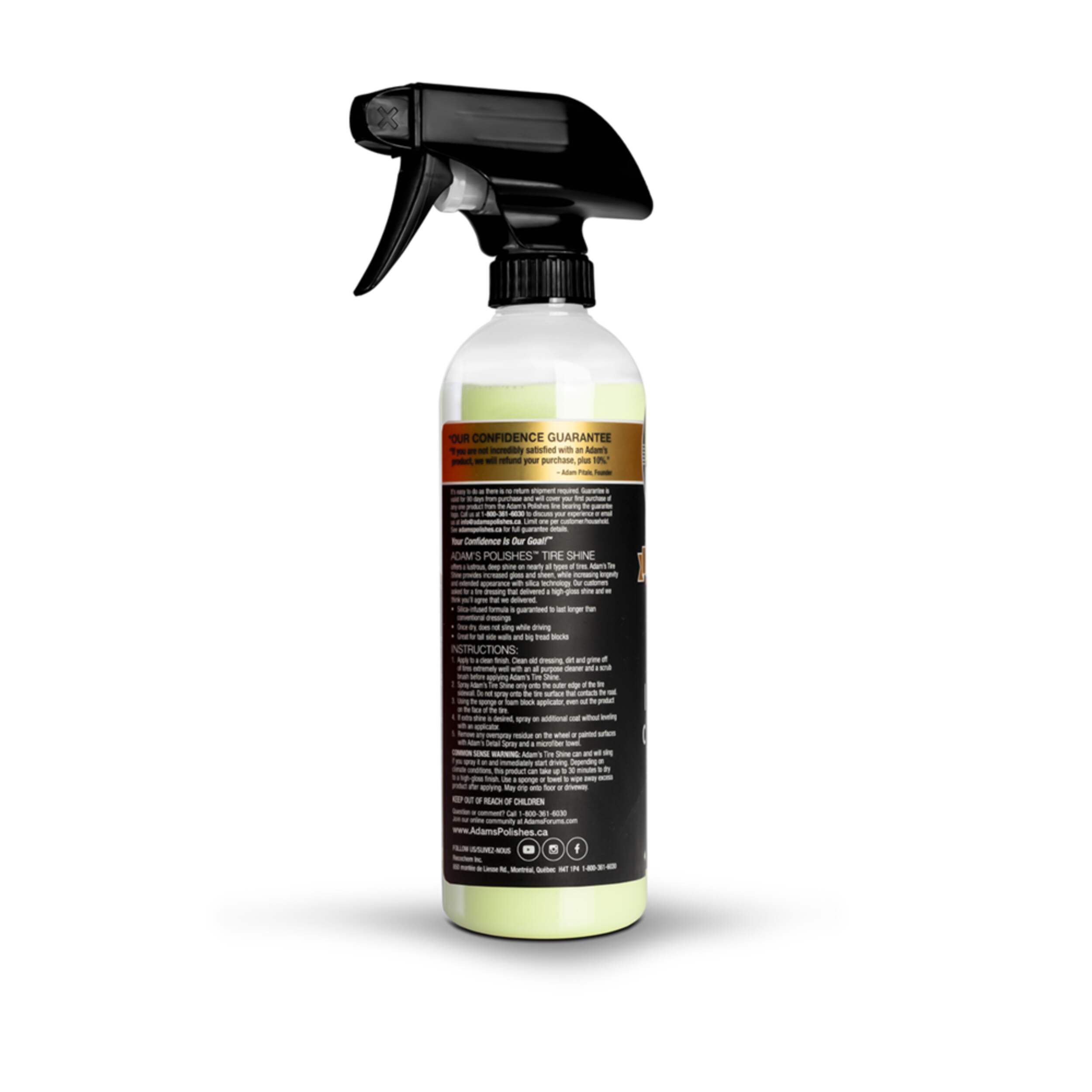 Love that dark, lustrous shine that makes tires look fresh? Adam’s Polishes Tire Shine gives your tires that high-gloss, rich, wet tire look that keeps your ride looking pristine with lasting SiO2 protection. A colourless crystalline compound, the SiO2 creates a hardened layer of defense, ideal for ceramic paint surfaces. With our enhanced silica-infused formula, Adam’s Polishes Tire Shine provides longer-lasting results with 2-3 weeks of protection per application.