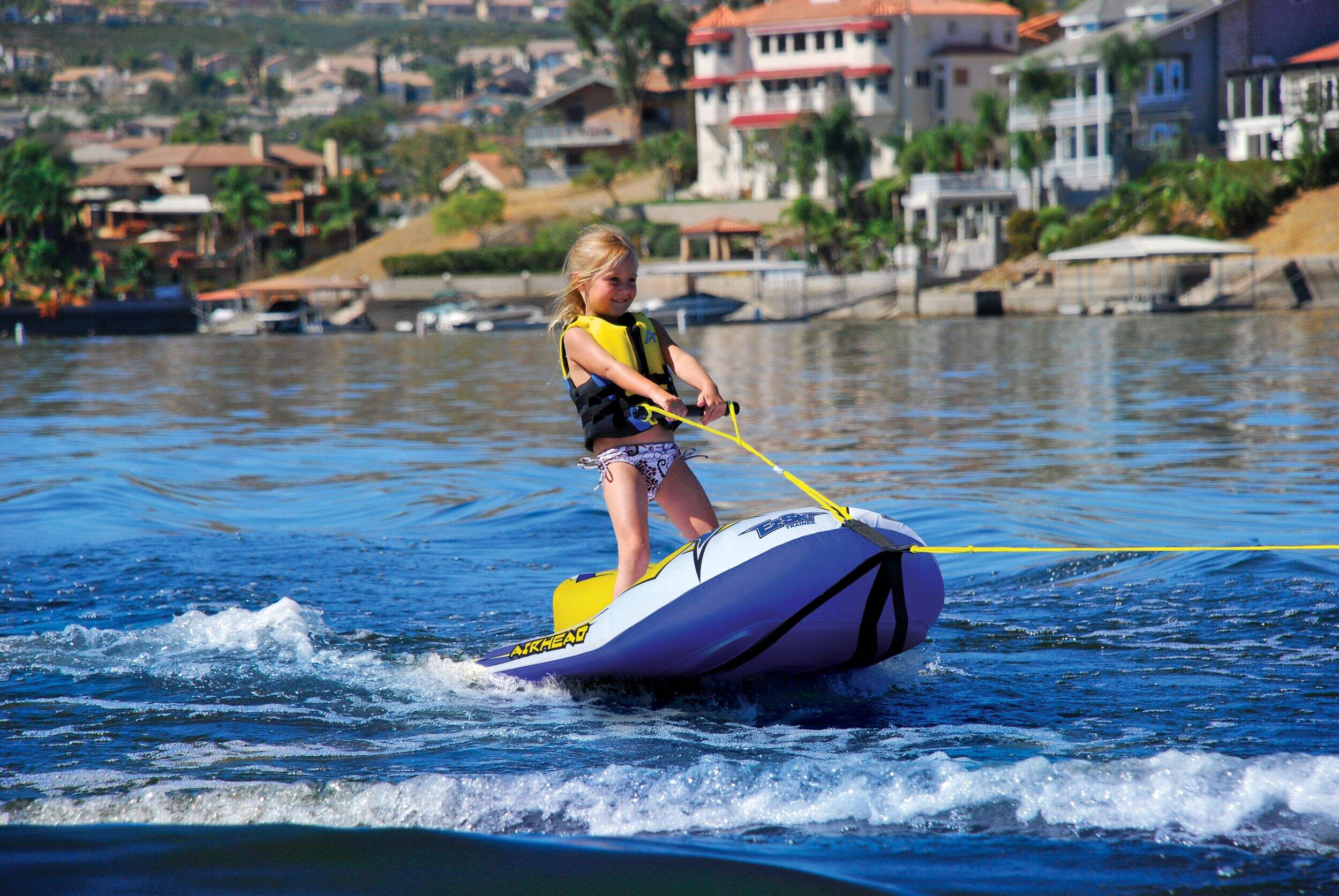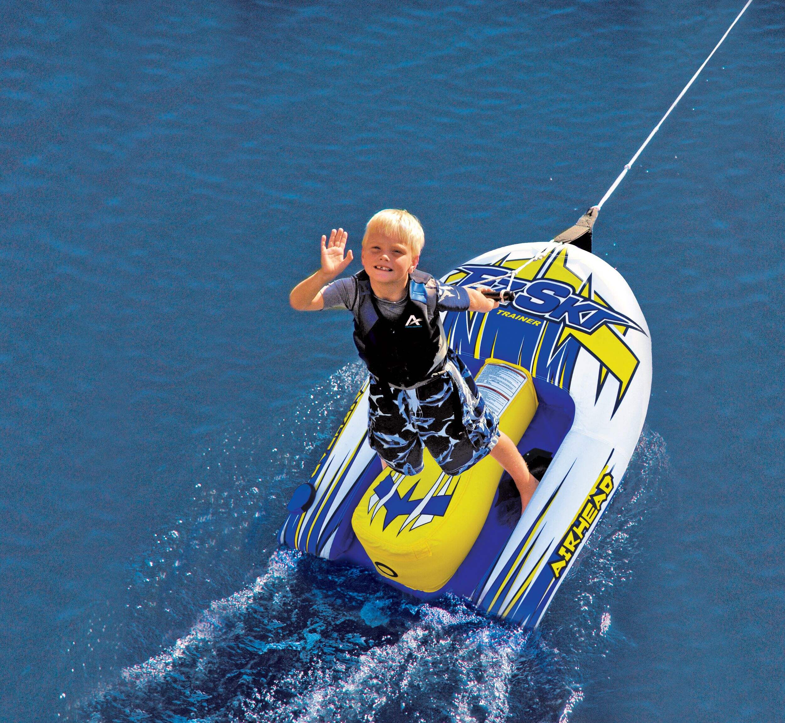 Teaching new water skiers doesn’t have to be stressful. EZ Ski is an inflatable / ski hybrid that takes the tears out of teaching new riders and makes the entire experience safe and exciting for everyone. Instead of fighting with diving skis and unruly ropes, riders board the EZ Ski directly from the back of the boat—no swimming necessary. These beginner water skis help learners get up on their board in a flash. Then, can spend more time feeling out the speed and sensation of being pulled behind the boat. After spending a little time with the EZ Ski, kids will learn basic skiing fundamentals including proper stance, handle position, balance and weight transfer for turning.