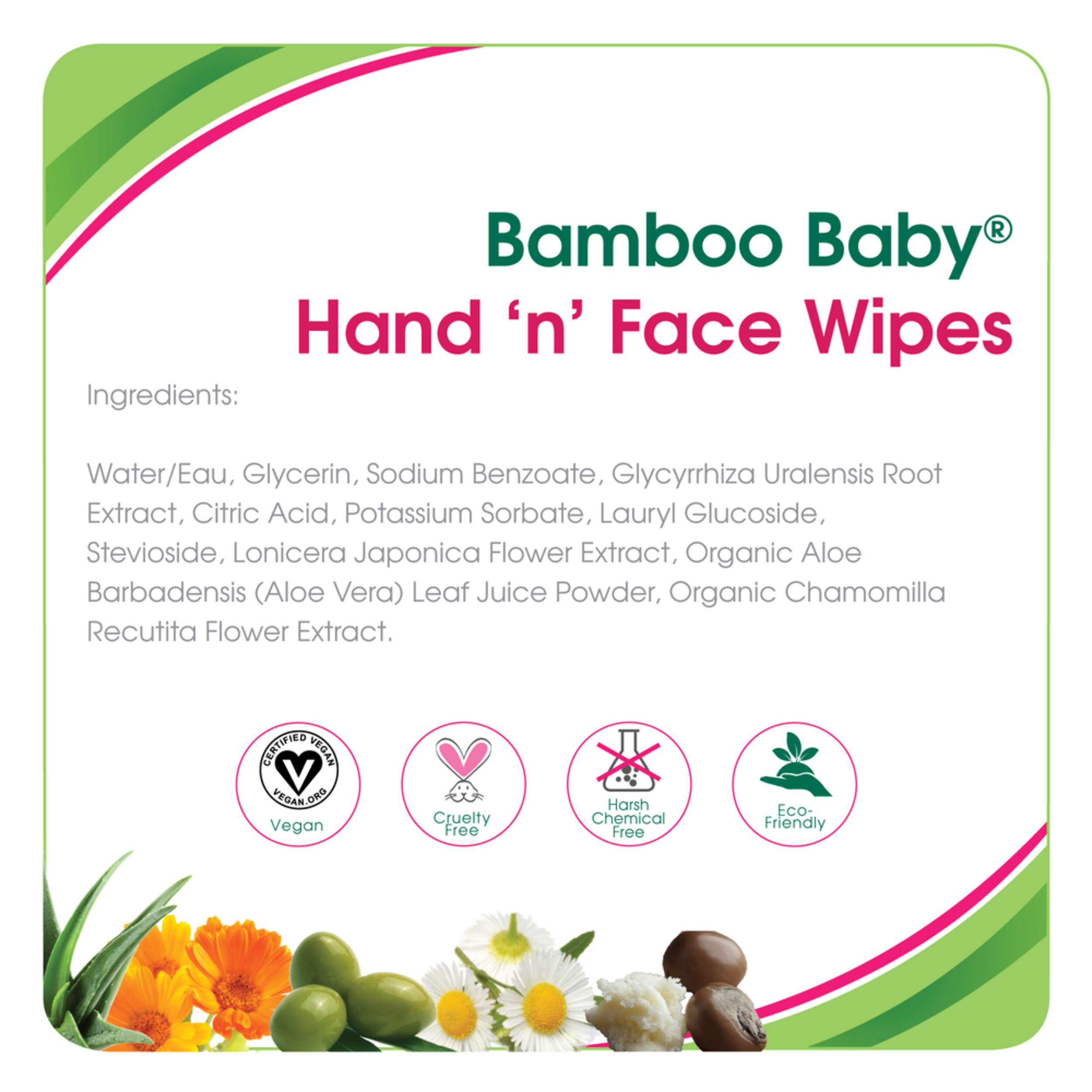 Includes 3 packs Bamboo Baby® Wipes, Bamboo Baby® Pacifier and Toy Wipes 30-ct, Bamboo Baby® Nose 'n' Blow Wipes 30-ct, Bamboo Baby® Hand and Face Wipes 30-ct
