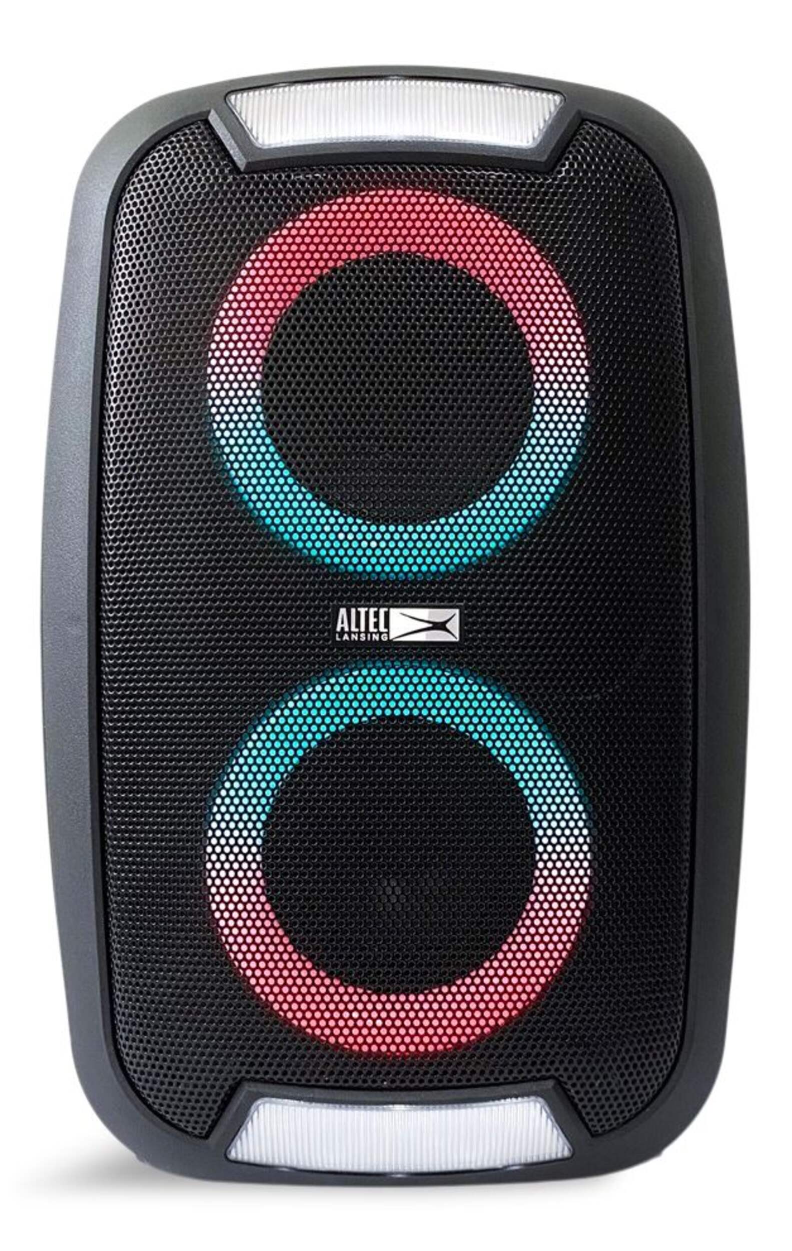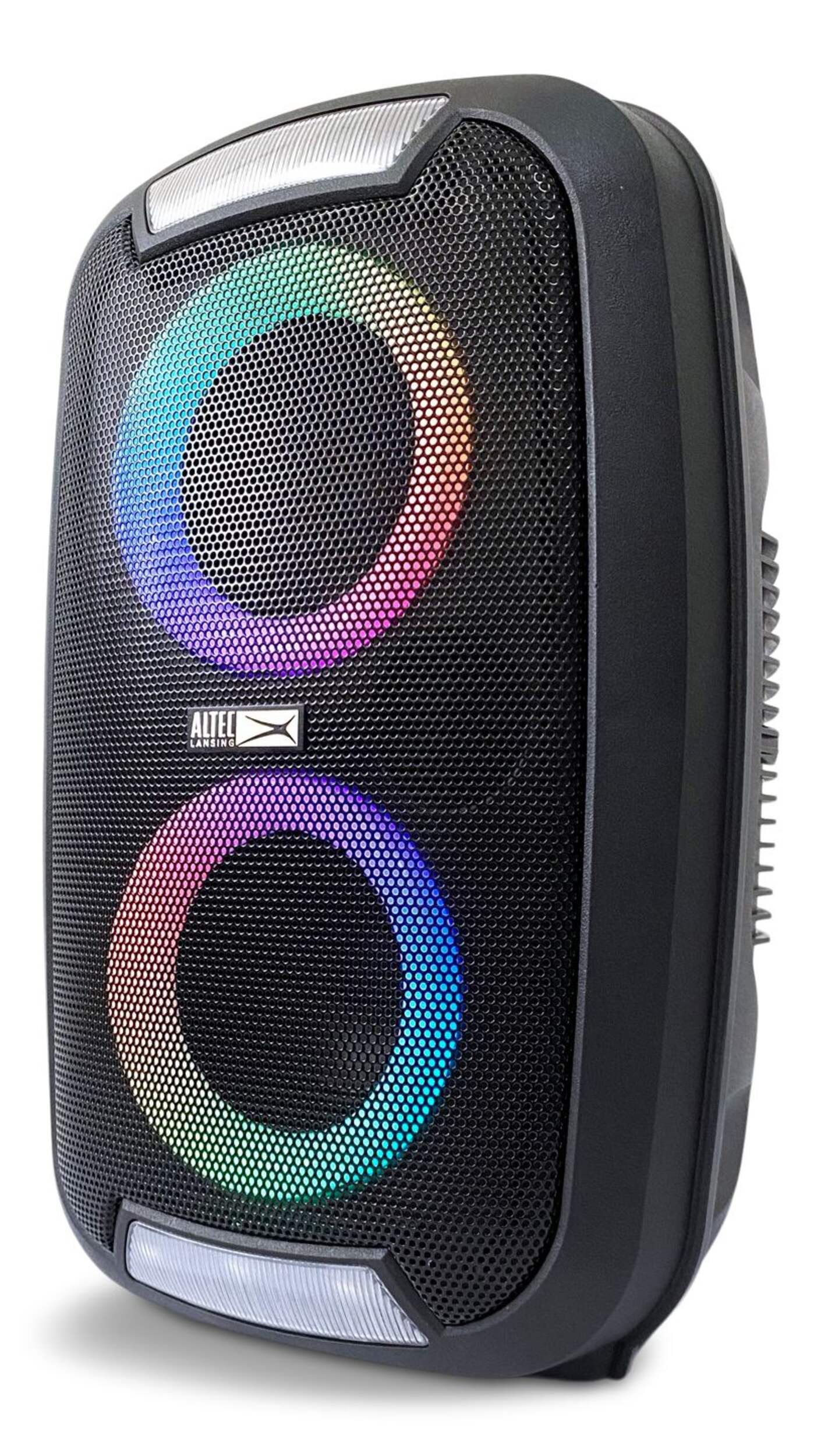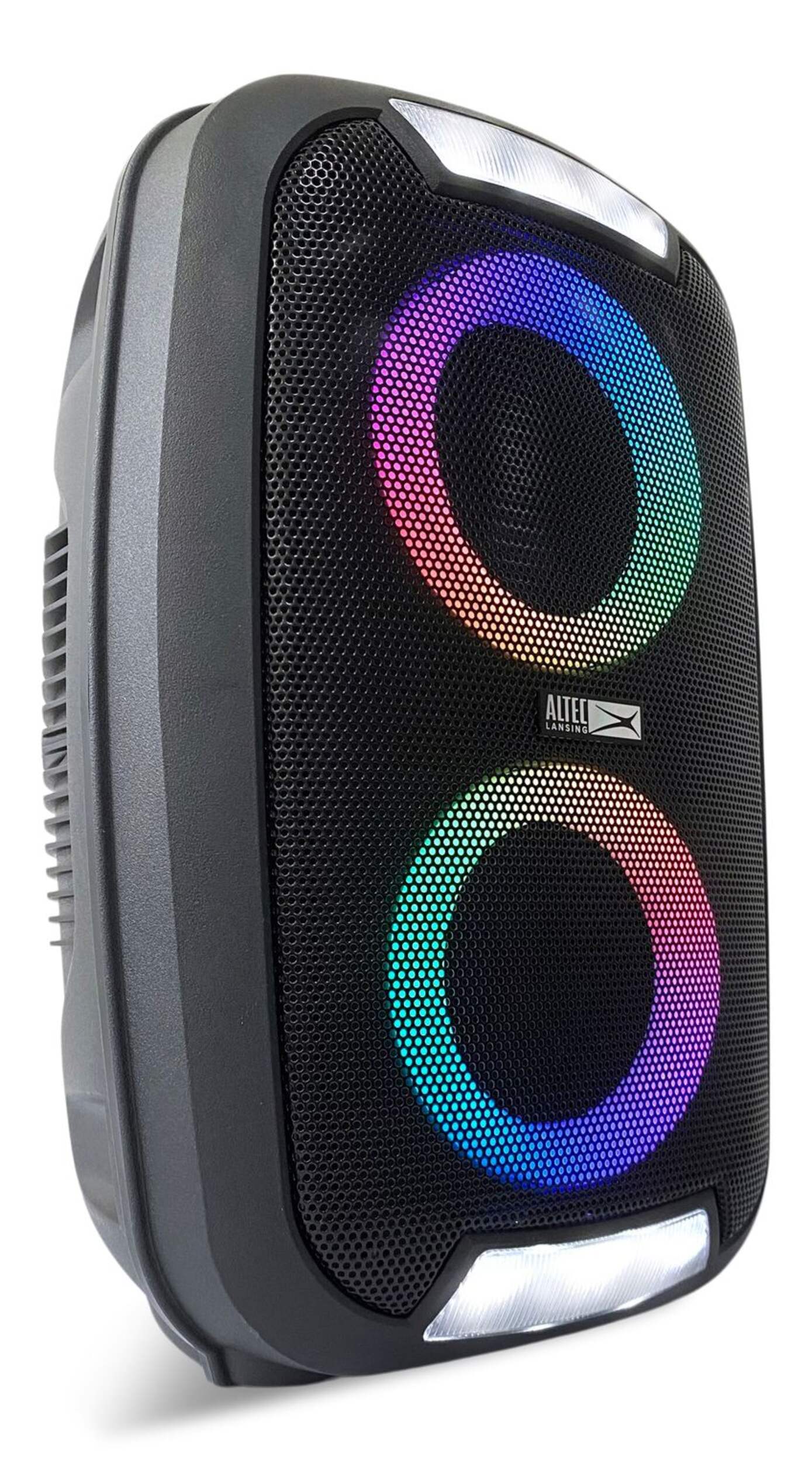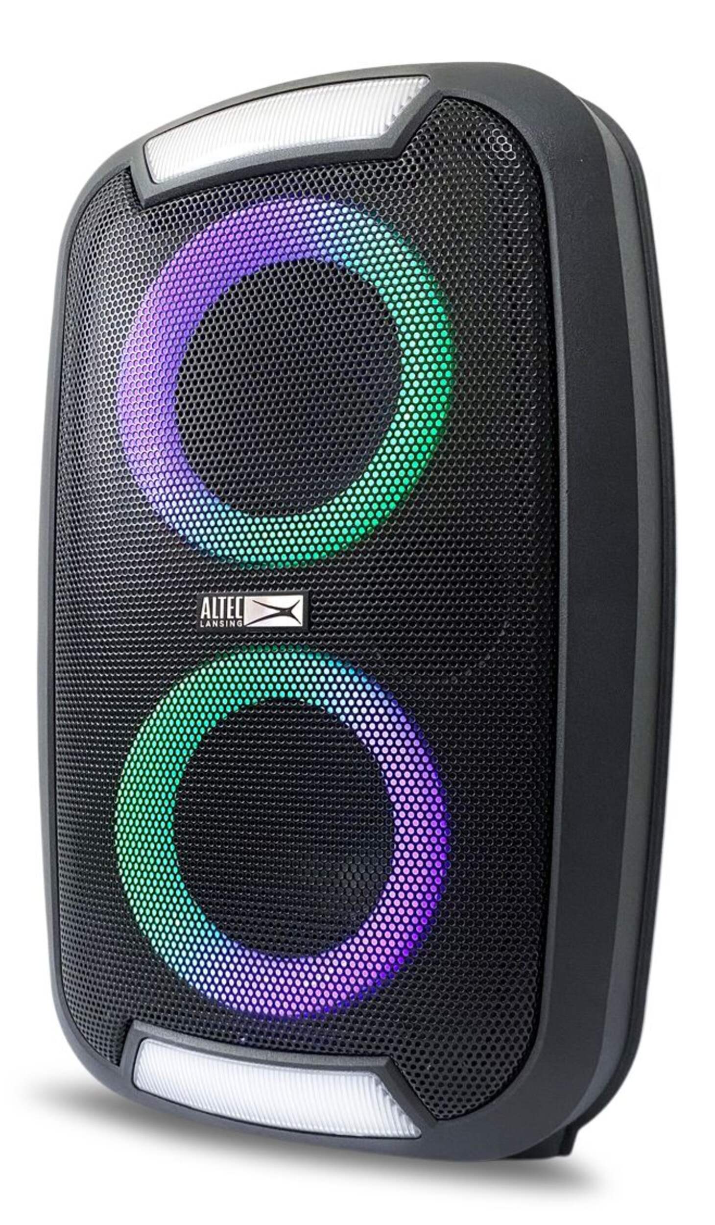 The Altec Lansing Portable LED Double Speaker delivers powerful stereo sound and dynamic LED light displays, making it perfect for parties, outdoor events, and daily listening. With wireless Bluetooth connectivity, it streams music effortlessly from any compatible device. The 4-in dual speakers provide immersive sound, while the built-in LED lights create a vibrant atmosphere. Compact and portable, this speaker is ideal for on-the-go entertainment.