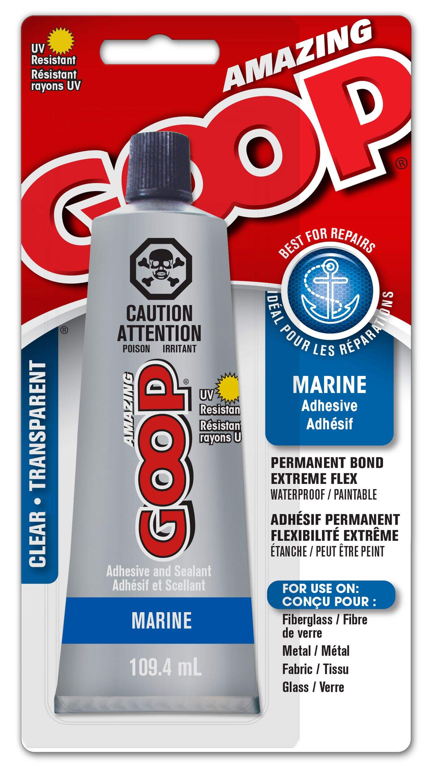 Amazing GOOP Marine Adhesive & Sealant, 109.4-mL, is one of the strongest, most flexible all-purpose adhesives ever created! It's designed to adhere to virtually any surface with superior strength. Sturdy enough to seal cracks in cement or adhere new handles on garden tools Amazing GOOP is perfect for just about any repair! Also available in a bigger 301.6 mL size (CT# 079-0122), that is sold separately.