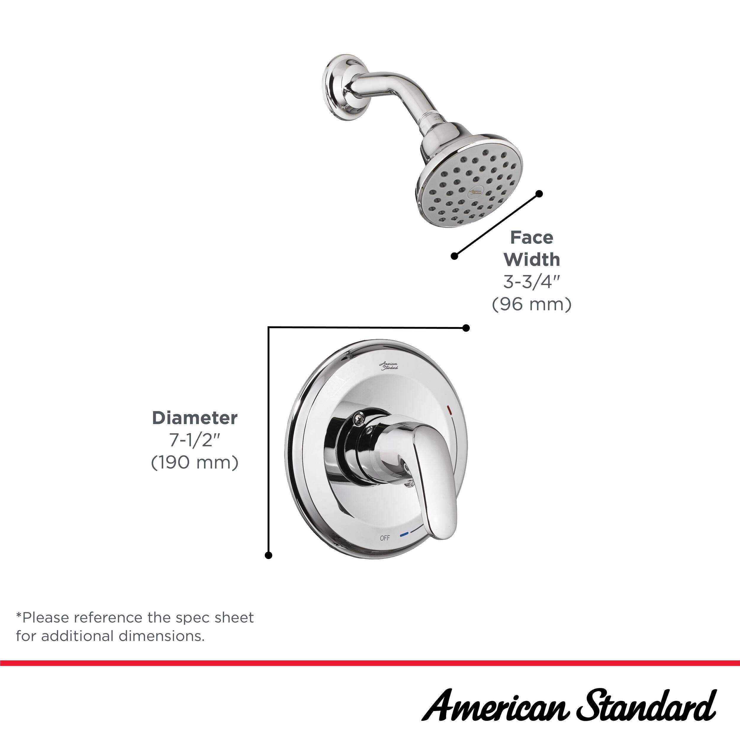 The American Standard Colony PRO Chrome Tub & Shower Trim Kit combines elegant form with water-saving function. The kit’s chrome design provides a polished look that’s suitable for most contemporary bathrooms. The kit includes a 3 3/4” showerhead that optimizes shower spray by limiting water usage to 1.75 GPM. Easy-to-read pressure balance cartridge indicators allow for safe temperature control. For fast installation, the kit includes a shower arm, flange, wall escutcheon, and diverter tub spout. Designed for use with Flash valves (sold separately), this kit delivers an invigorating shower experience without sacrificing style or sustainability.