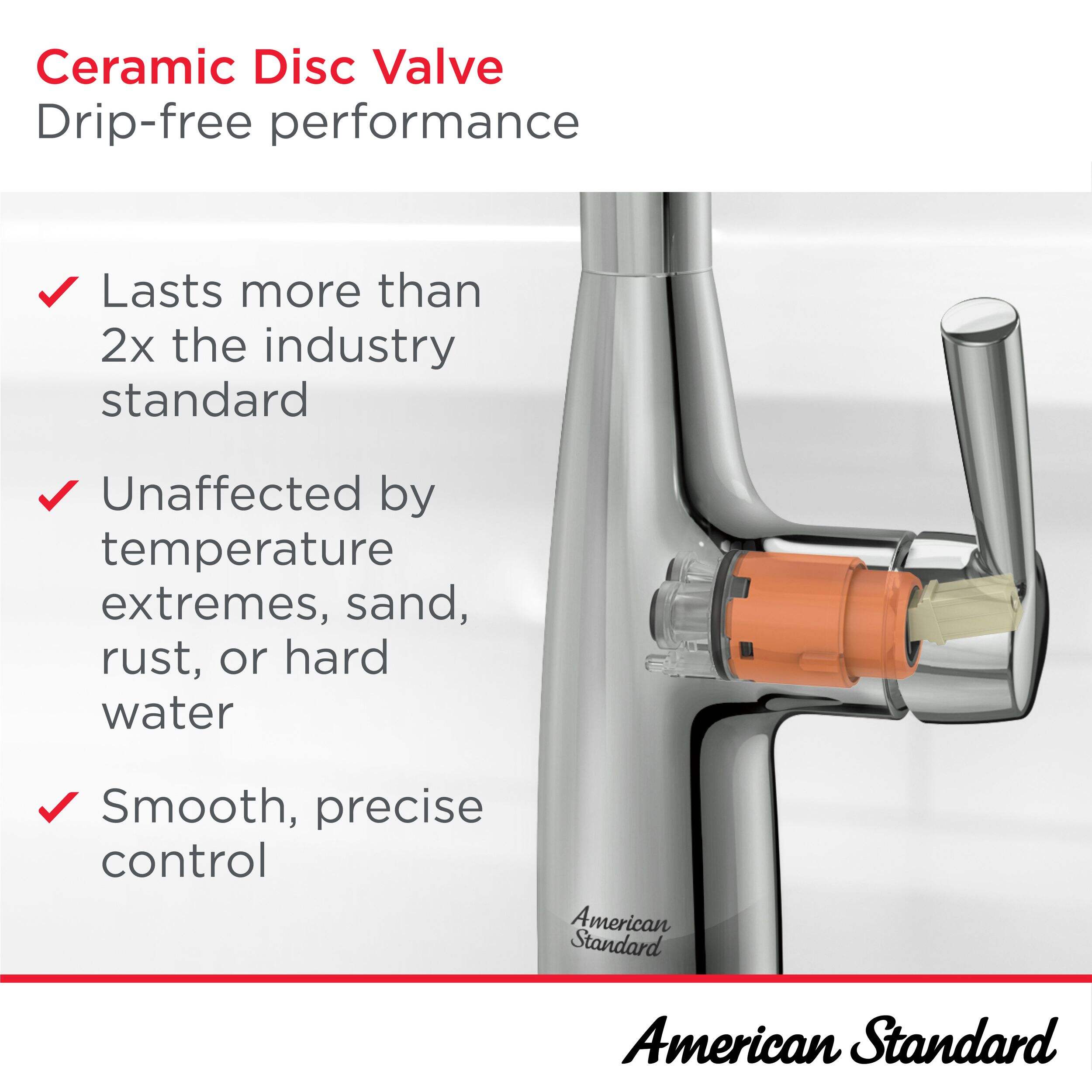 The American Standard Studio S Chrome Pull-Down Bar/Prep Kitchen Faucet features a Re-Trax pull-down system that ensures smooth retraction of the spray head after use