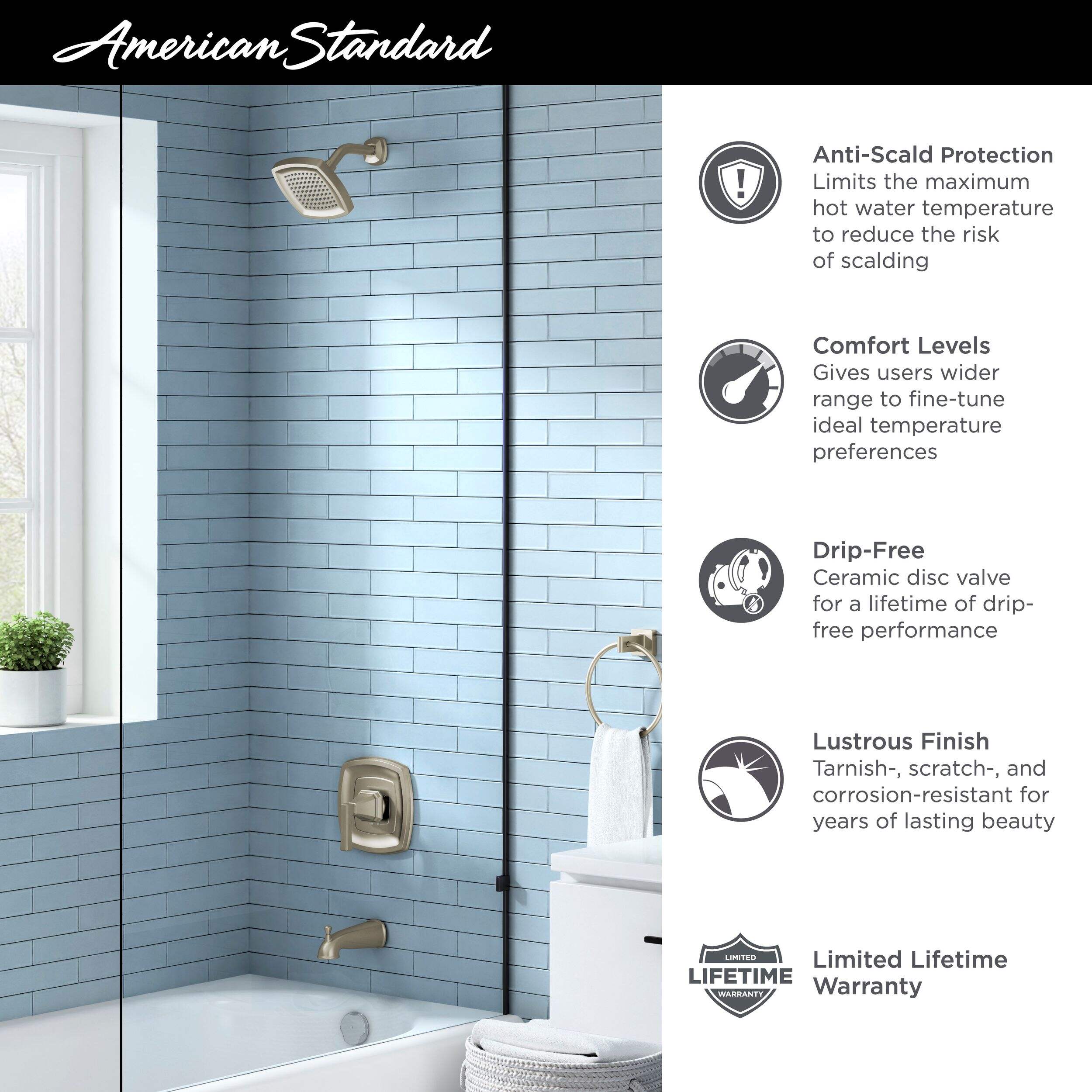 The American Standard Westerly Brushed Nickel Tub and Shower Trim Kit brings transitional style to your bathroom. The kit contains an anti-scald pressure balance valve that prevents accidental scalding, as well as a ceramic disk cartridge that ensures drip-free performance. This ADA-compliant kit includes a diverter tub spout with a ½” female IPS connection and a 2.5 GPM flow rate. Installation of the trim requires the replacement of your existing valve with the variant included in the kit. Professional assistance is recommended to install this high-quality trim.