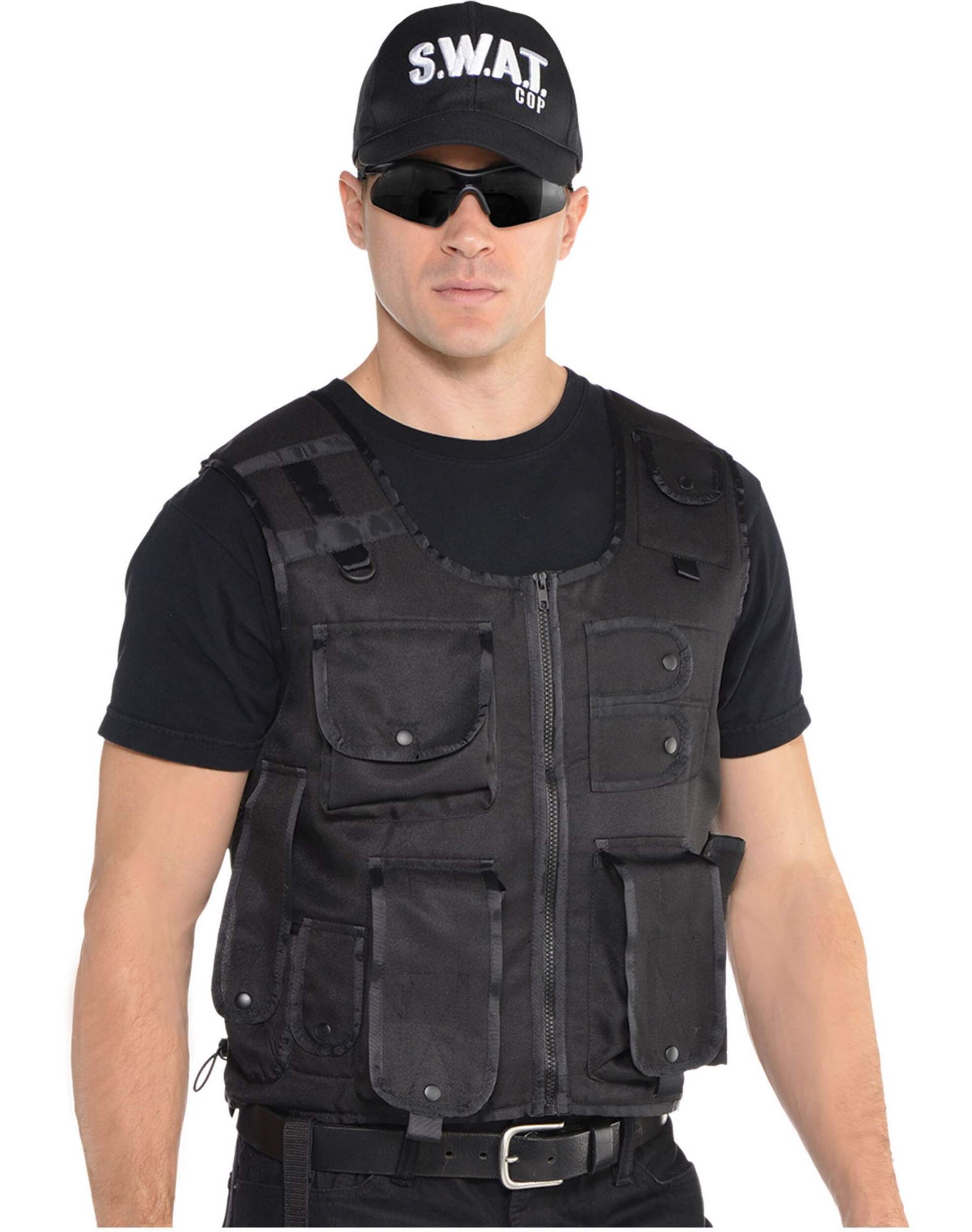 Add authentic detailing to your Halloween S.W.A.T team costume with the Amscan S.W.A.T Vest. This black vest features real and faux pockets, a "S.W.A.T. Cop" headline printed on the back, and a zipper front for easy on and off. Lace-up drawstring cord sides allow for custom comfort as you fearlessly police your Halloween party. Incorporate this S.W.A.T Cop Vest into your overall costume for a cohesive cop look. The vest measures 23.5-in from shoulder to hem, with its one size fitting most teens and adults.