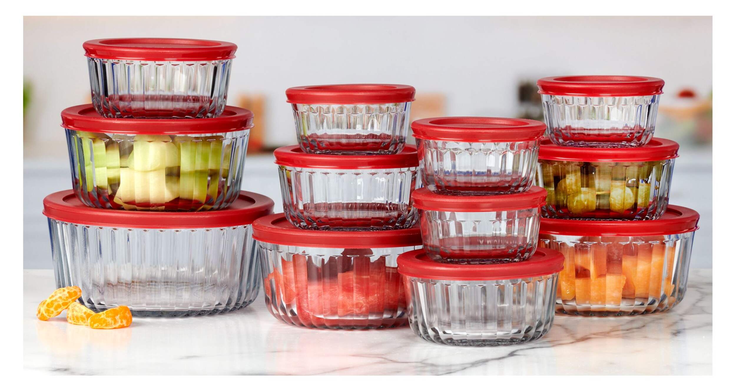 INCLUDES: (4) 1-cup, (4) 2-cup, (3) 4-cup, (1) 7-cup round glass food storage containers with red SnugFit lids