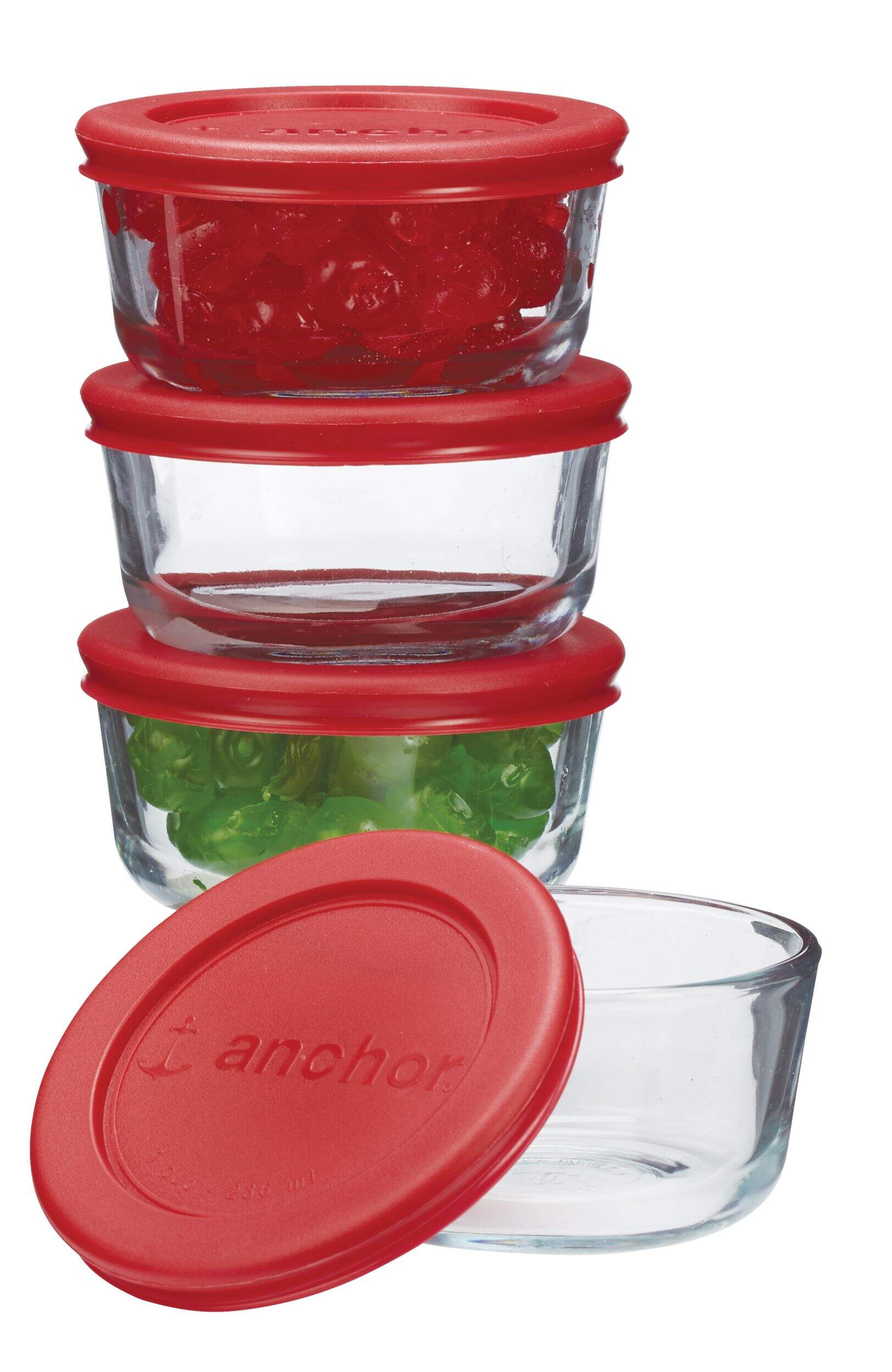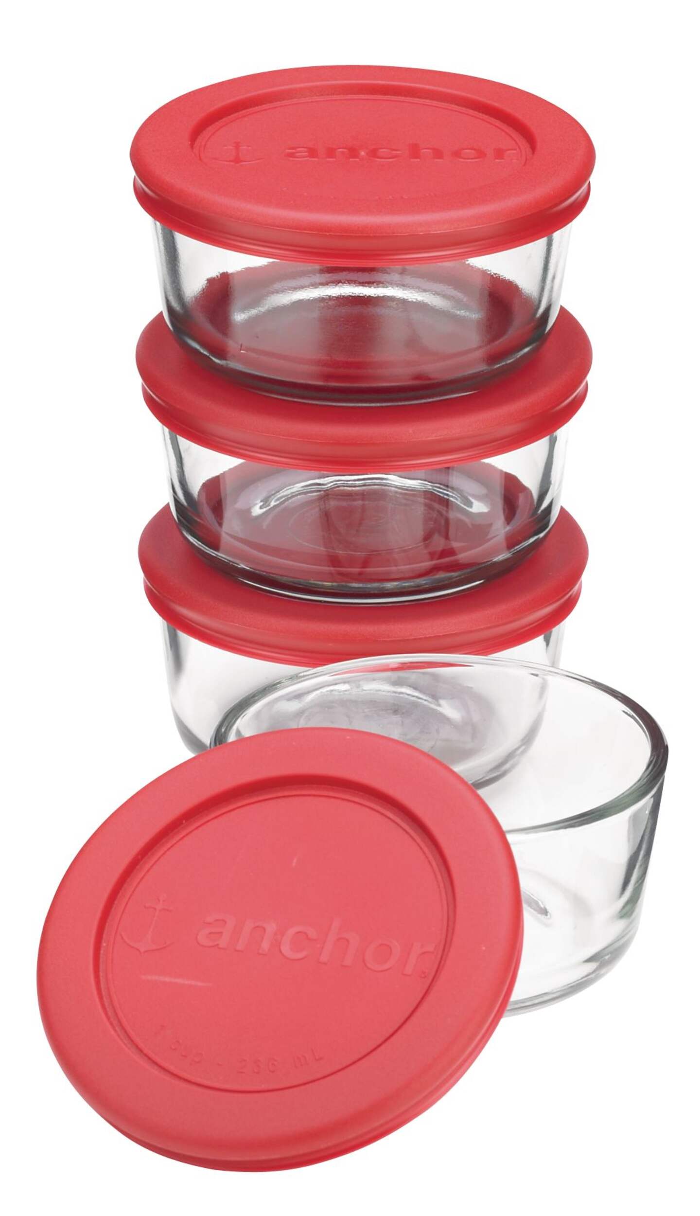 Includes four 1 cup round storage containers with four red lids