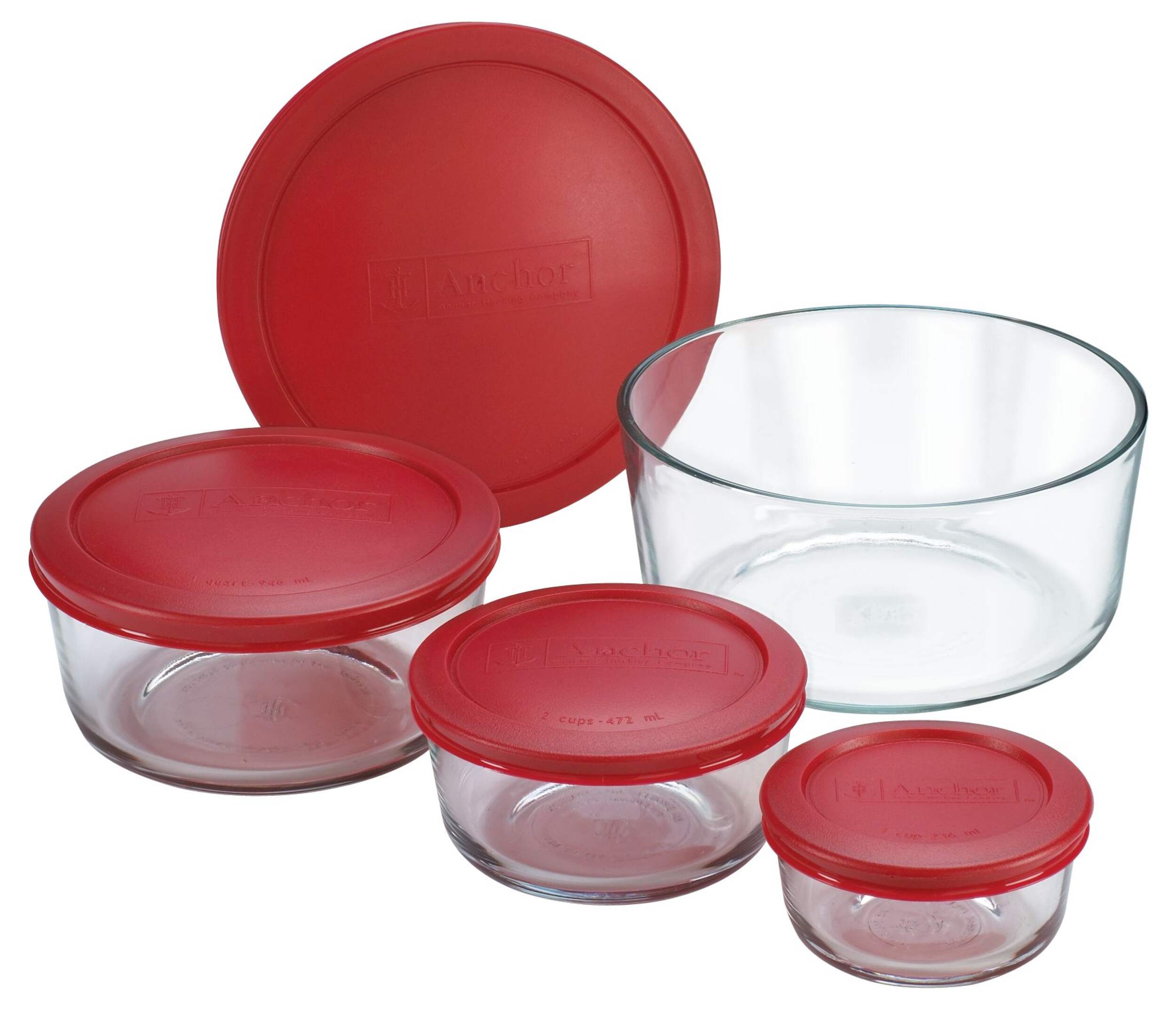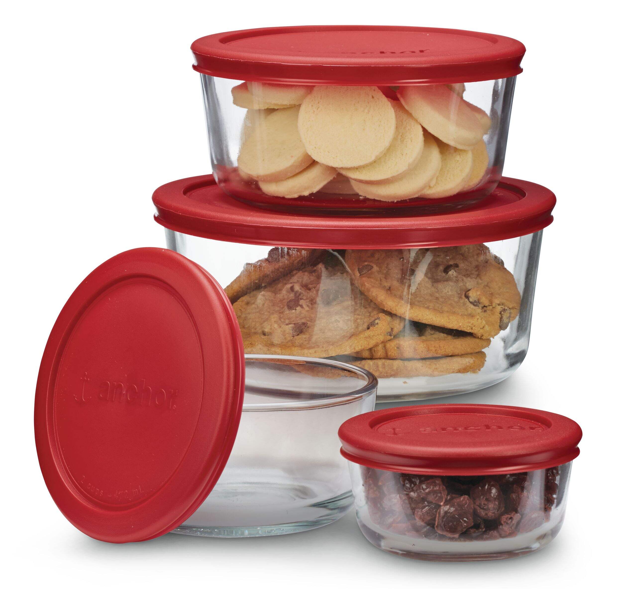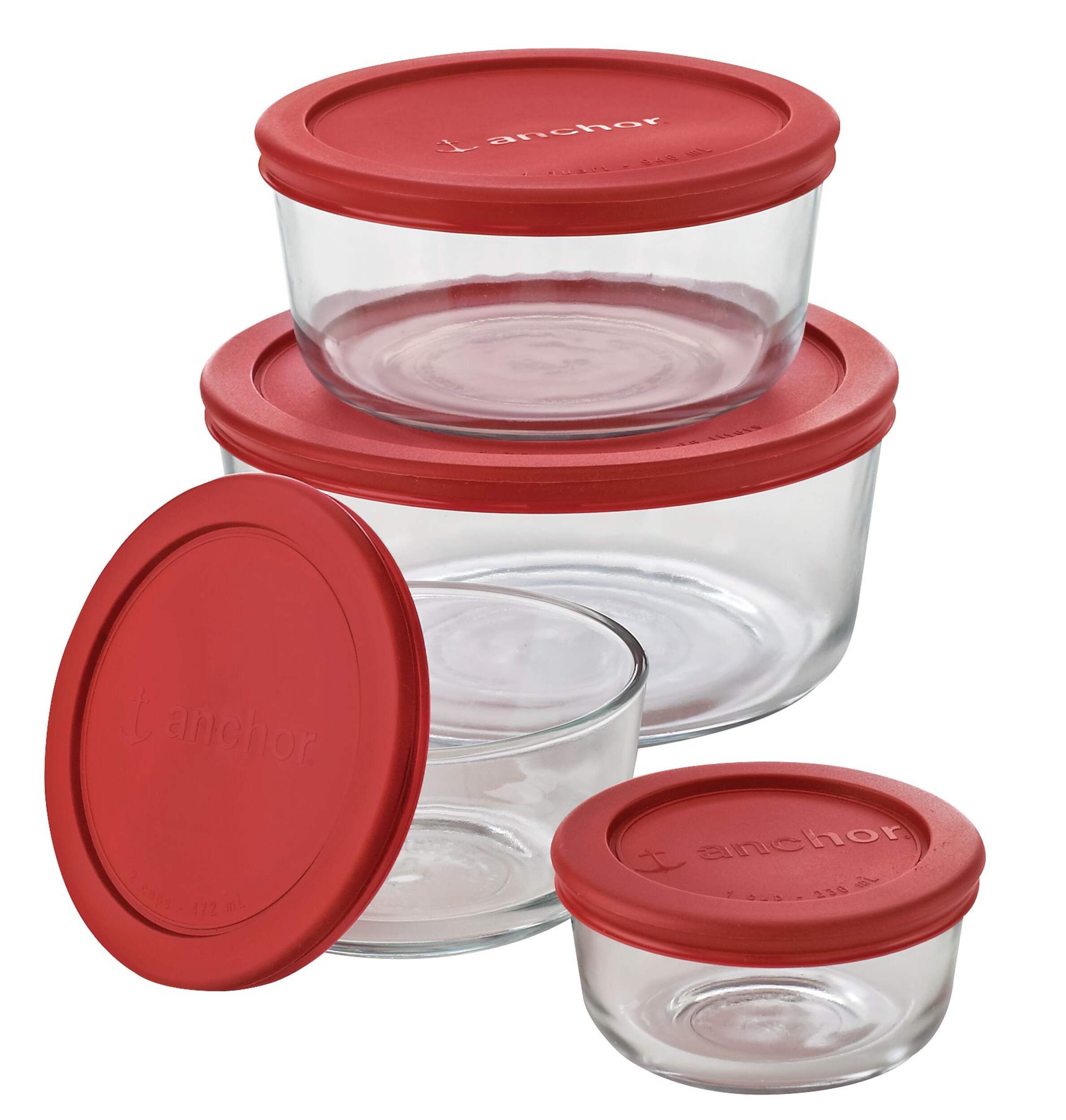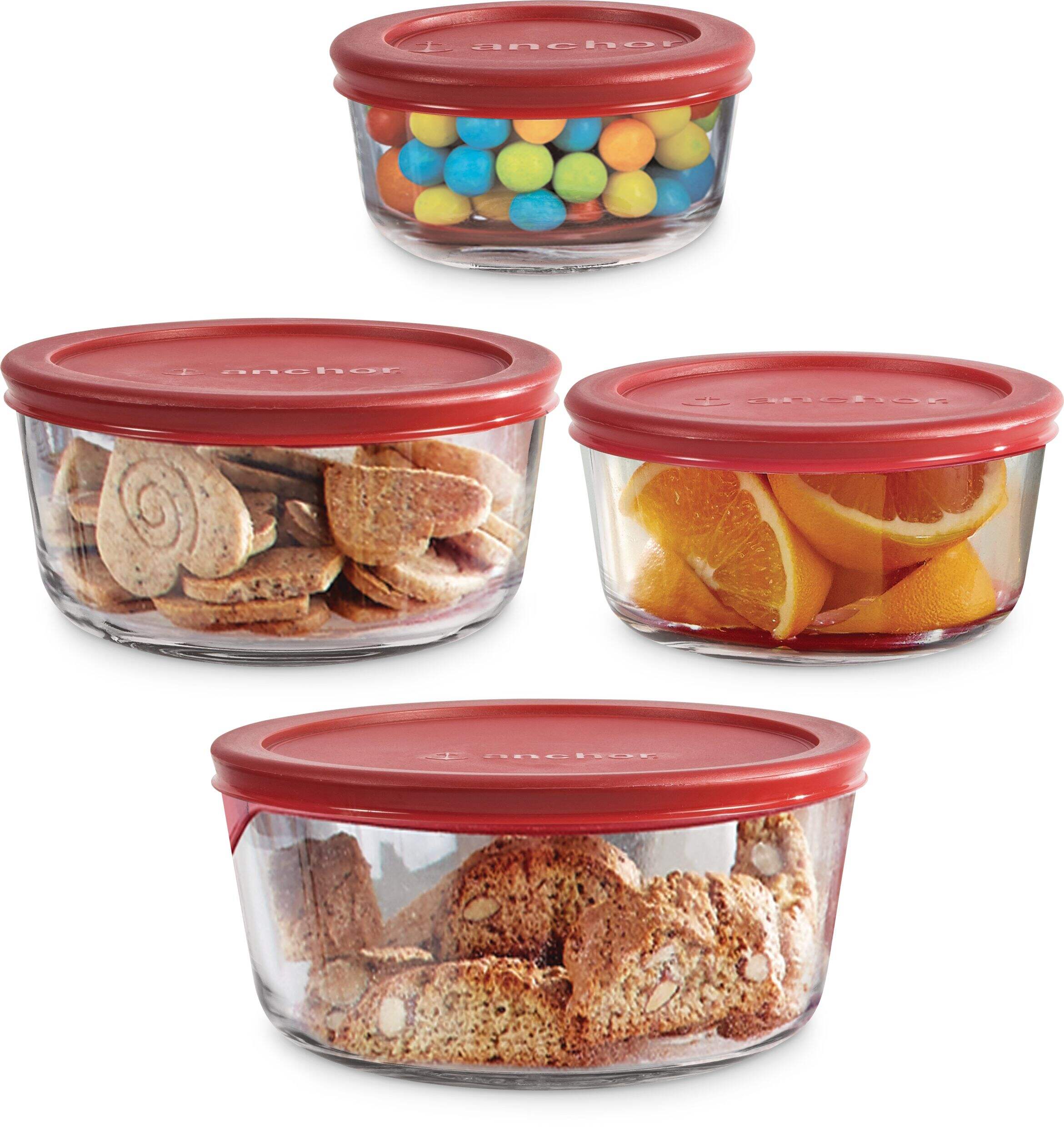 Store, heat or freeze a variety of different foods in the Anchor Hocking Round Glass Storage Set. The containers in this eight-piece set are ideal for keeping ingredients fresh and organized and come in a range of sizes to accommodate leftovers, bulk foods and more. The durable plastic lids help seal in freshness and feature a vented design to allow steam to escape when reheating. The glass containers allow for easy viewing, so you can quickly identify contents at a glance during meal prep or clean-up.
