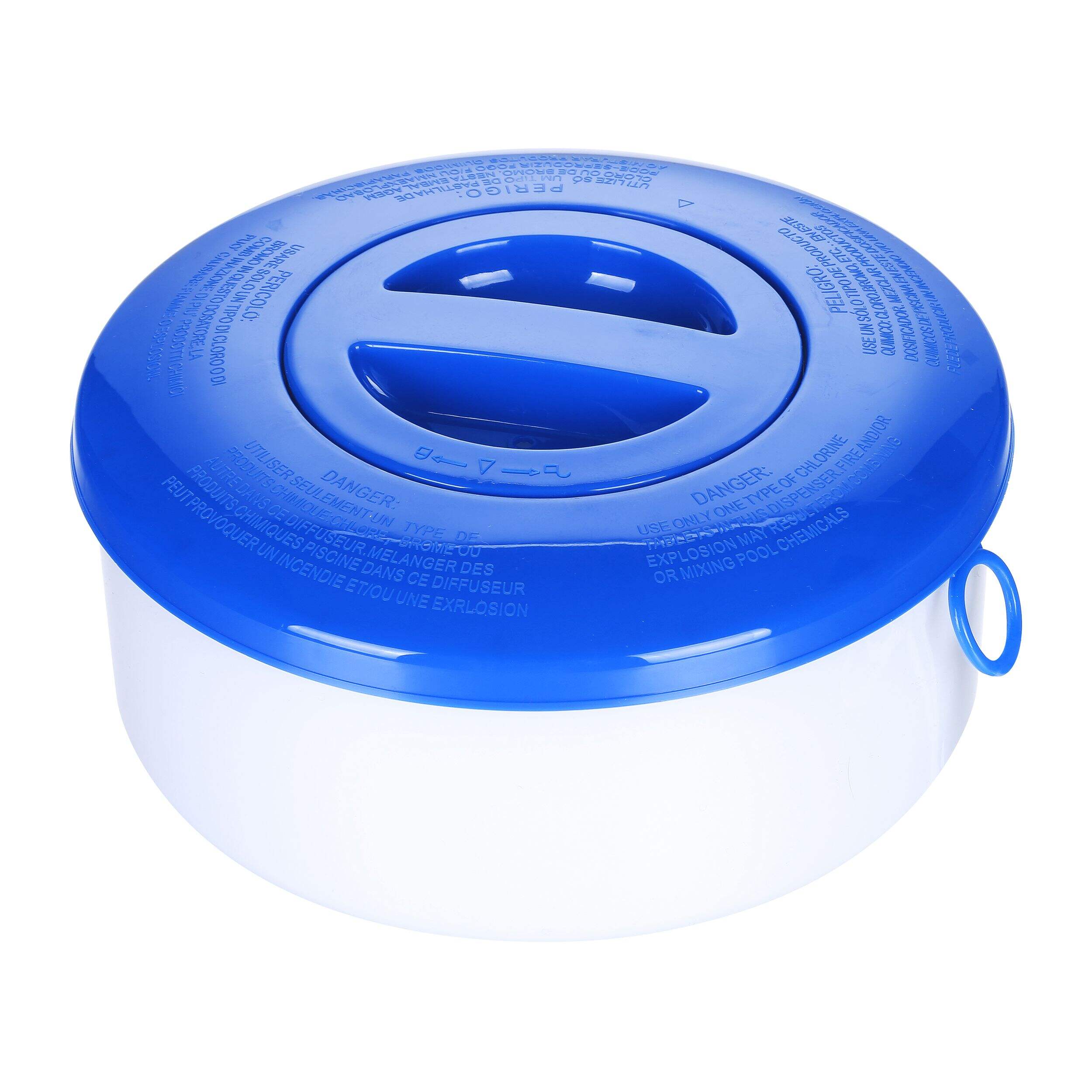 The Aquarius Floating Chlorine Dispenser provides an easy way to sanitize above ground pools. This floating dispenser holds up to 5 chlorine pucks (200g each) and has an adjustable water flow to regulate chlorine release. With a twist safety opening cover and durable construction, it conveniently dispenses chlorine gradually for crystal clear pool water all season. This above ground chlorine dispenser saves time and effort while keeping your pool hygienically clean.