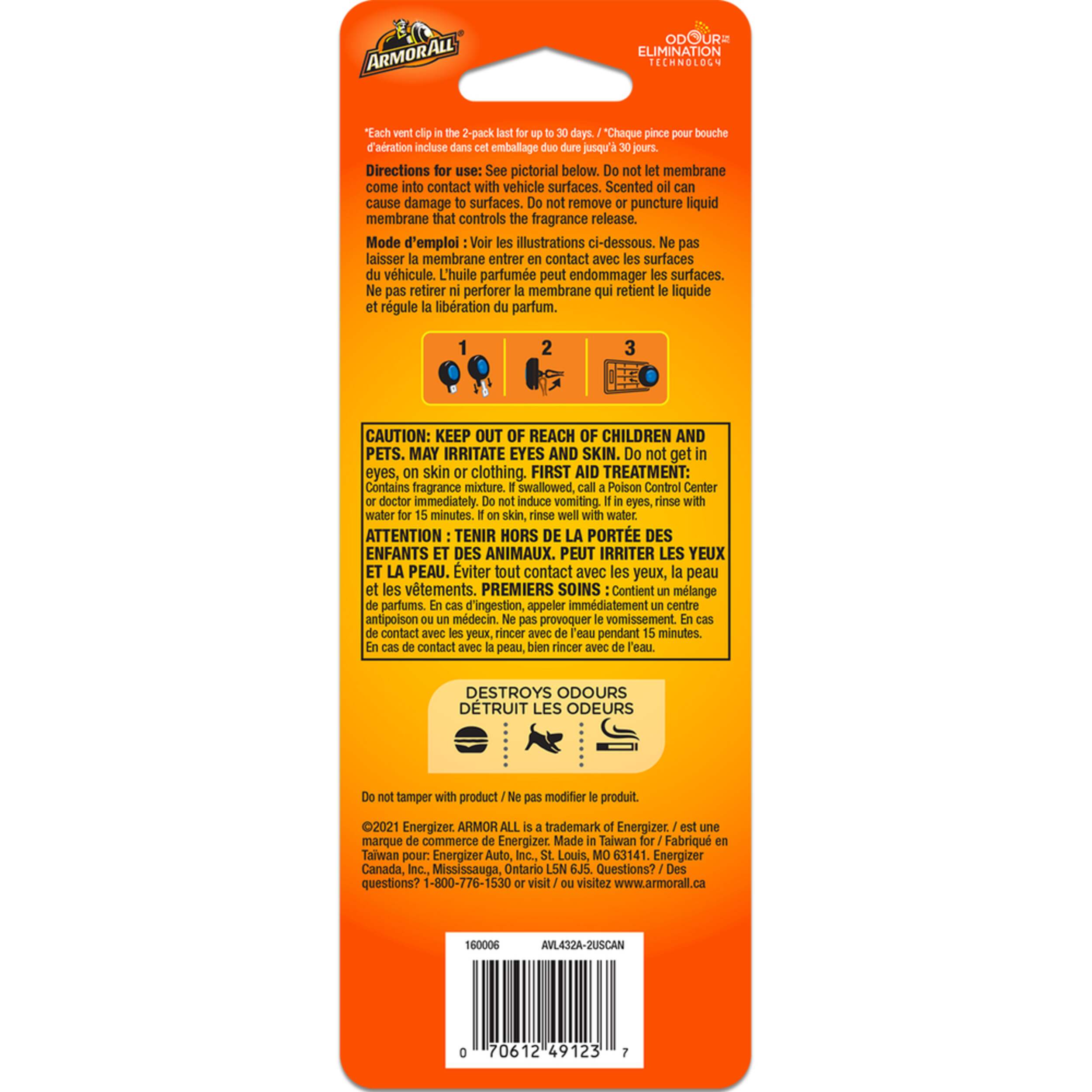 Armor All Fresh FX Arctic Cool Vent Clip Car Air Freshener delivers a refreshing car scent to your vehicle for up to 30 days. This car air freshener quickly and effortlessly destroys unpleasant vehicle smells from pets, food, smoke and other resources. With a summery blend of fruity and floral smells, this car air freshener brings together a mix of zesty bergamot and aromatic lavender, pine and juniper for a strong car scent. Simply clip this car air freshener onto an air vent in your car, truck or SUV for convenient, discreet air freshening. These car fragrances come in a sealed package to maintain their fresh scent until you’re ready to open them. Help keep your car smelling like new with Armor All, one of the most trusted names in car care.