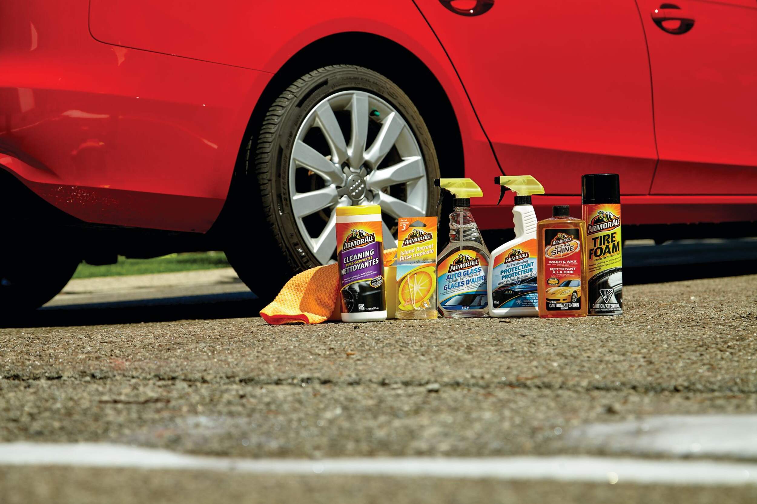 Includes: Wash & Wax (473 ml), Multi-Purpose Cleaner - orange scent, Extreme Tire Shine (650 ml), Protectant Pump (300 ml), Cleaner Liquid Wax, Auto Glass Cleaner (650 ml), and 3 packs of air fresheners