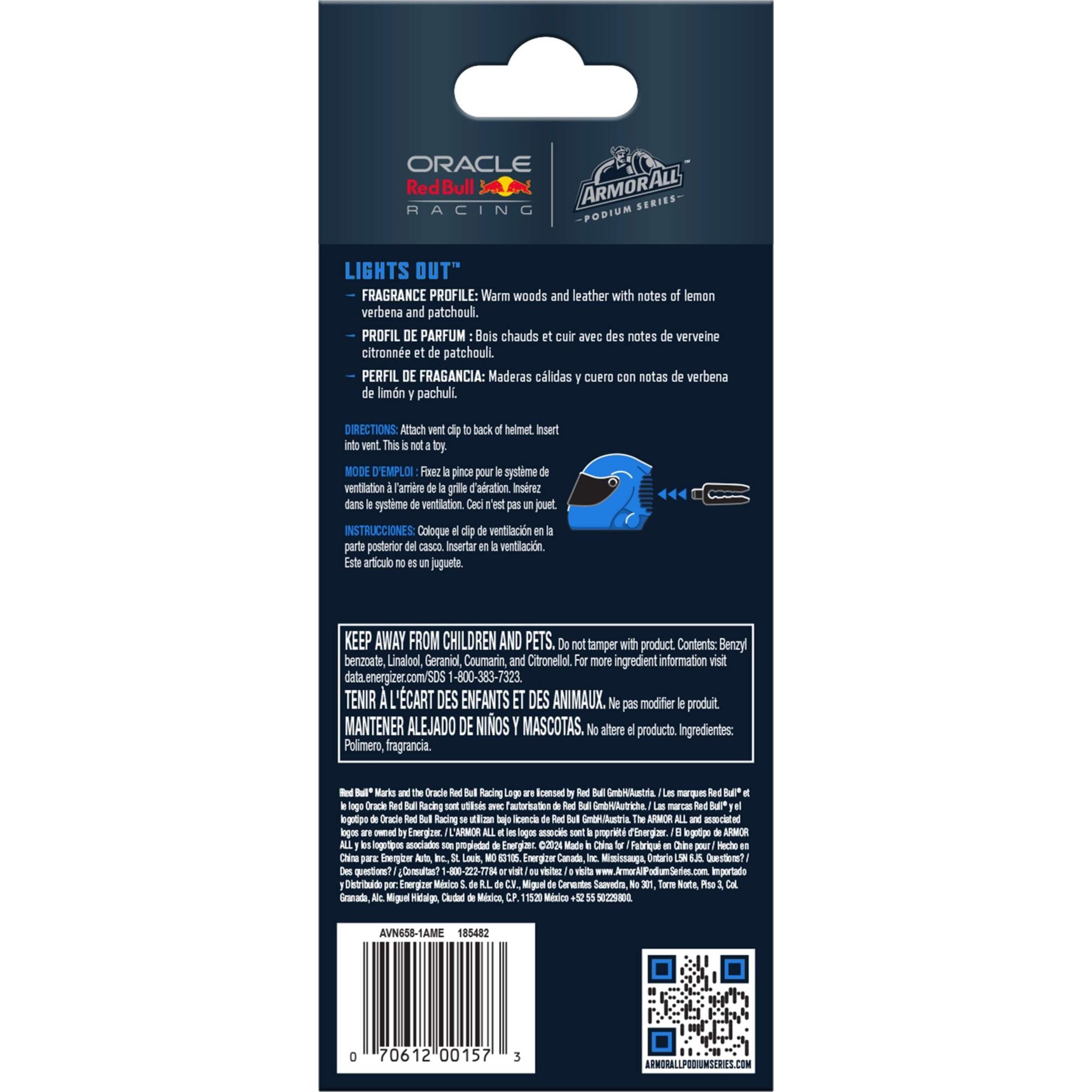 The Armor All Helmet Lights Out Vent Clip Air Freshener delivers when it comes to easy clip-on installation. This licensed Armor All x Oracle Red Bull accessory features a stylish 3D shape that resembles a racing helmet and provides a fresh, invigorating scent experience. With its long-lasting scent and racing-inspired design, this air freshener provides a convenient way to add a refreshing touch to your vehicle's interior.