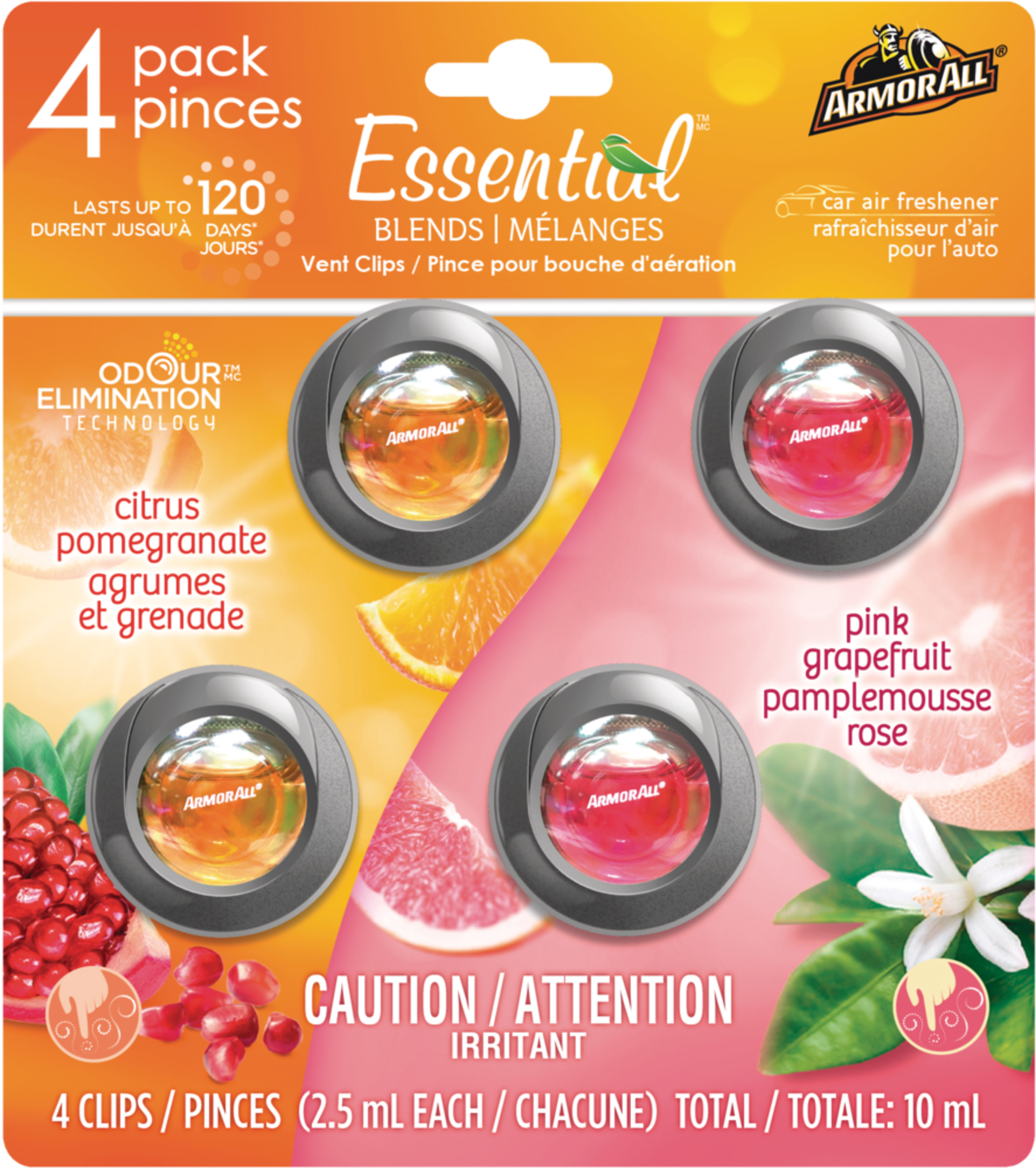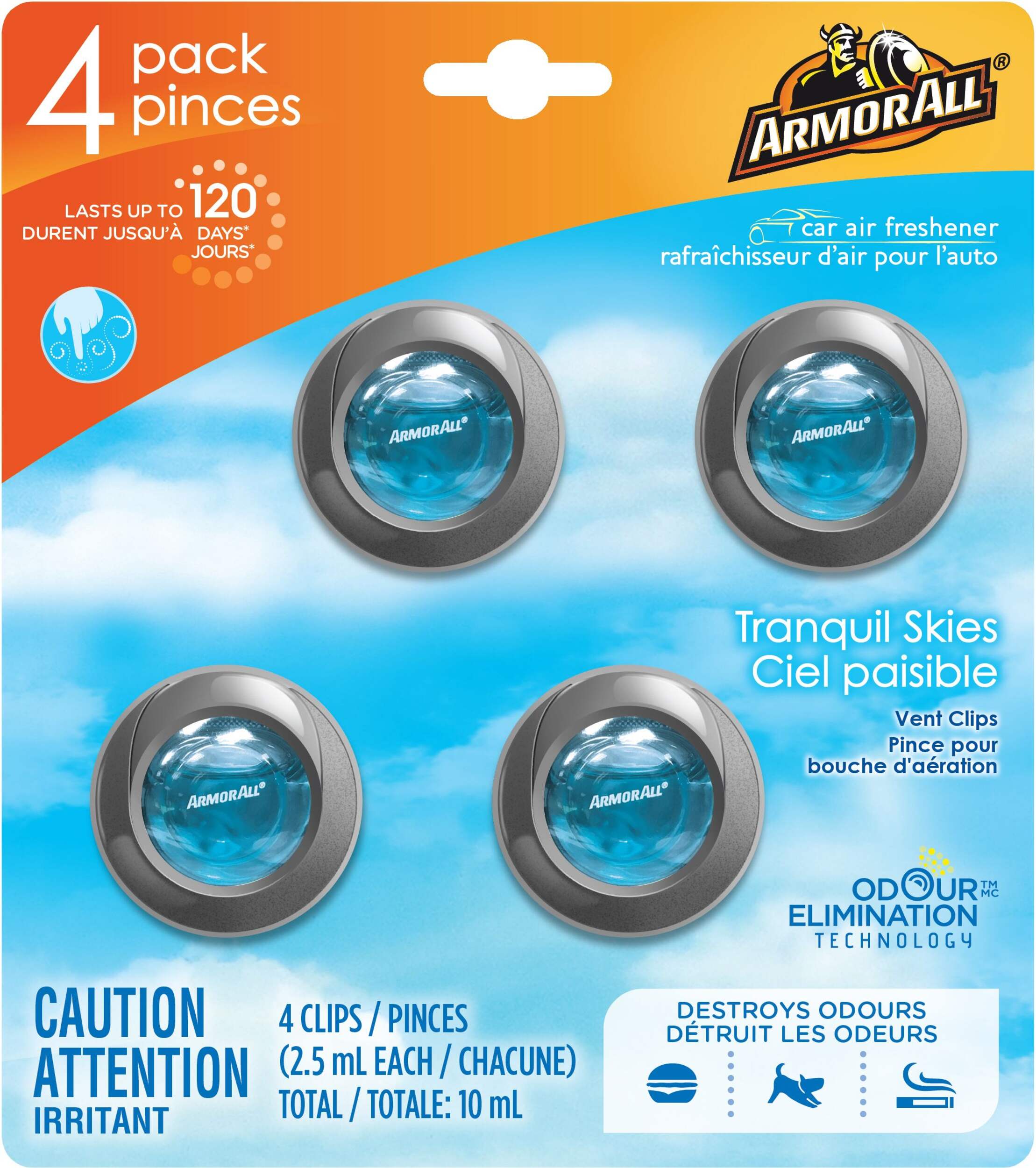 Introducing new Armor All FRESH fx Car Air Freshener Vent Sticks with Odor Elimination Technology. Odors are destroyed providing a refreshing burst of fragrance to match your scent preference. The Tranquil Skies scent is fresh and airy, like a fresh breeze rushing through your car. Notes of apple, freesia and lush greens combine to bring forth a crisp, yet relaxing scent. Each vent stick in the 4-pack package lasts approximately 1 week. Keep unused vent sticks in resealable package to maintain fragrance.