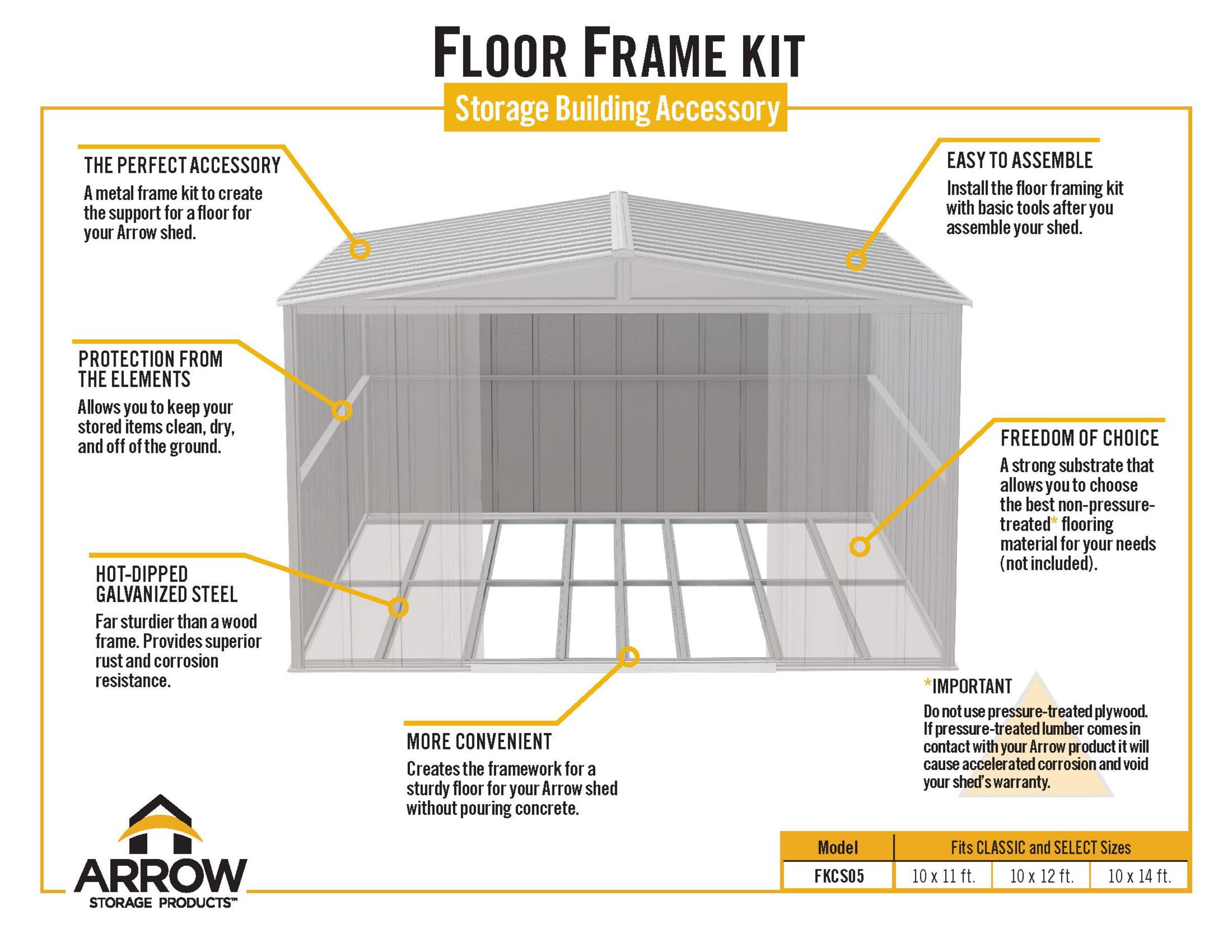 Arrow Grey Floor Frame Kits for Arrow Classic Sheds 10x11, 10x12 and 10x14 ft. and Arrow Select Sheds 10x11, 10x12 and 10x14 ft. are the perfect accessory to your new shed. They provide the galvanized metal framework foundation to add a strong floor if your shed is placed on grass, gravel, or bare earth. The frame will raise the floor above ground level to help with drainage and help keep your items clean and dry. METAL FRAMING ONLY – Attach plywood to complete your shed floor. Use 5/8” minimum thickness, exterior grade plywood that has a waterproof adhesive.