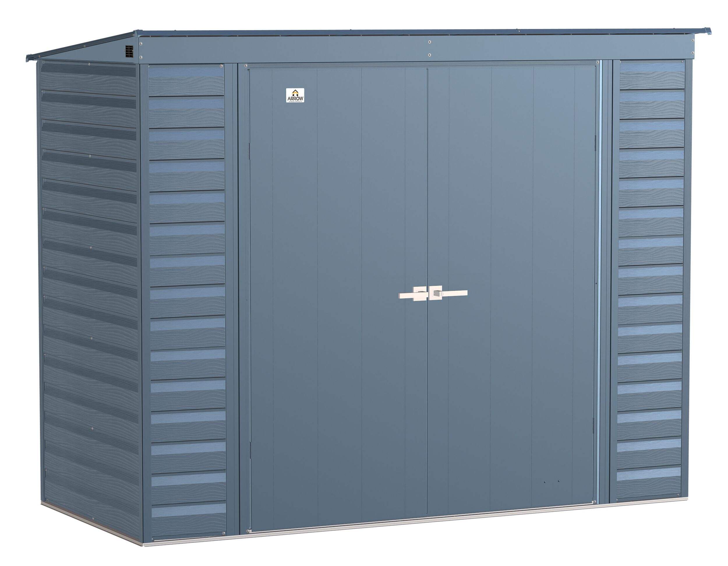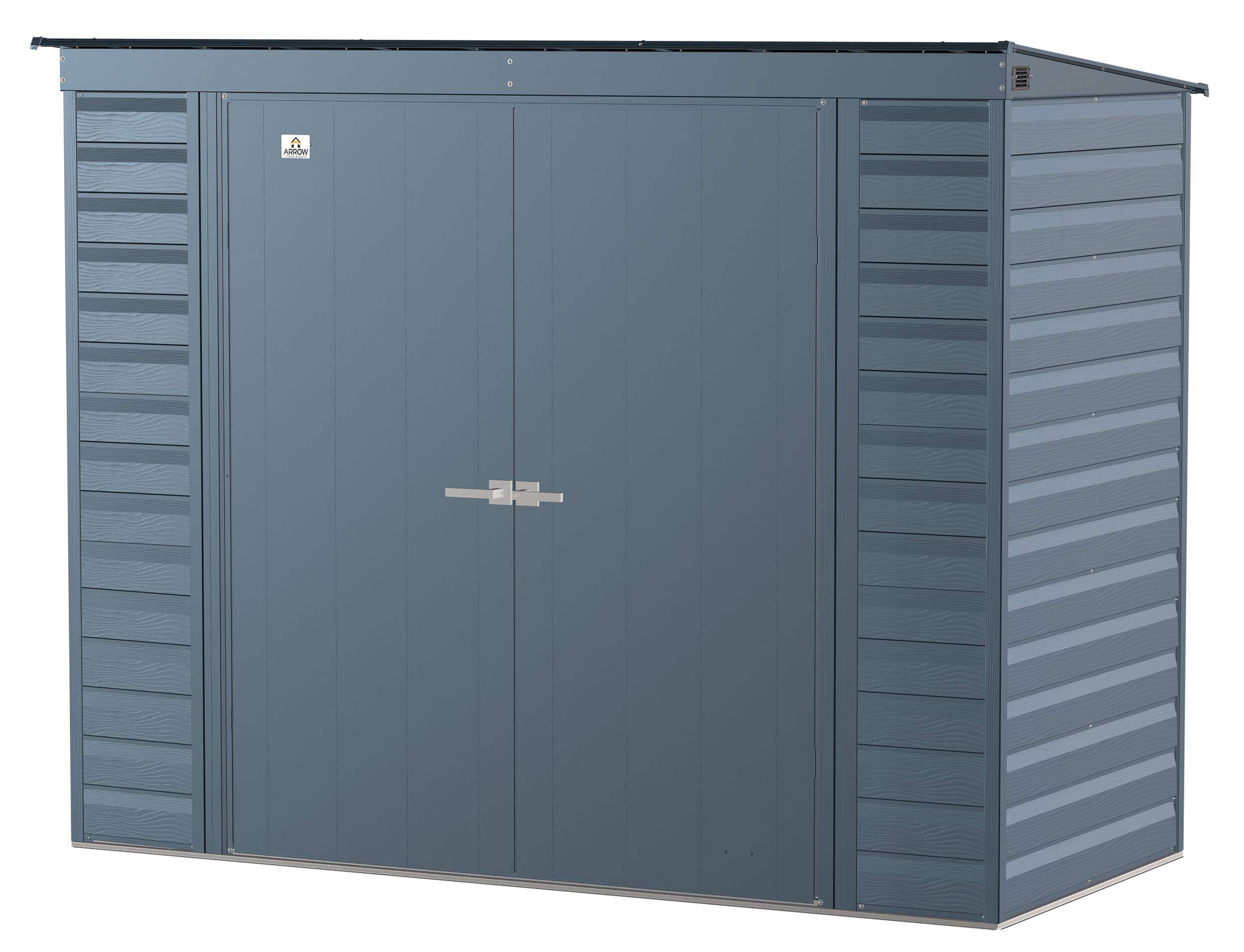 The Arrow Select line of strong, sturdy steel storage sheds is a pleasant addition to your backyard. Made with galvanized steel that is treated to provide long-term protection against corrosion and rust, Arrow Select sheds are engineered to protect your stored items from the elements. Inside, the 71 in. walls provide extra headroom, vertical storage space, and added entryway clearance. That makes it great for storing ladders, rakes, pole saws, and anything you want to pile high. The Arrow Select line also has a high gable roof to prevent pooling of rainwater and debris, built-in air vents for better circulation, and locking door handles for security. It also has a smooth, strong Valspar paint finish that protects it from the elements and gives the steel extra protection from rust and corrosion.