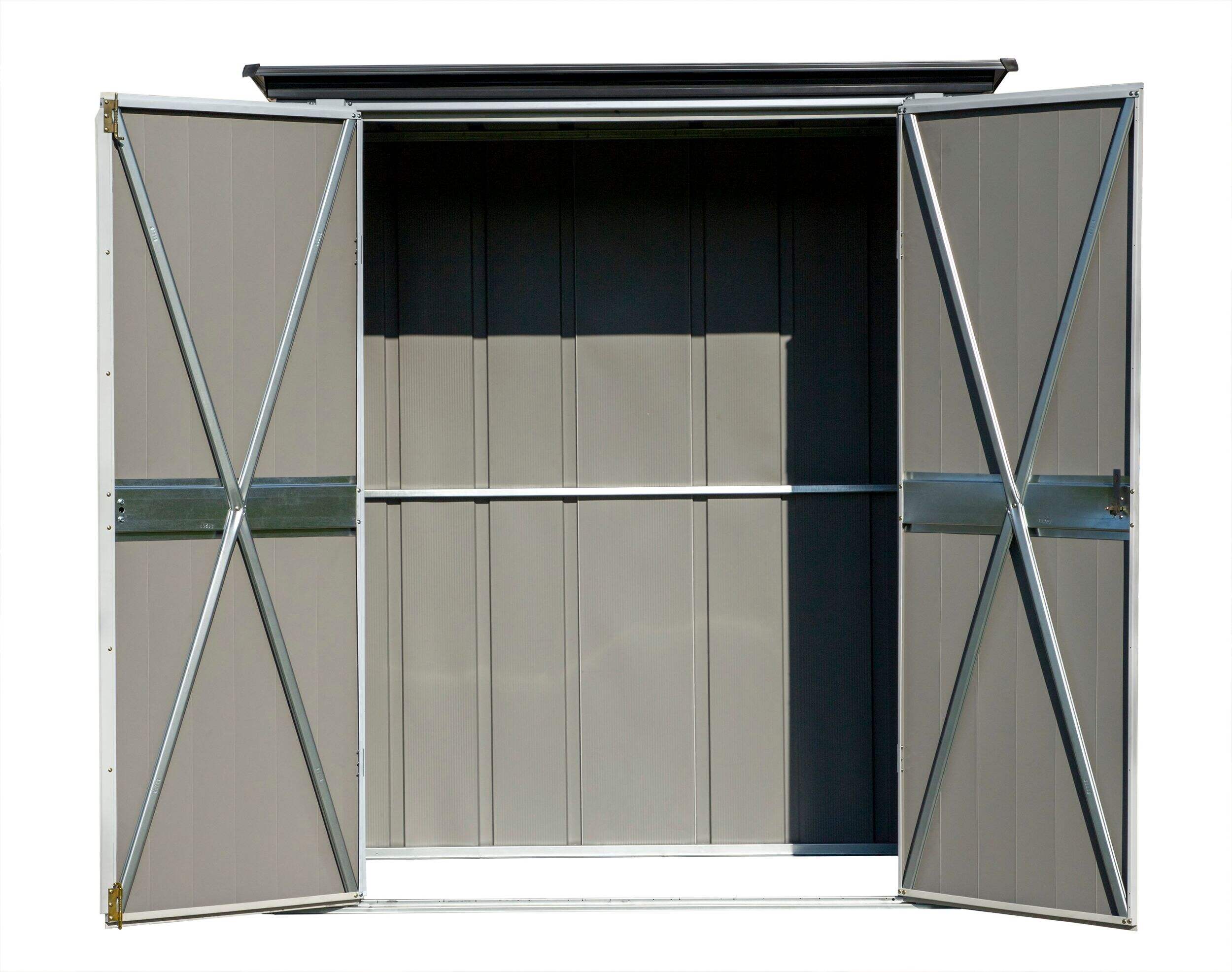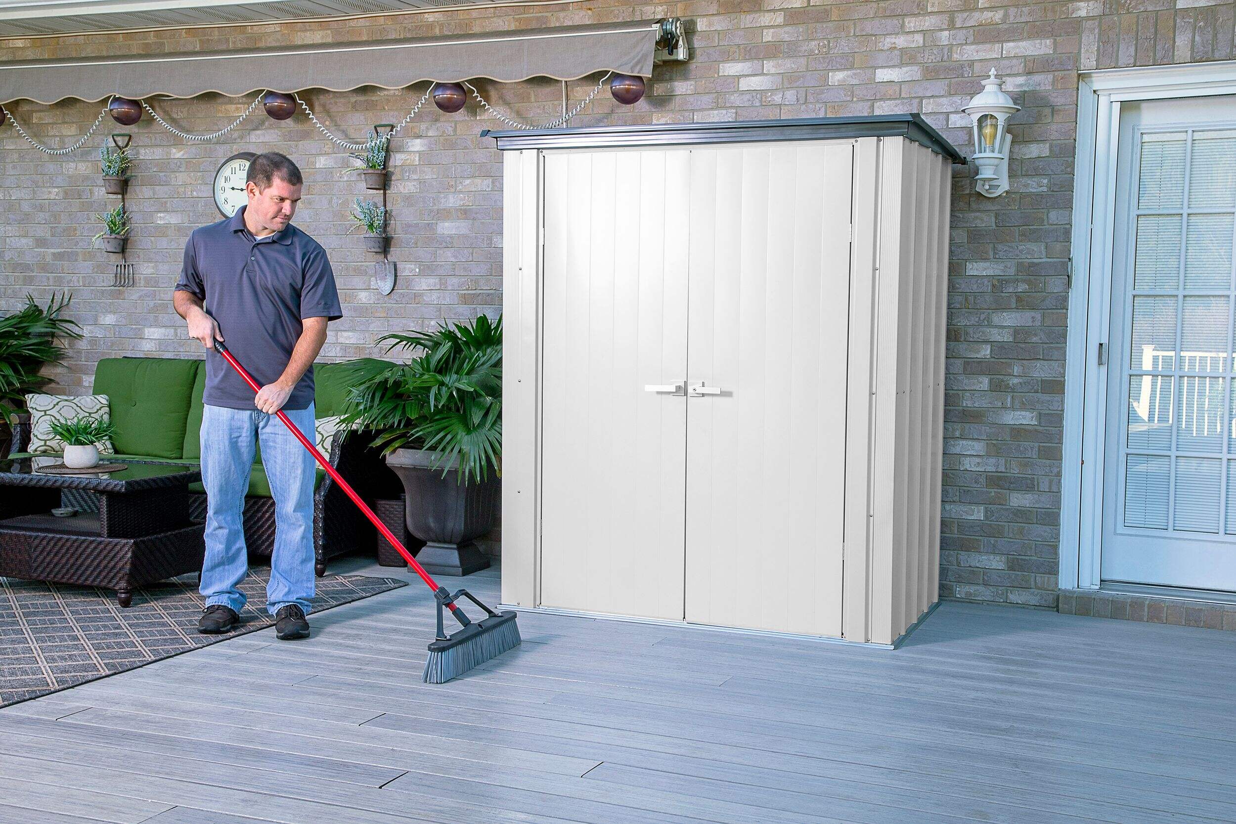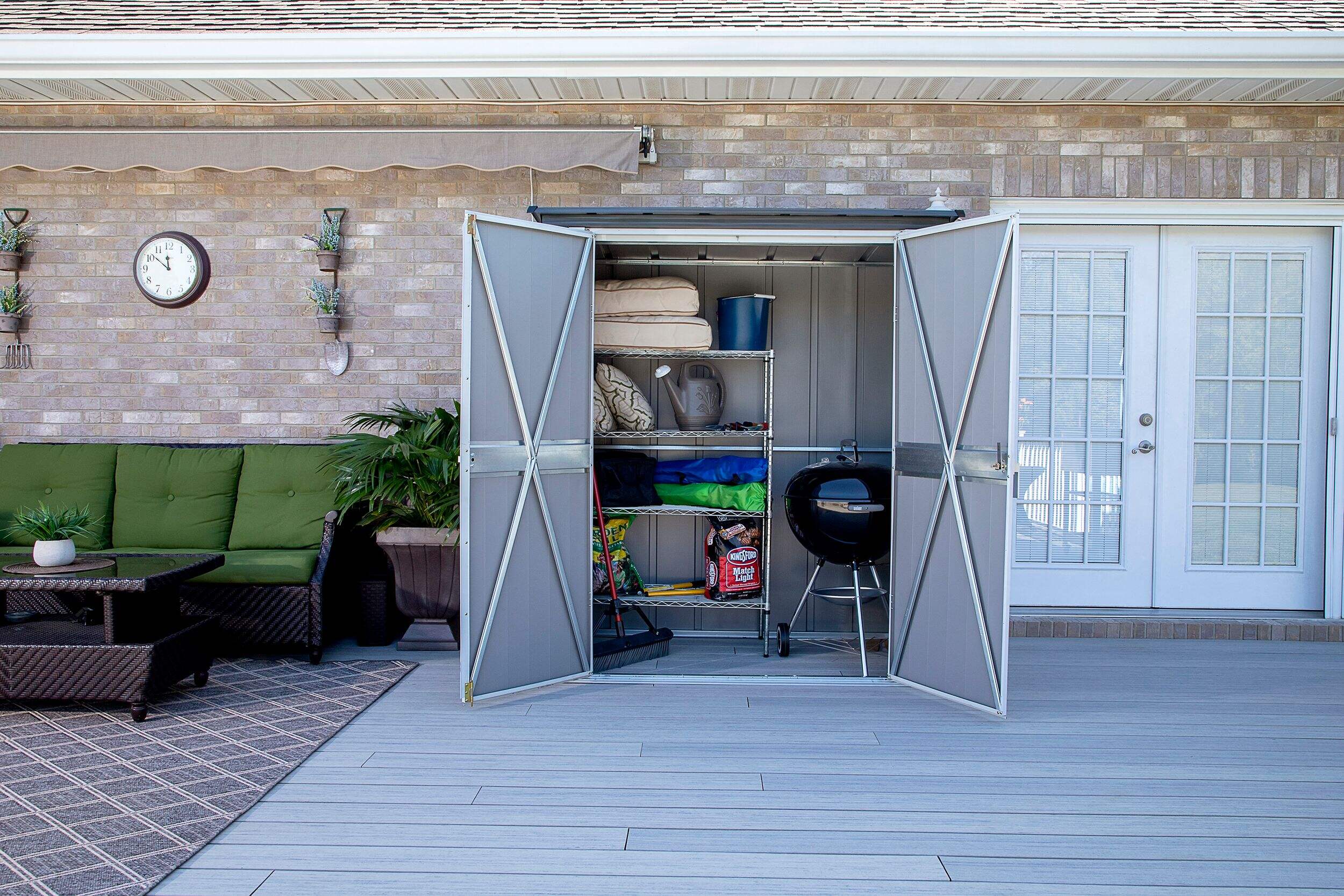 Arrow Spacemaker Patio Steel Storage Shed is the perfect size to fit any patio, deck, or small backyard space