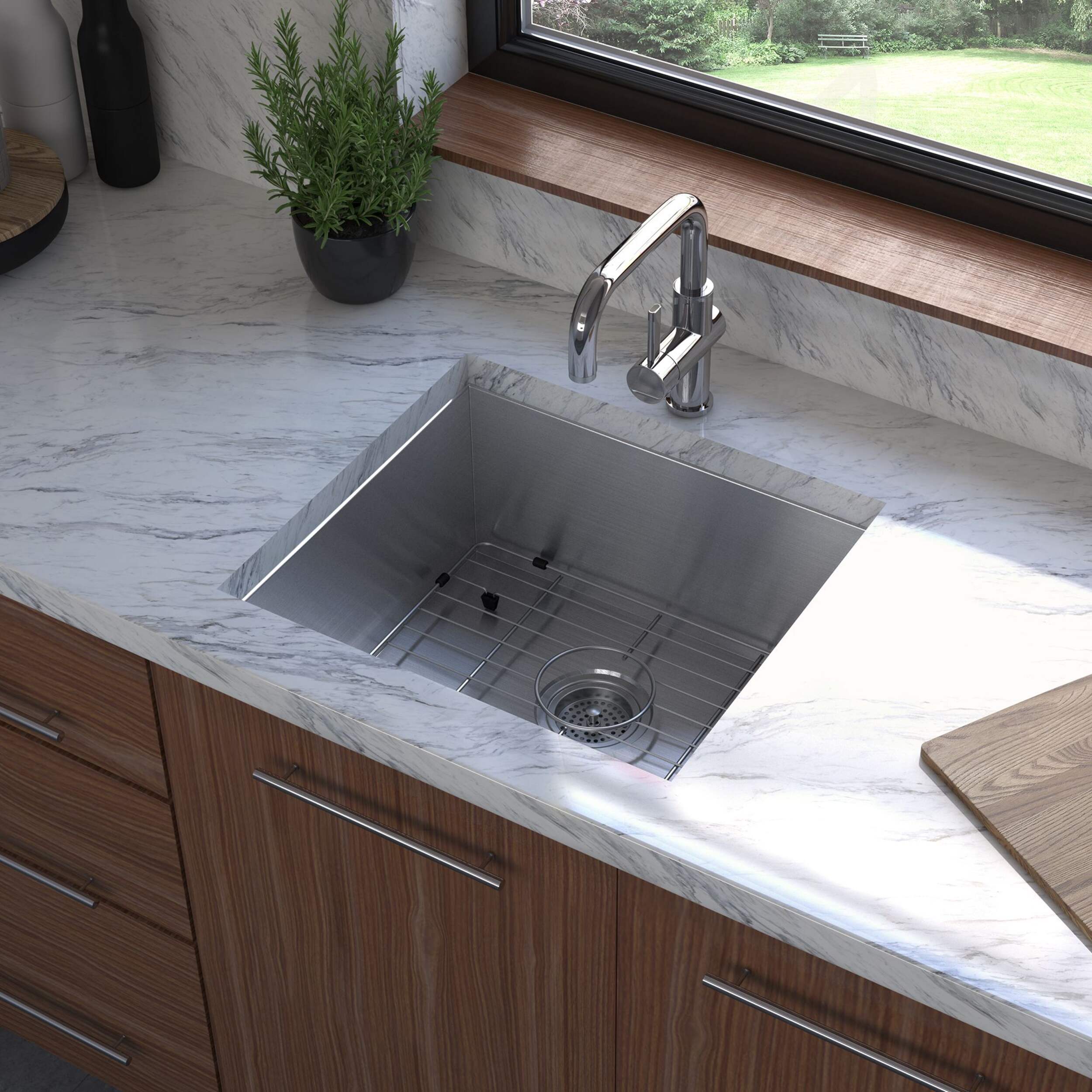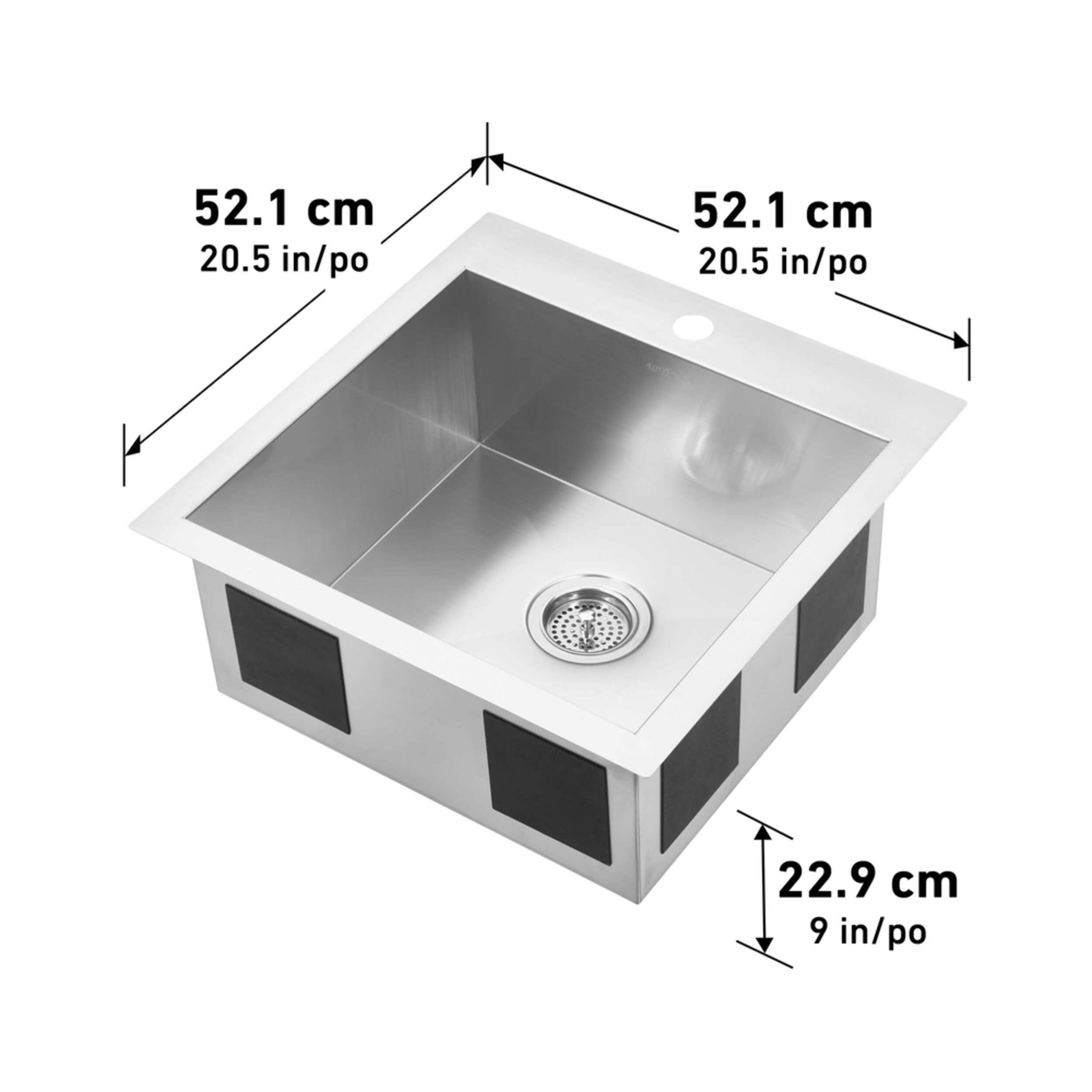 Modernize your kitchen with this handmade stainless steel sink. This single-bowl model is deep and sturdy providing all the space you need to maneuver dishes with ease. Its square shape leaves you with more counter space. Additionally, you have the option to undermount it. This sink is rust-resistant, has a brushed satin finish and is durable and functional. It also comes with a strainer and grid. Its silver color adds a touch of shine to your kitchen, making it both an attractive and reliable choice.