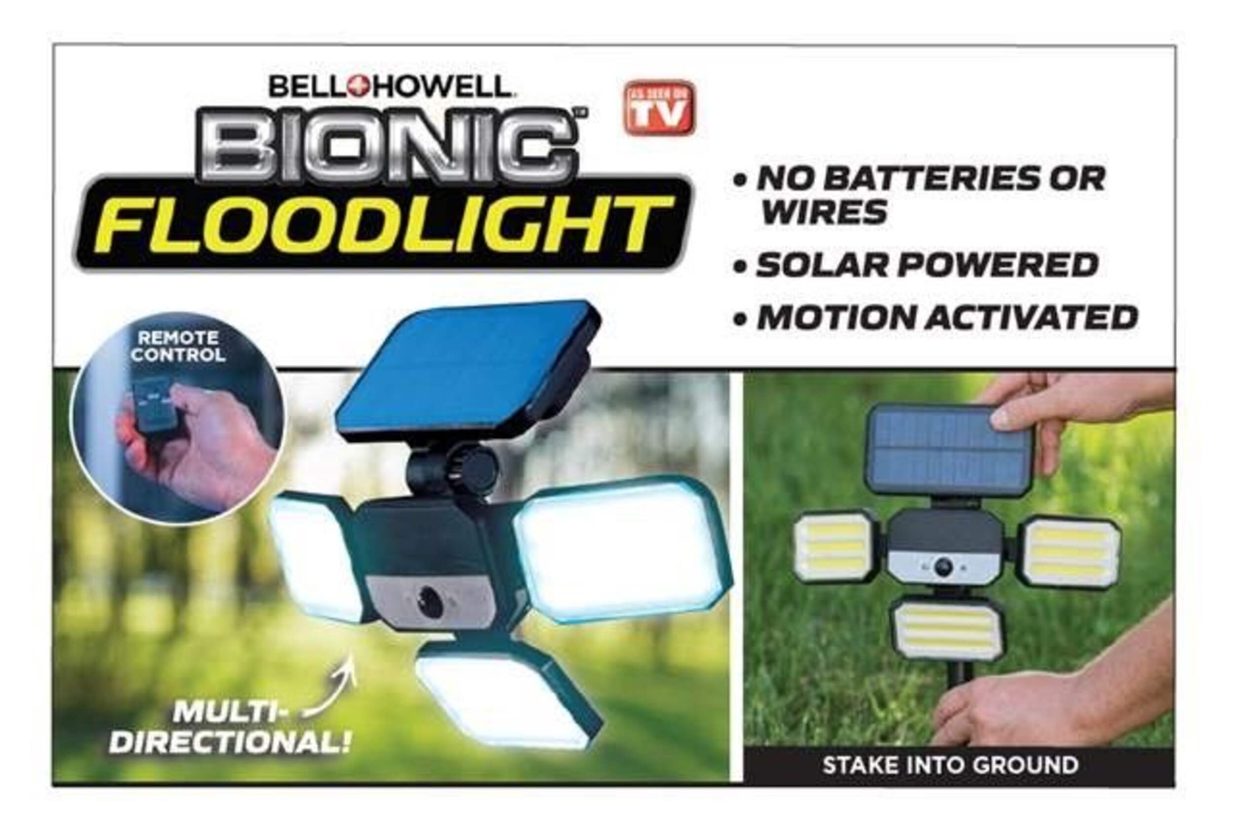 Upgrade your outdoor lighting with the As Seen On TV Bell & Howell Bionic Solar Powered Floodlight, a hassle-free lighting solution. This floodlight provides powerful, bright illumination whenever motion is detected. Powered entirely by solar energy, the Bionic Floodlight allows for simple and cost-effective installation. This floodlight is designed to withstand outdoor elements year-round. Say goodbye to outdated floodlights and bring home the Bionic Floodlight, a perfect combination of cutting-edge technology and eco-conscious design.