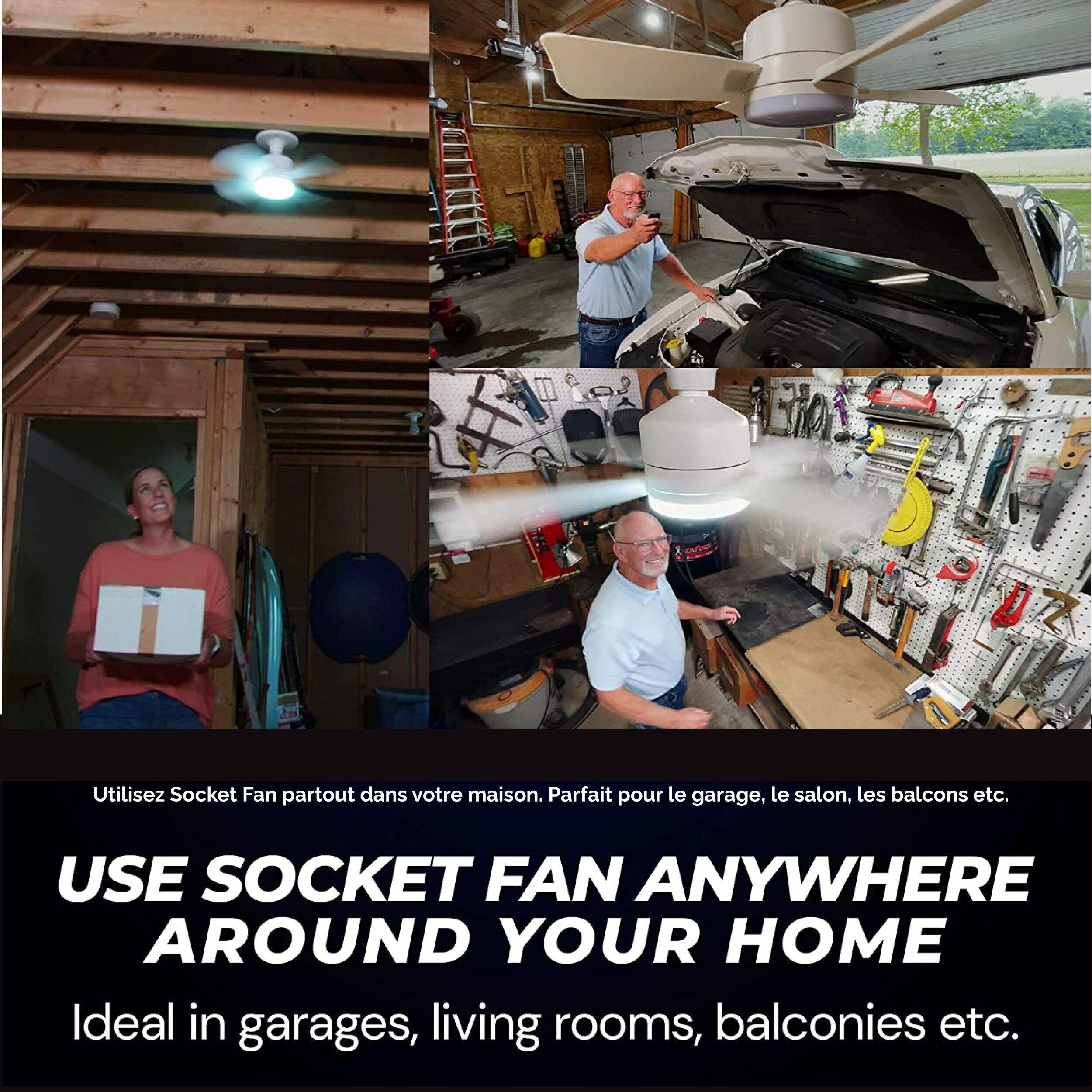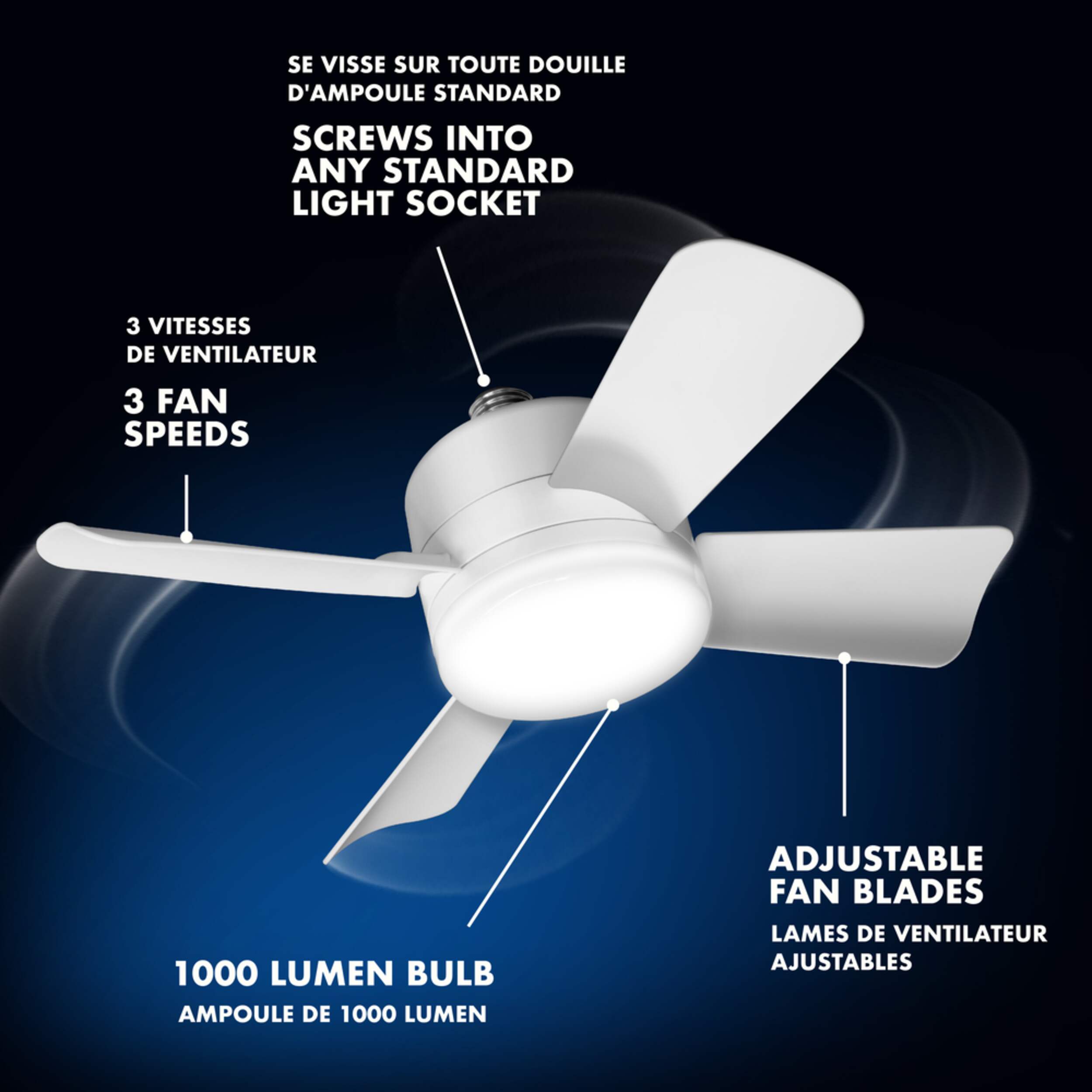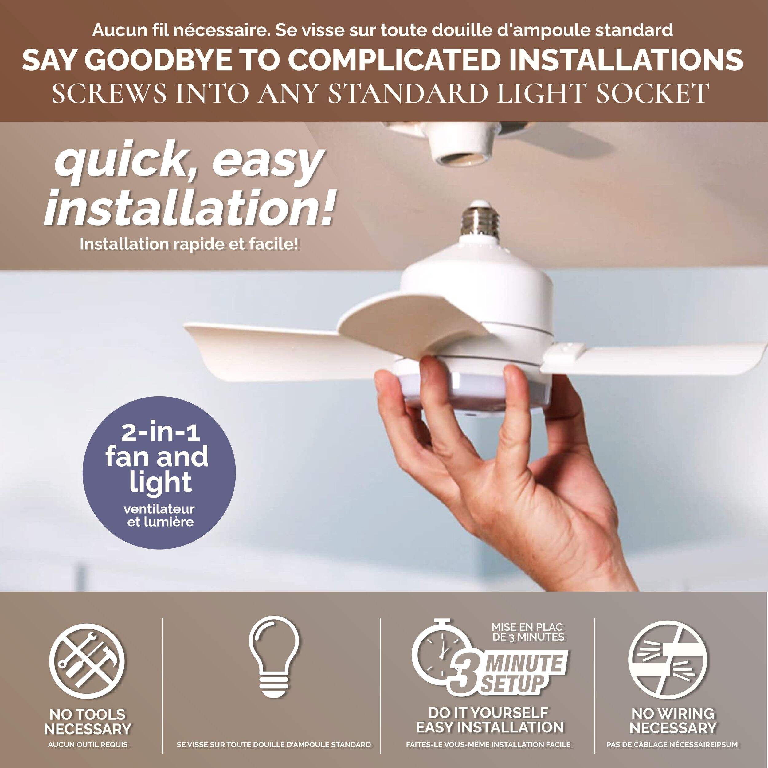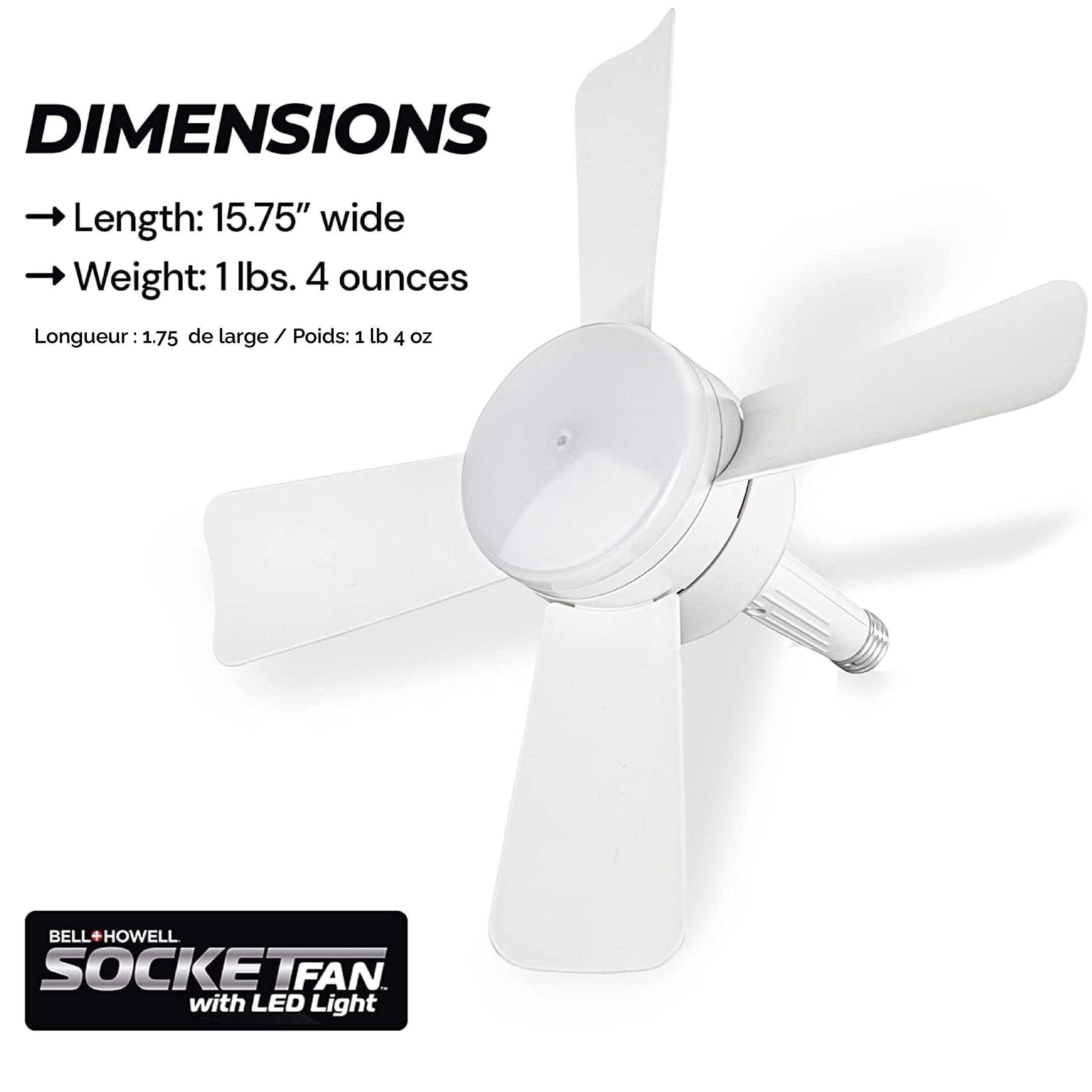 Keep your room functional with this innovative As Seen On TV Bell & Howell Socket Fan Light with Remote. Made for easy installation, this fan and light can be used together or individually to help ensure your garage, balcony, living room, office and more gets needed air circulation and illumination. Remote controlled and featuring different brightness levels and fan speeds, this fan light is easy to adjust to suit your needs at any moment.