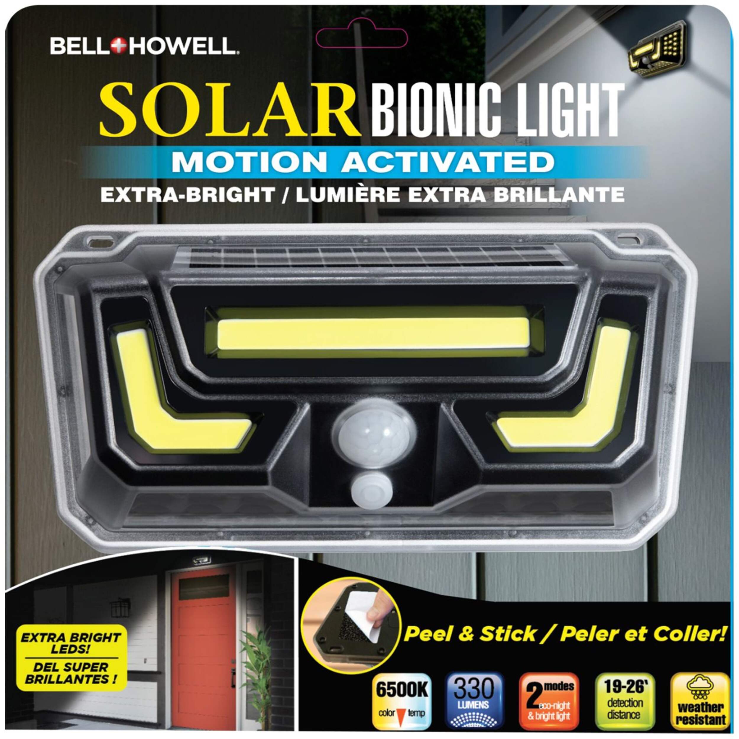 Enjoy bright, hands-free outdoor lighting when you need it most with the As Seen On TV Bell + Howell Solar Bionic Light. This wireless fixture uses energy harvested from the sun during the day to run its 50 LED bulbs, providing 40 times the brightness of standard solar lamps. The motion sensor activates the eco-friendly light automatically when movement is detected up to 26-ft away, illuminating pathways, staircases and other areas for hands-free convenience. Made from weather-resistant materials, the adhesive mount makes installation simple with no tools or electrician needed – just peel and stick.